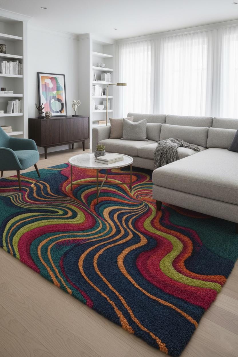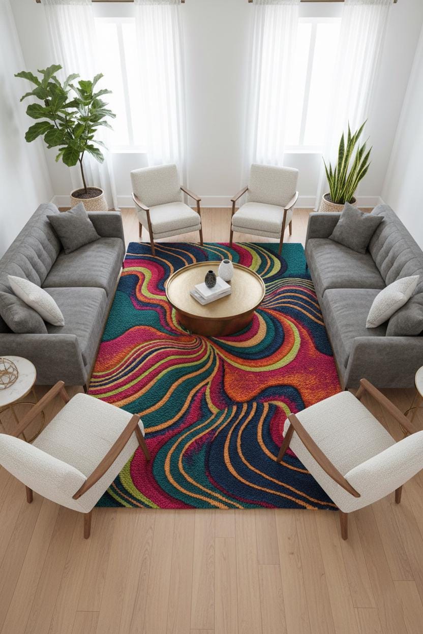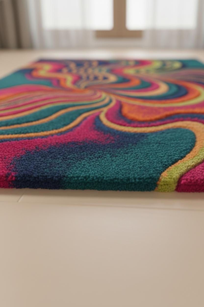 Bring bold movement and artistic energy into your space with this Colorful Abstract Swirl Area Rug. Designed with flowing curves and vibrant shades of teal, pink, mustard, orange, and navy, this rug instantly becomes the focal point of any room. Its modern abstract pattern adds depth, texture, and personality to both contemporary and eclectic interiors.