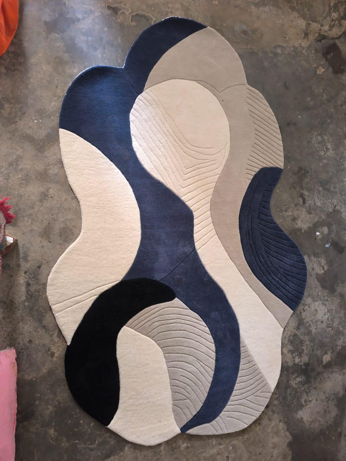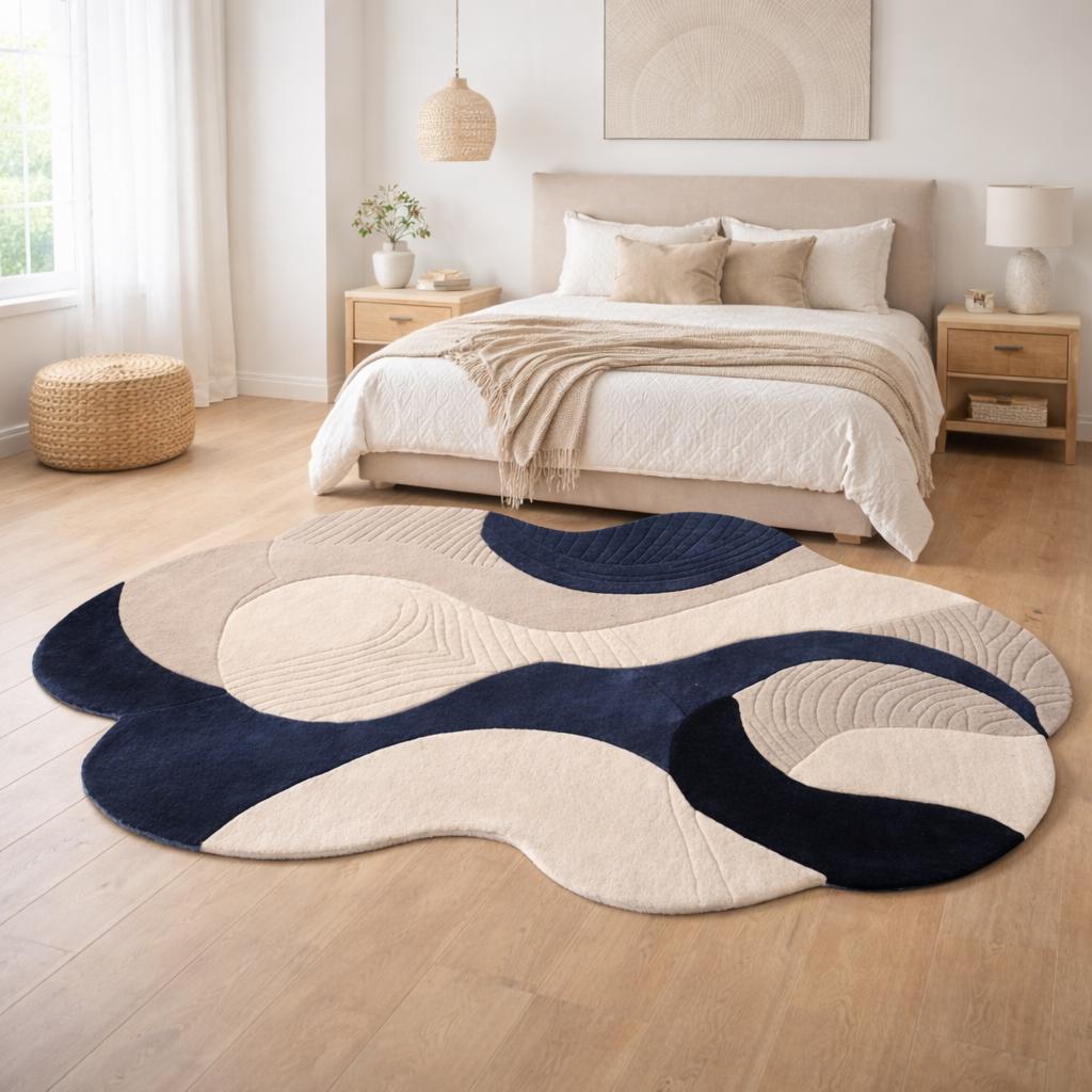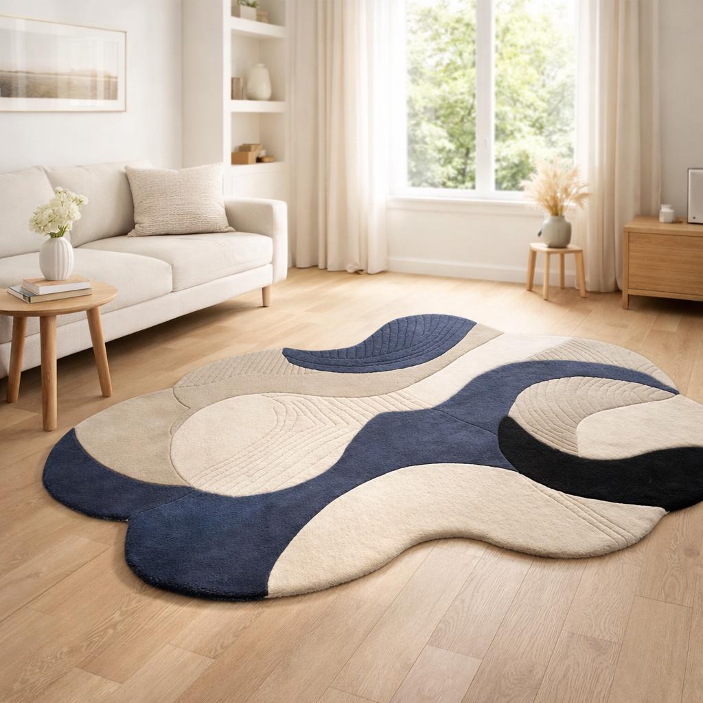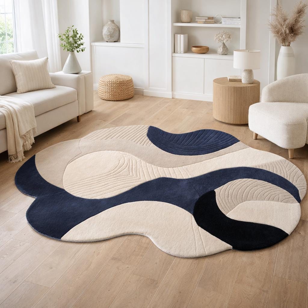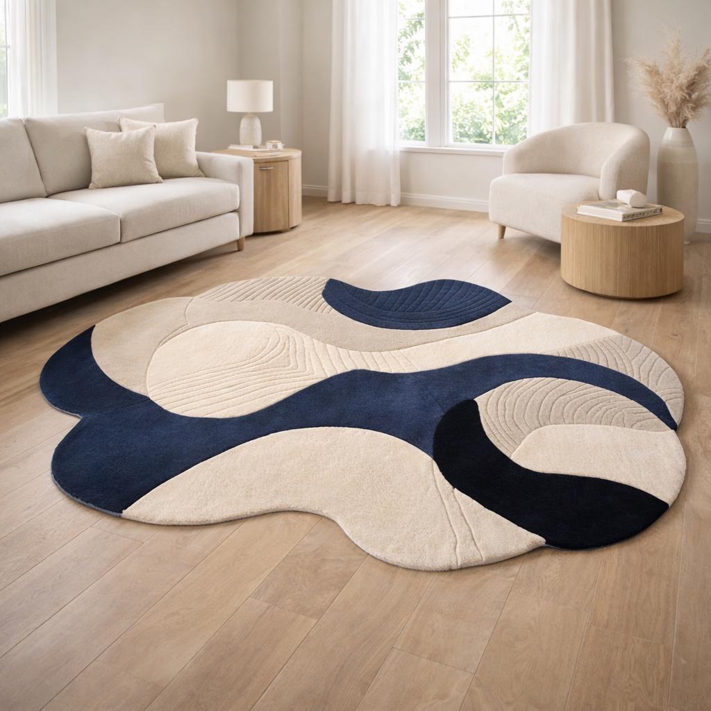 Upgrade your home with this modern abstract area rug, designed to bring a calm, stylish, and premium look to any space. Featuring a flowing wave pattern in navy blue and cream, this rug blends perfectly with contemporary, minimalist, and modern interiors.