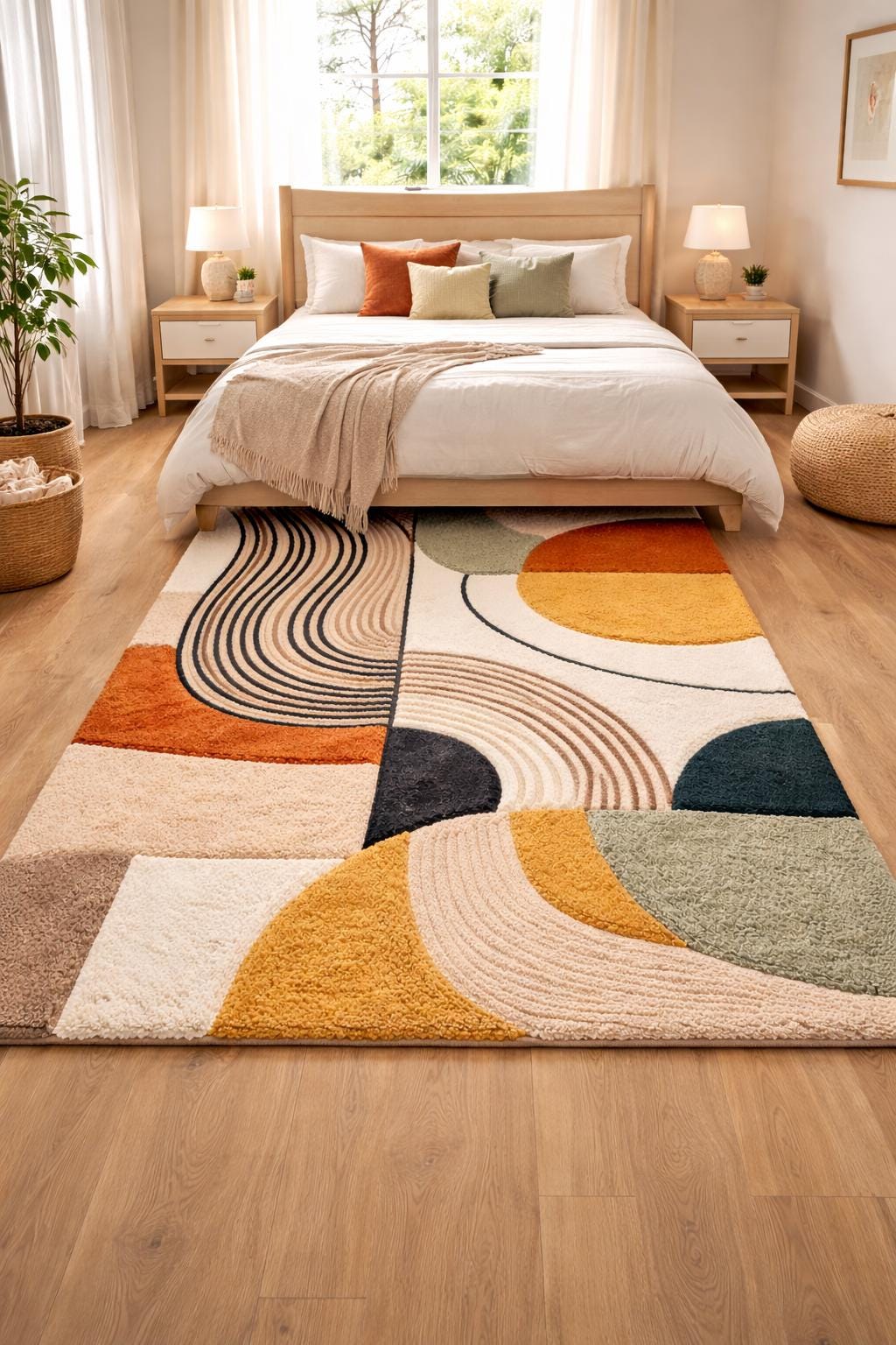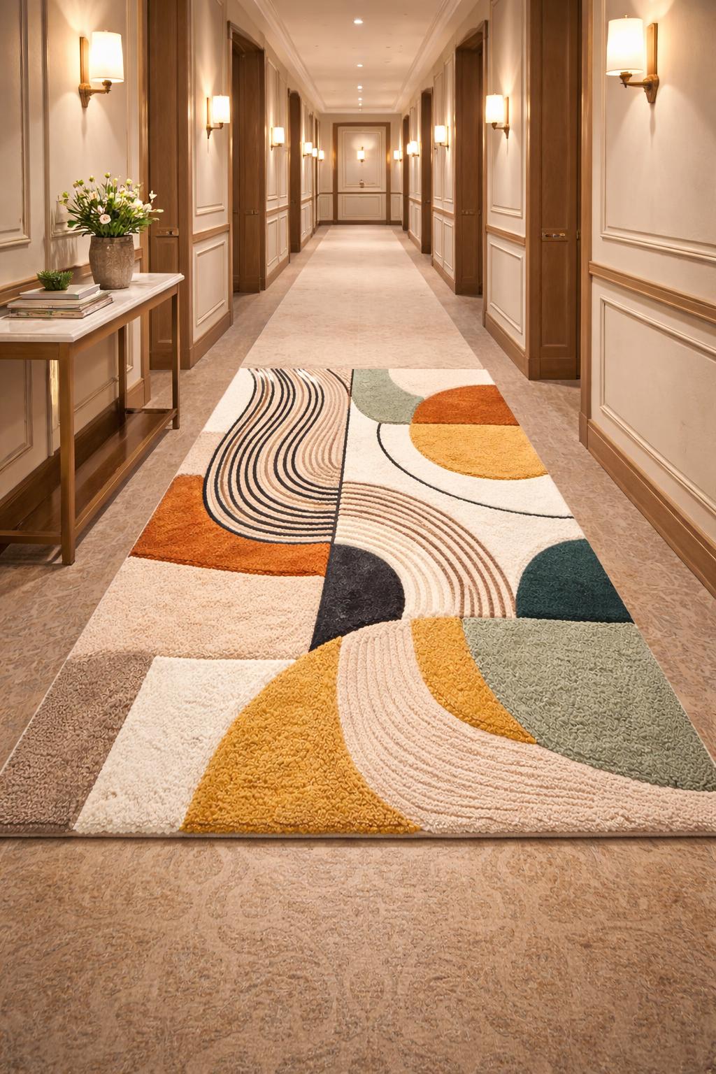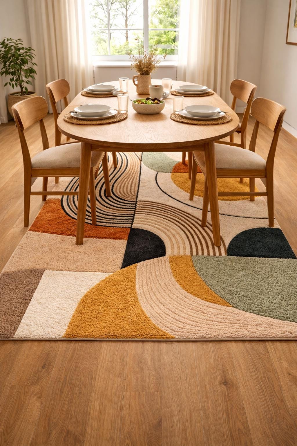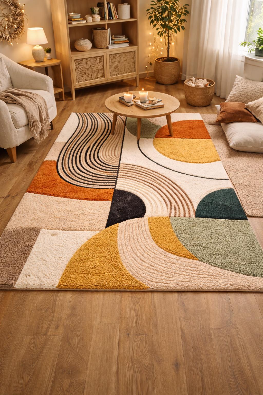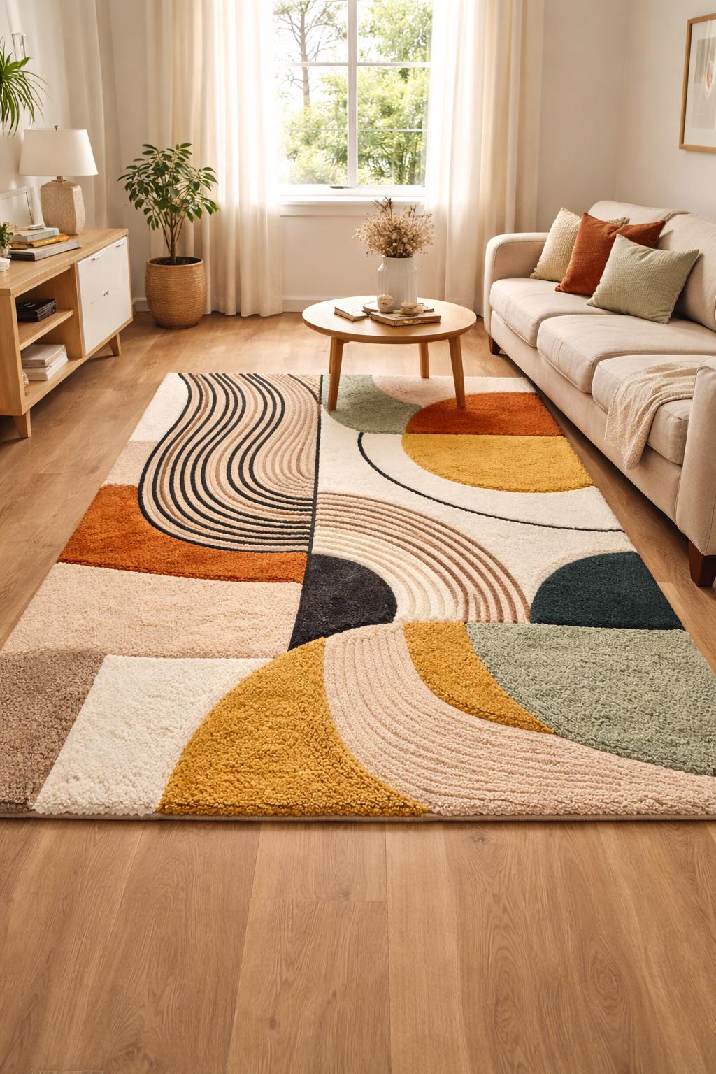 Upgrade your home with this Modern Abstract Area Rug, designed to bring warmth, balance, and artistic style into your living or dining space. Featuring a soft geometric pattern with earthy tones of mustard, sage green, cream, beige, and charcoal, this rug blends modern design with cozy comfort.