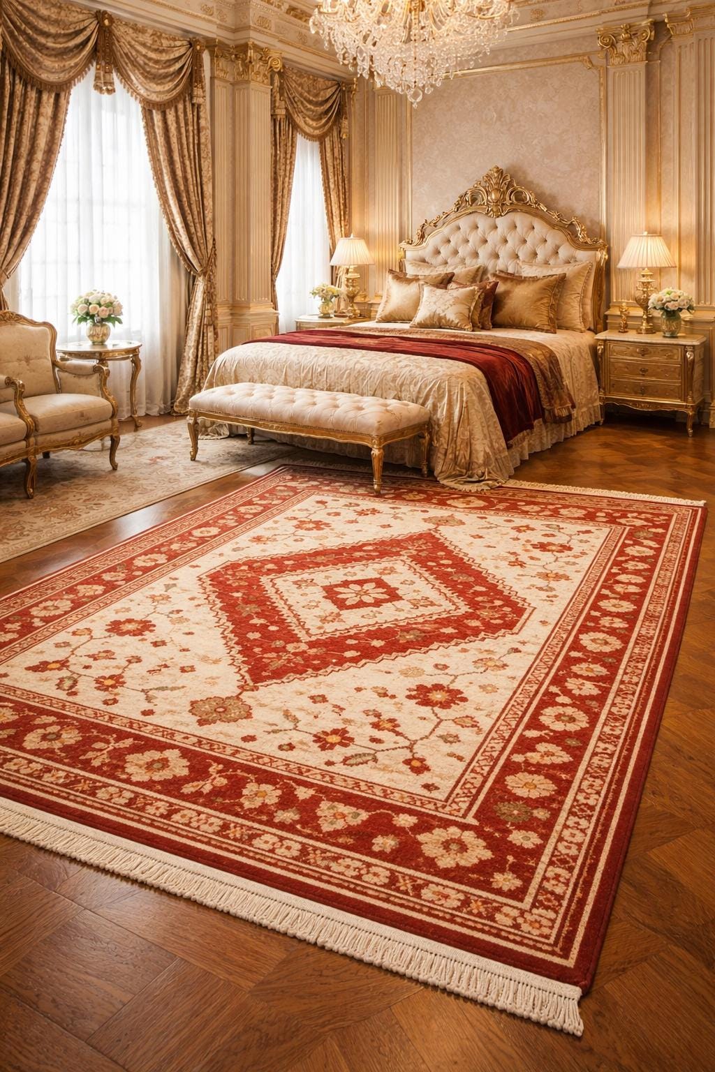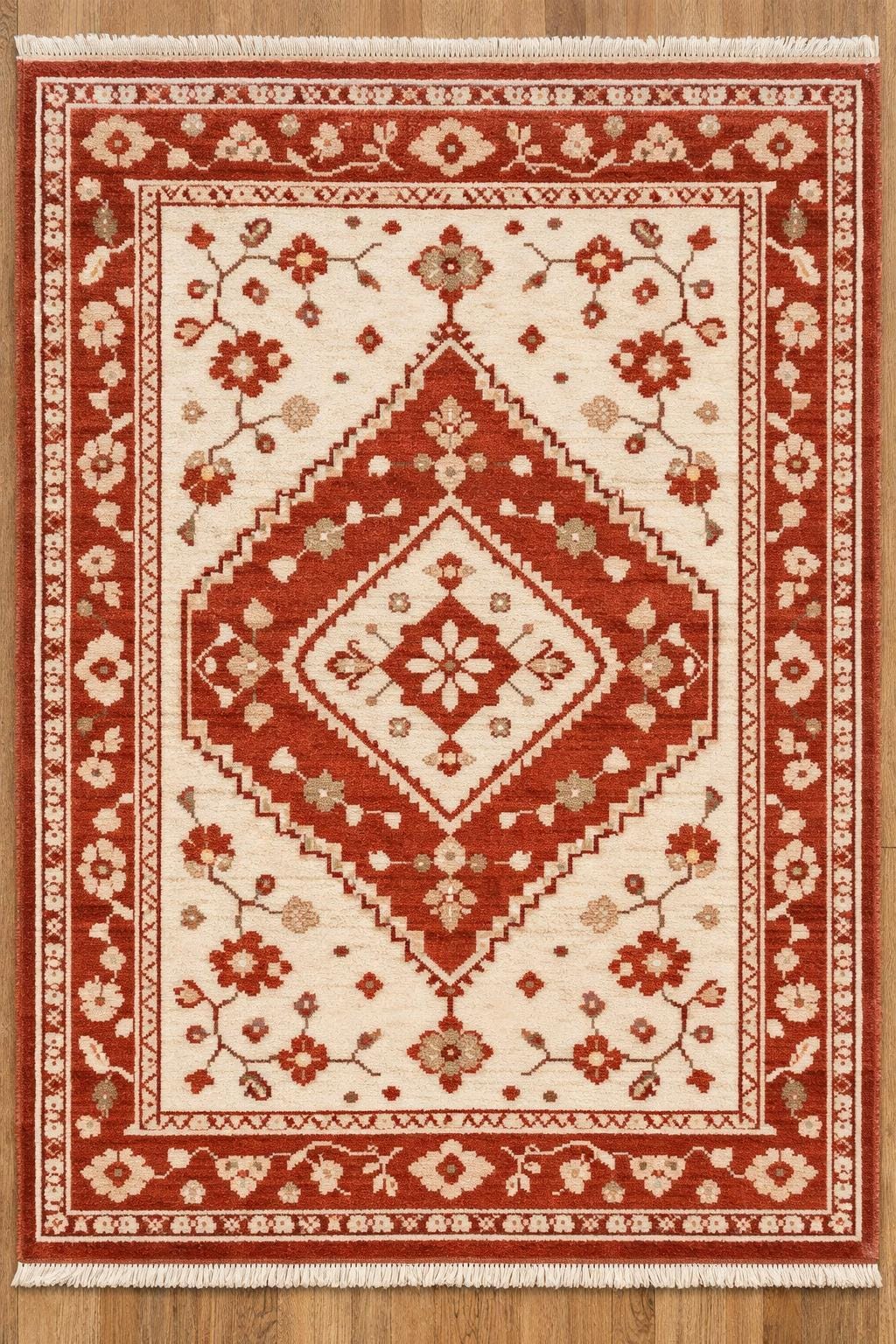 Bring timeless elegance and royal charm into your space with this hand knotted luxury carpet, inspired by classic Persian designs. Crafted by skilled artisans, this rug features intricate floral motifs in rich red and ivory tones, making it a statement piece for any elegant interior.