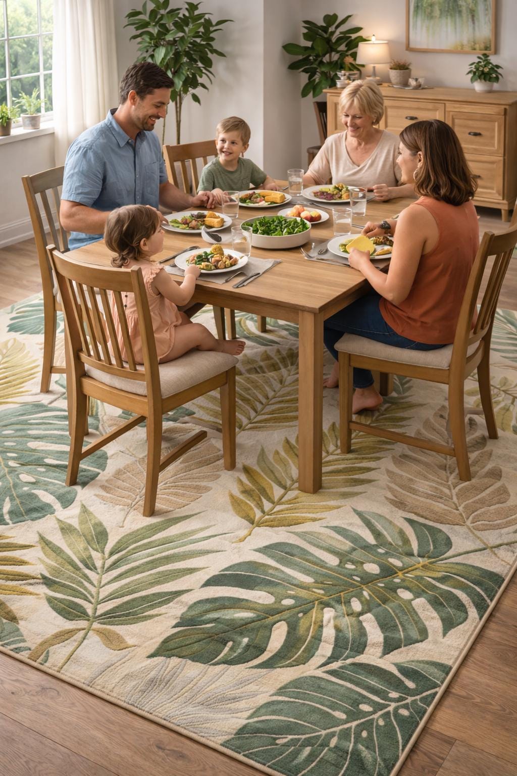 Hand-tufted using premium-quality wool, this rug offers a plush texture, long-lasting durability, and a warm underfoot feel. The detailed leaf pattern adds depth and movement, making it a perfect statement piece for modern, classic, or resort-style interiors.