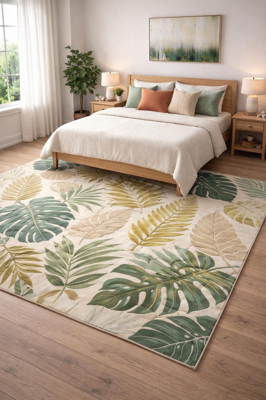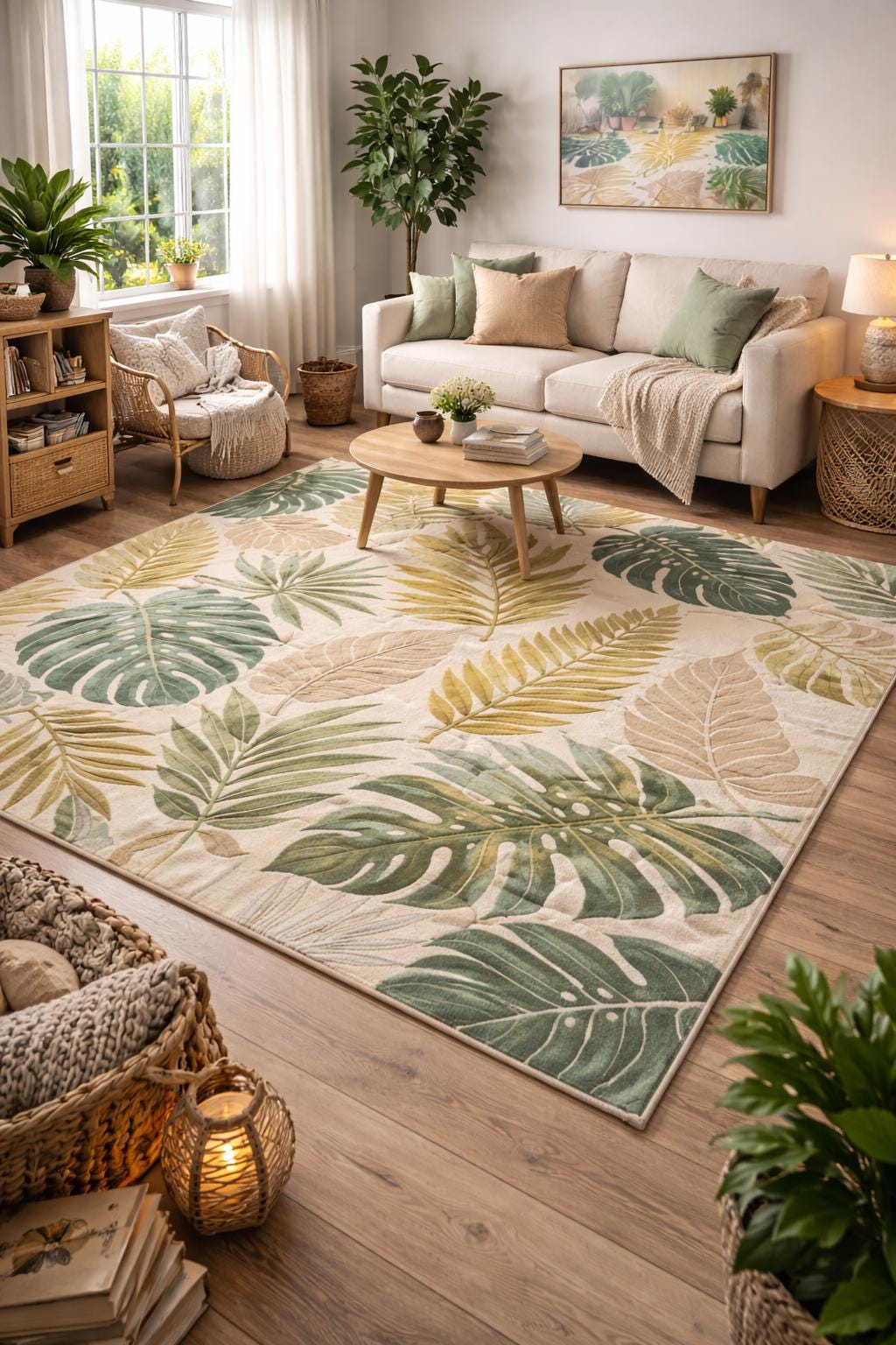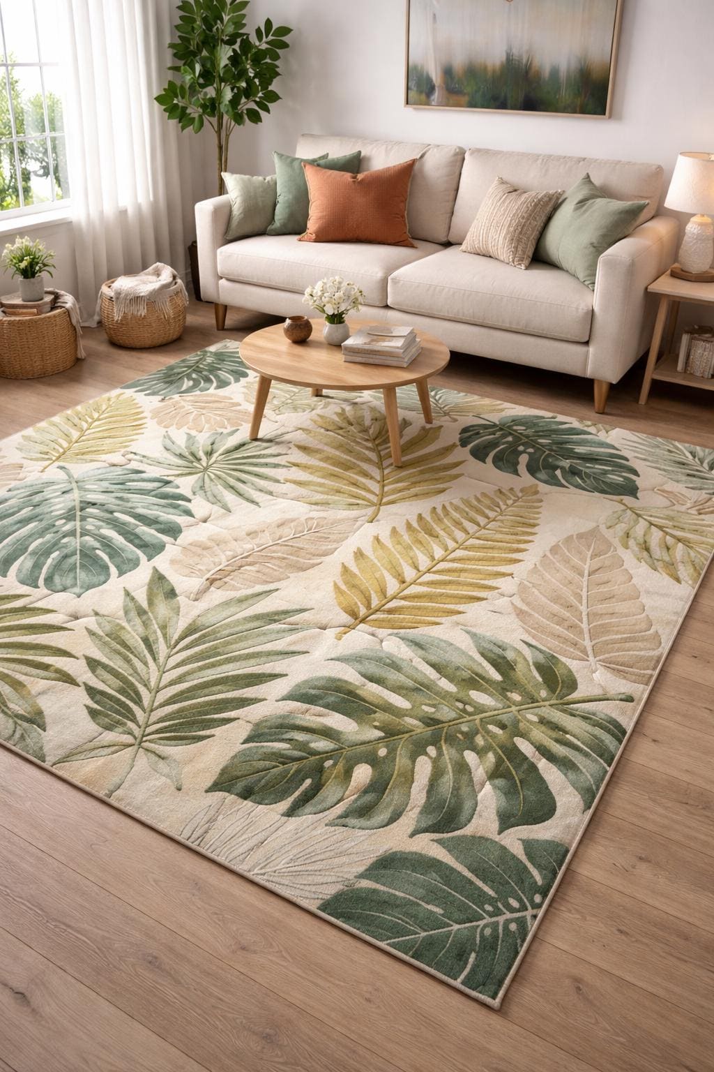 Bring calm, nature-inspired elegance into your home with this botanical leaf hand-tufted wool rug. Designed with flowing tropical leaves in soothing shades of green, sage, beige, and soft gold, this carpet instantly elevates any space with a fresh yet luxurious look.
