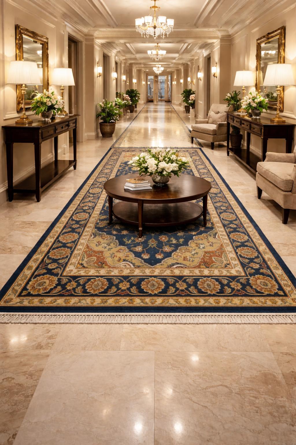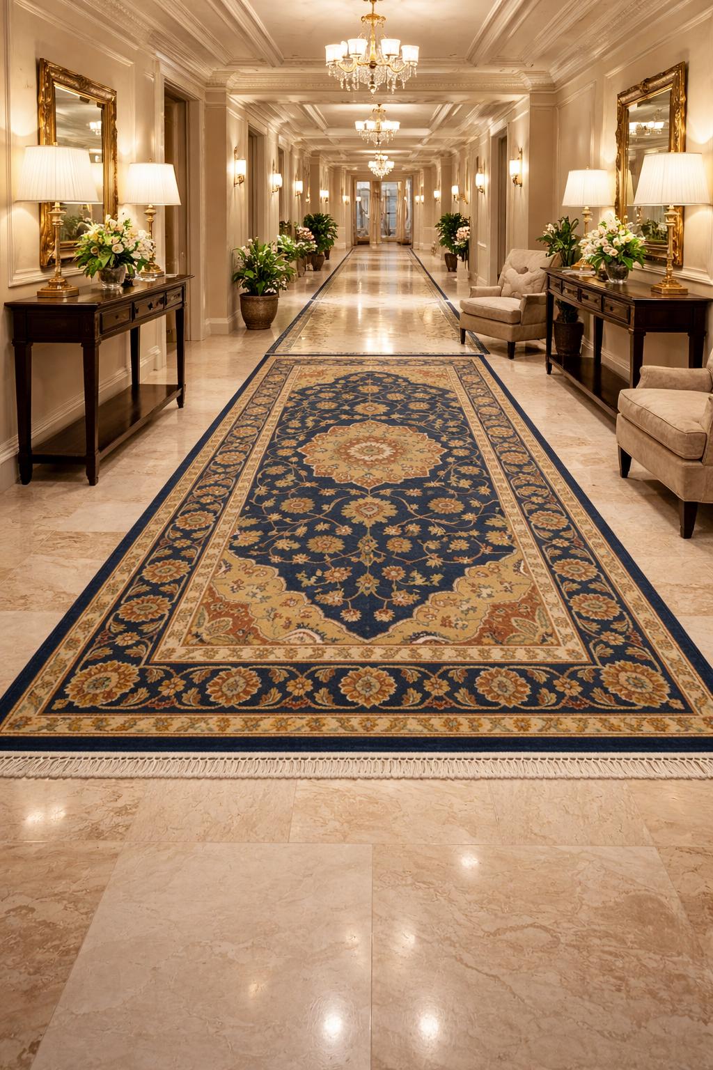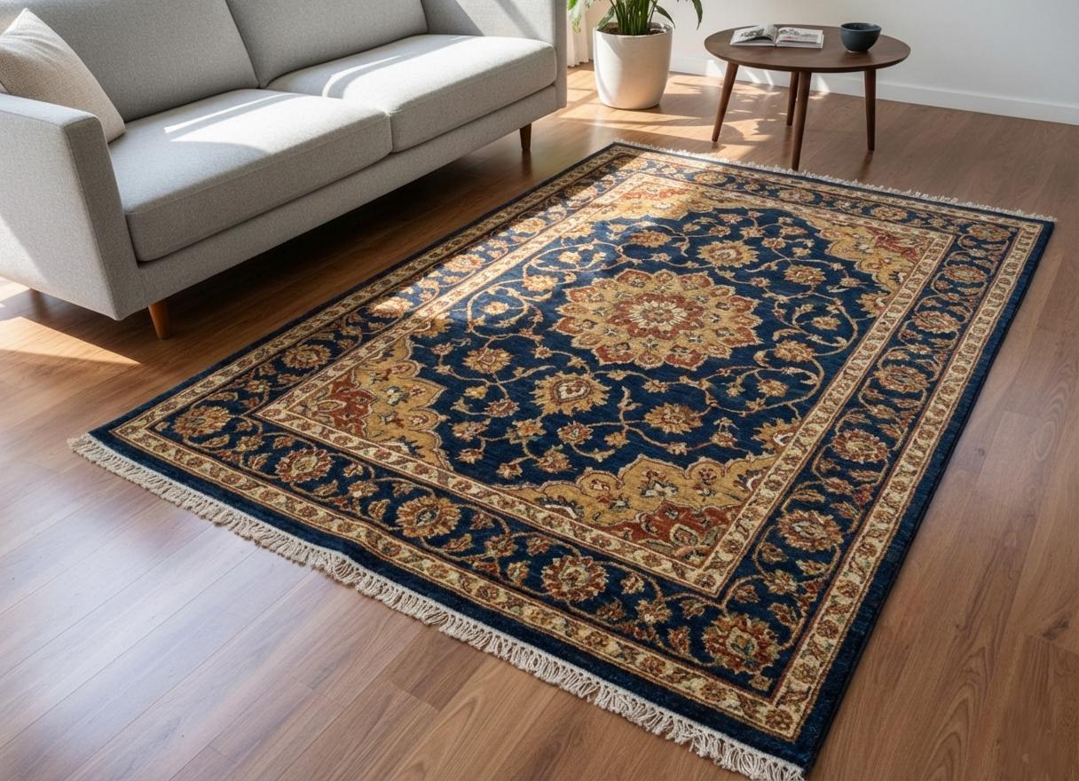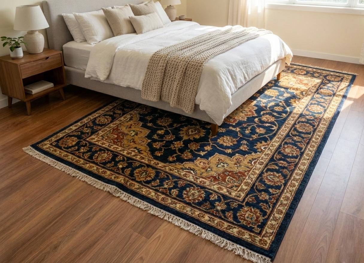 Expertly crafted by skilled artisans, this rug features a rich navy blue base with warm gold and beige floral motifs, creating a refined and inviting atmosphere. Its dense knotting and pure wool pile provide exceptional durability, softness, and long-lasting beauty—perfect for hotel bedrooms, luxury homes, living rooms, and master suites.