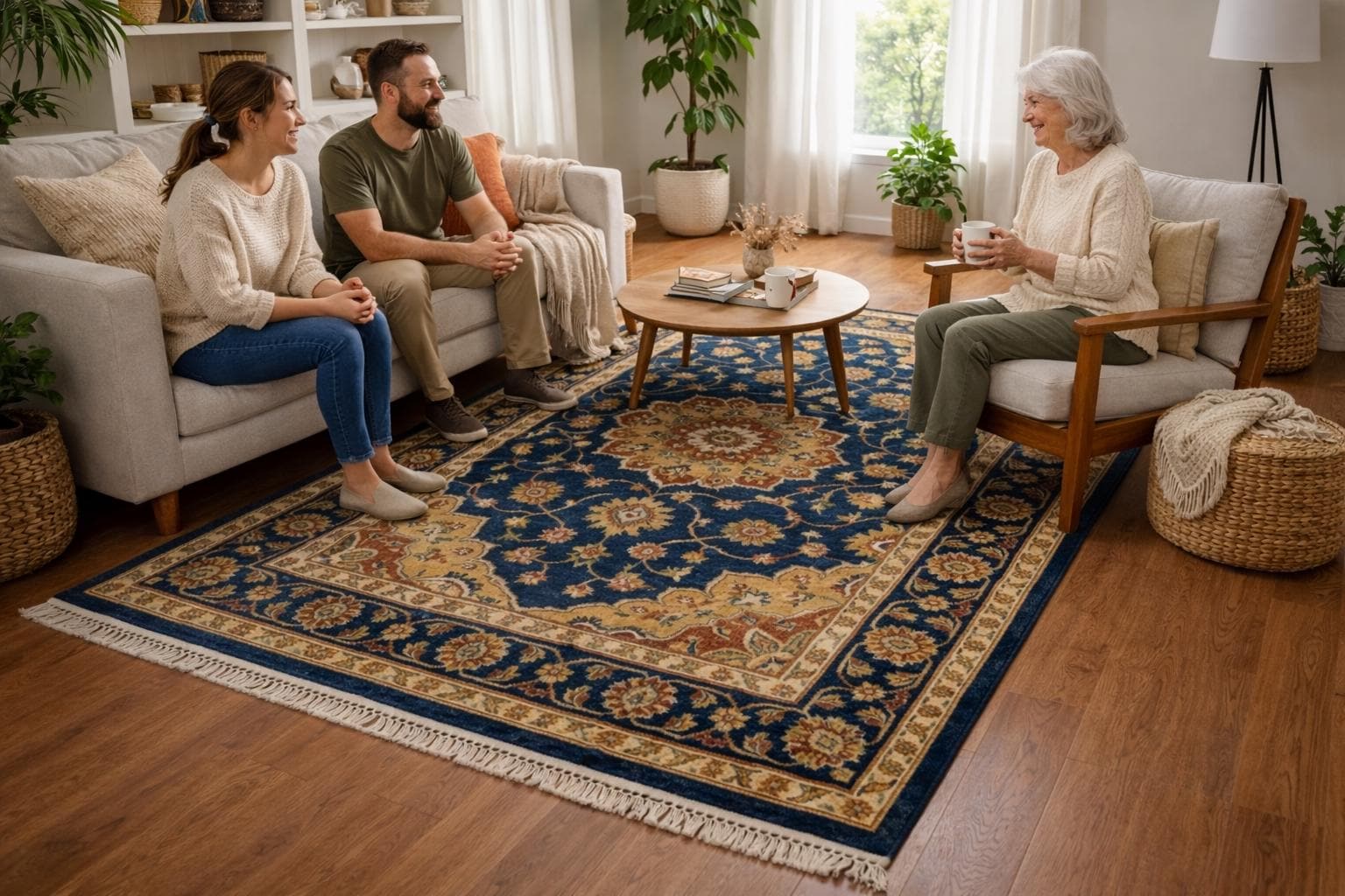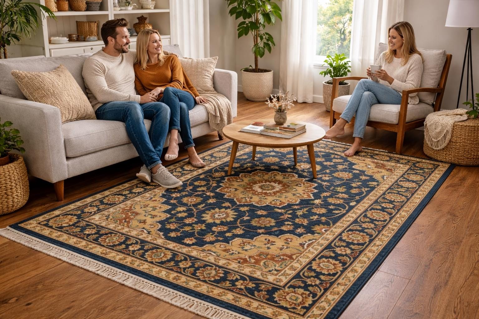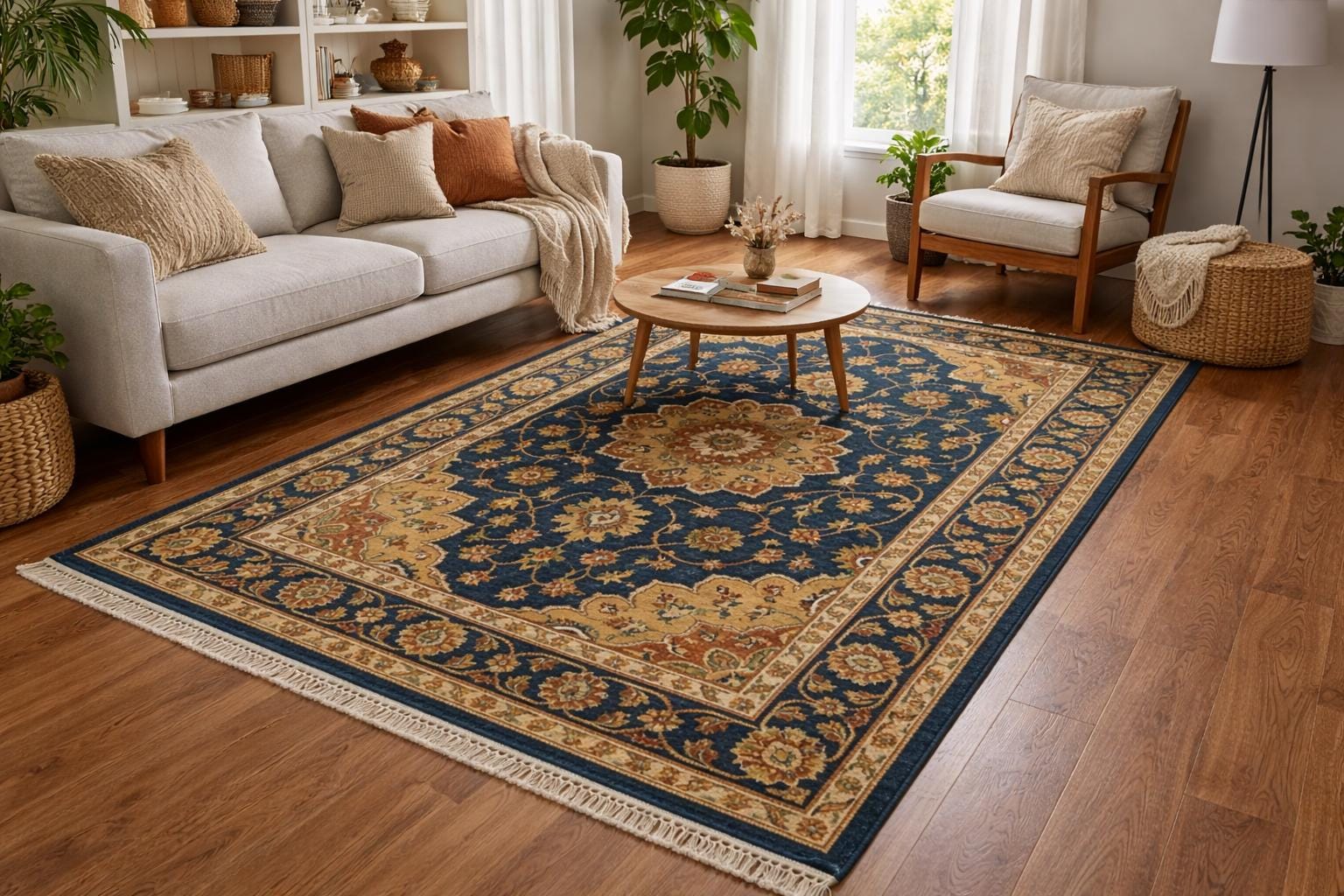 Expertly crafted by skilled artisans, this rug features a rich navy blue base with warm gold and beige floral motifs, creating a refined and inviting atmosphere. Its dense knotting and pure wool pile provide exceptional durability, softness, and long-lasting beauty—perfect for hotel bedrooms, luxury homes, living rooms, and master suites.