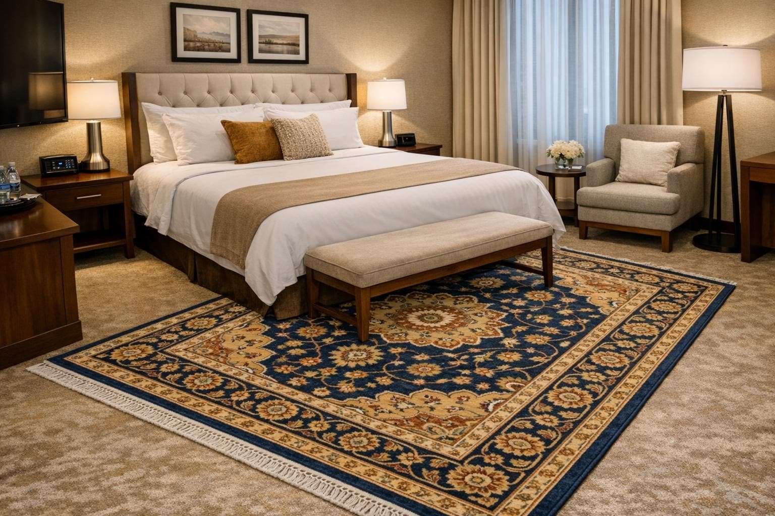 Bring timeless elegance and five-star hotel luxury into your home with this hand-knotted wool area rug, inspired by classic Oriental patterns and premium hotel interiors.