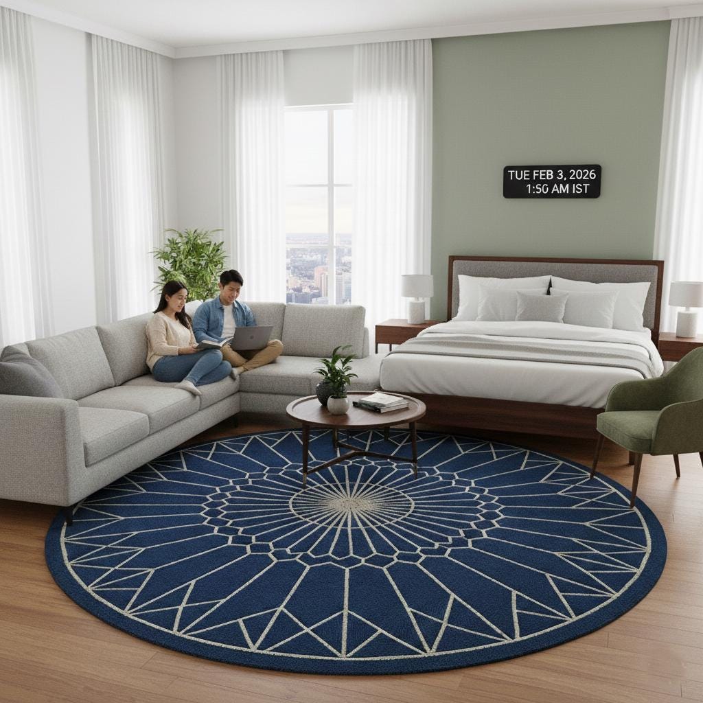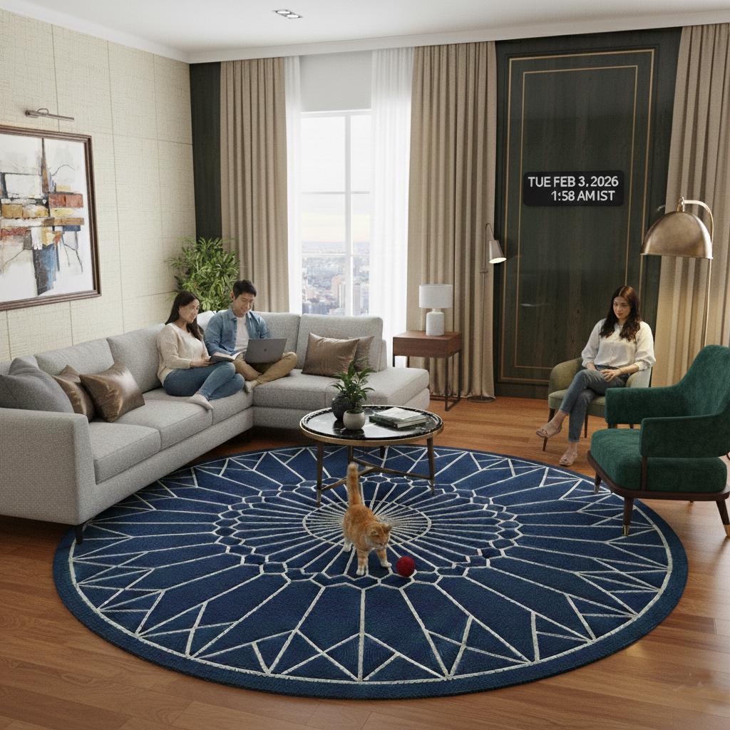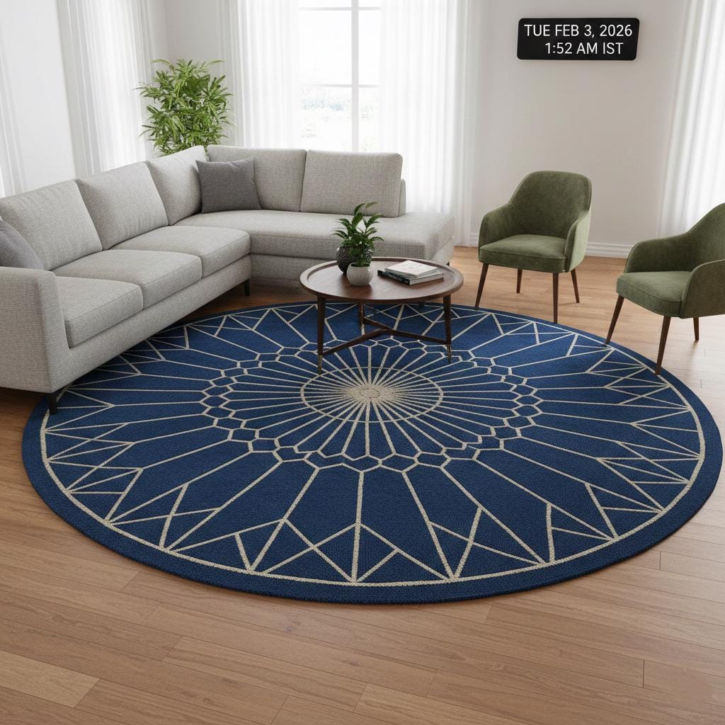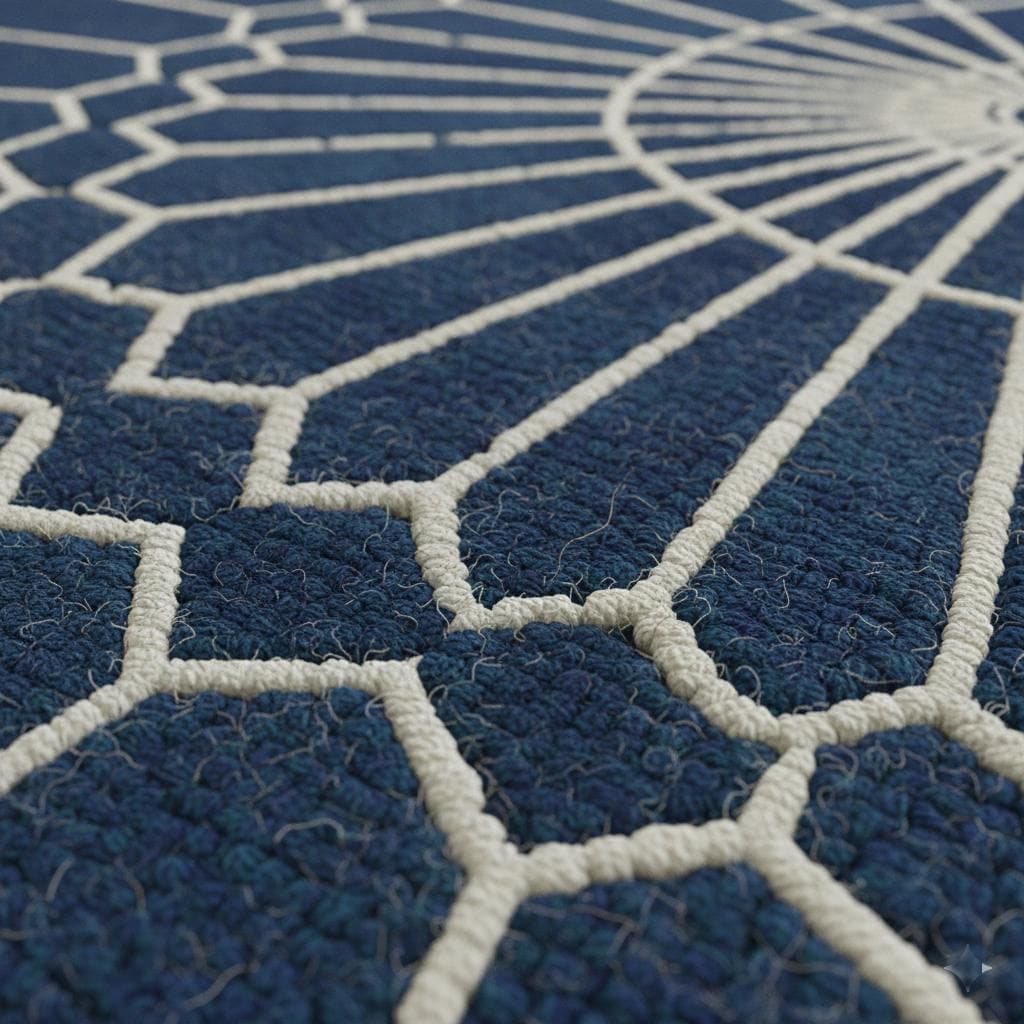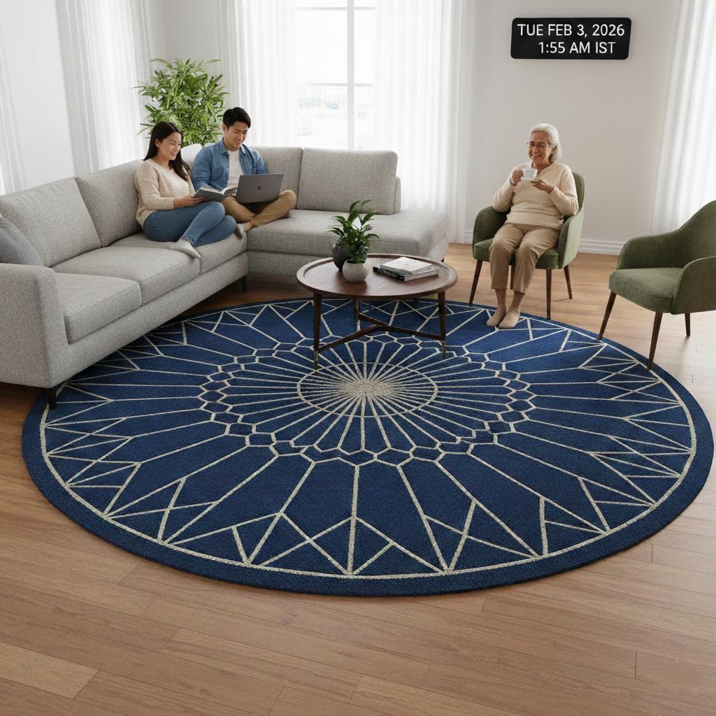 Add a bold yet elegant statement to your space with this round geometric wool rug, designed to elevate modern and contemporary interiors. Featuring a striking deep blue base with ivory geometric mandala lines, this rug brings balance, symmetry, and calm sophistication to any room.