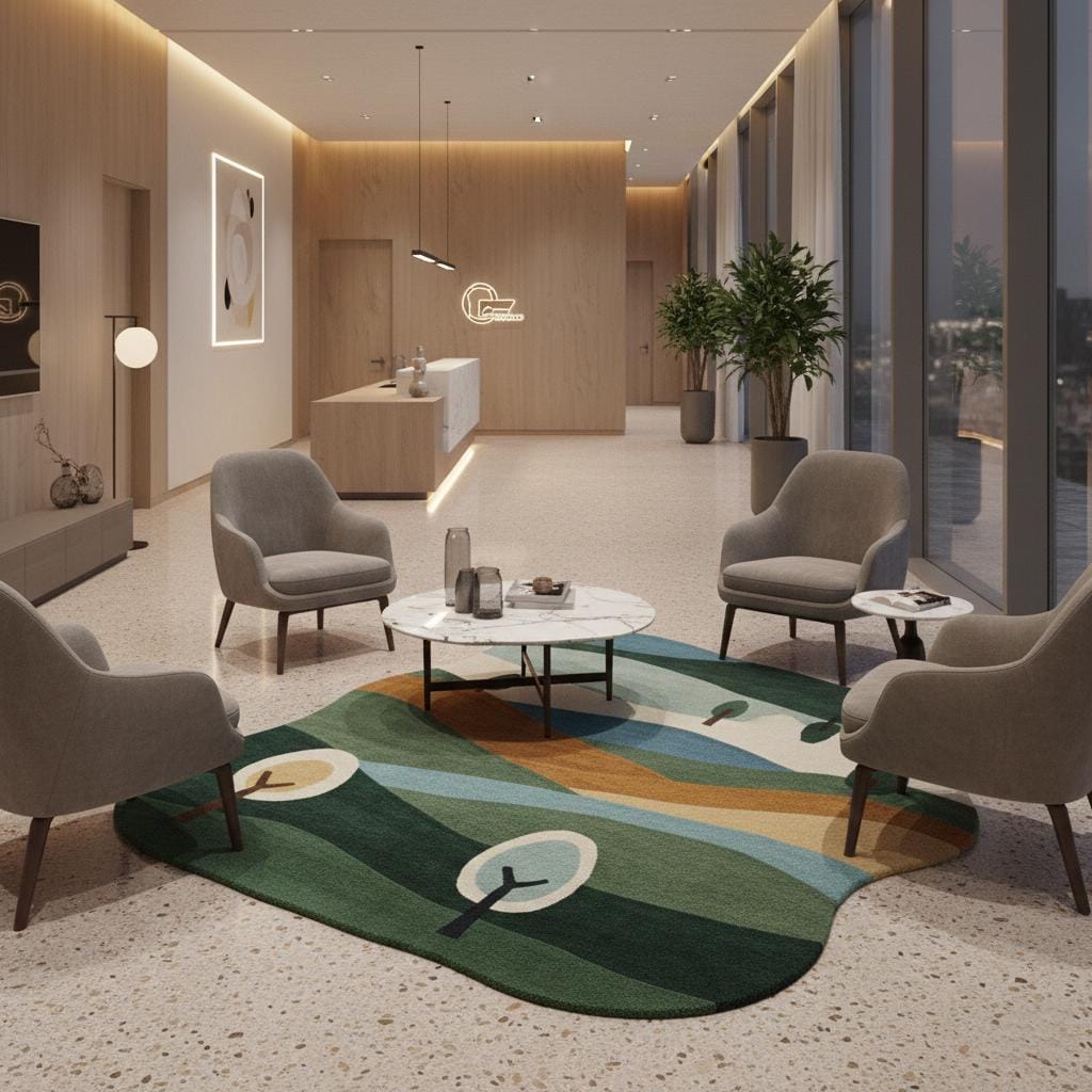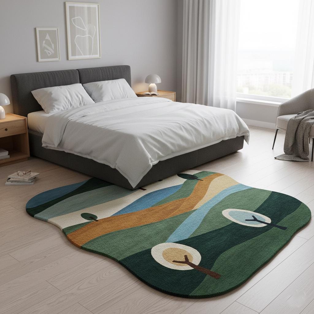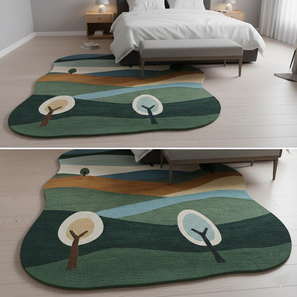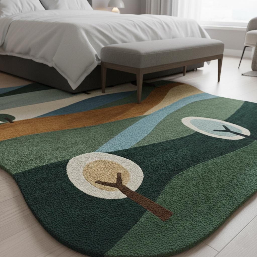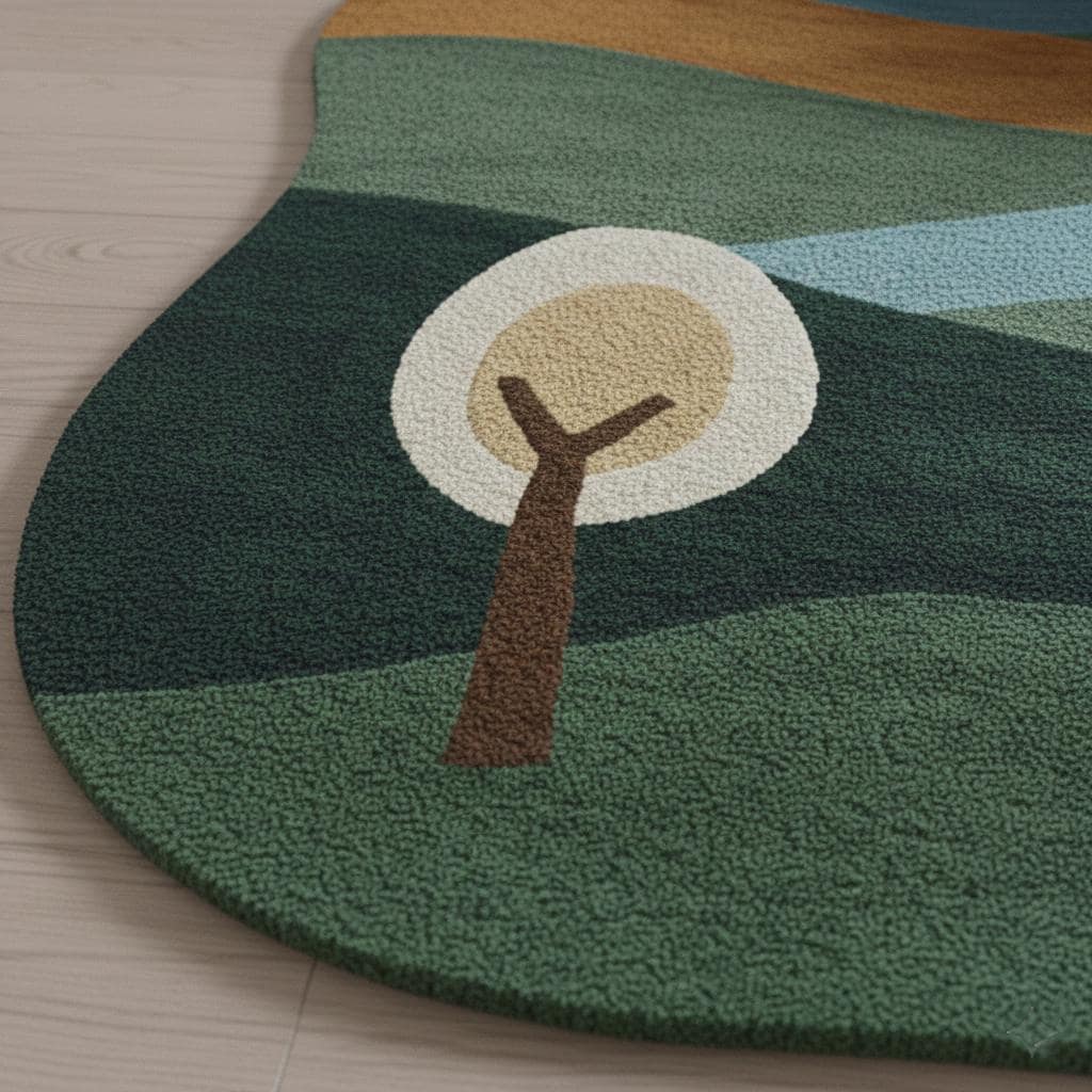 Transform your space with this beautifully designed Hand Tufted Abstract Nature Area Rug, inspired by peaceful landscapes and organic shapes. Featuring flowing hills, trees, and river-like forms in calming shades of green, beige, blue, and mustard, this rug brings warmth and serenity to modern interiors.