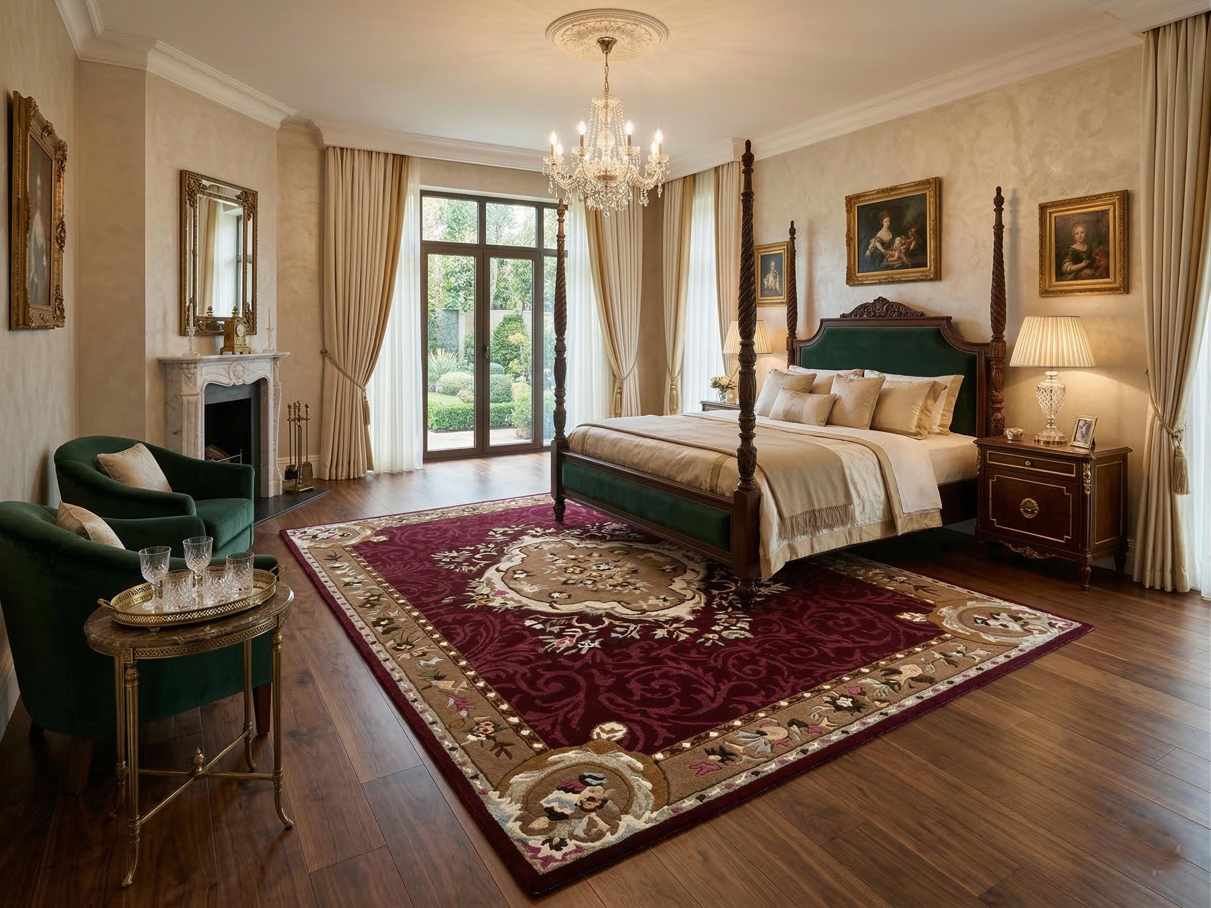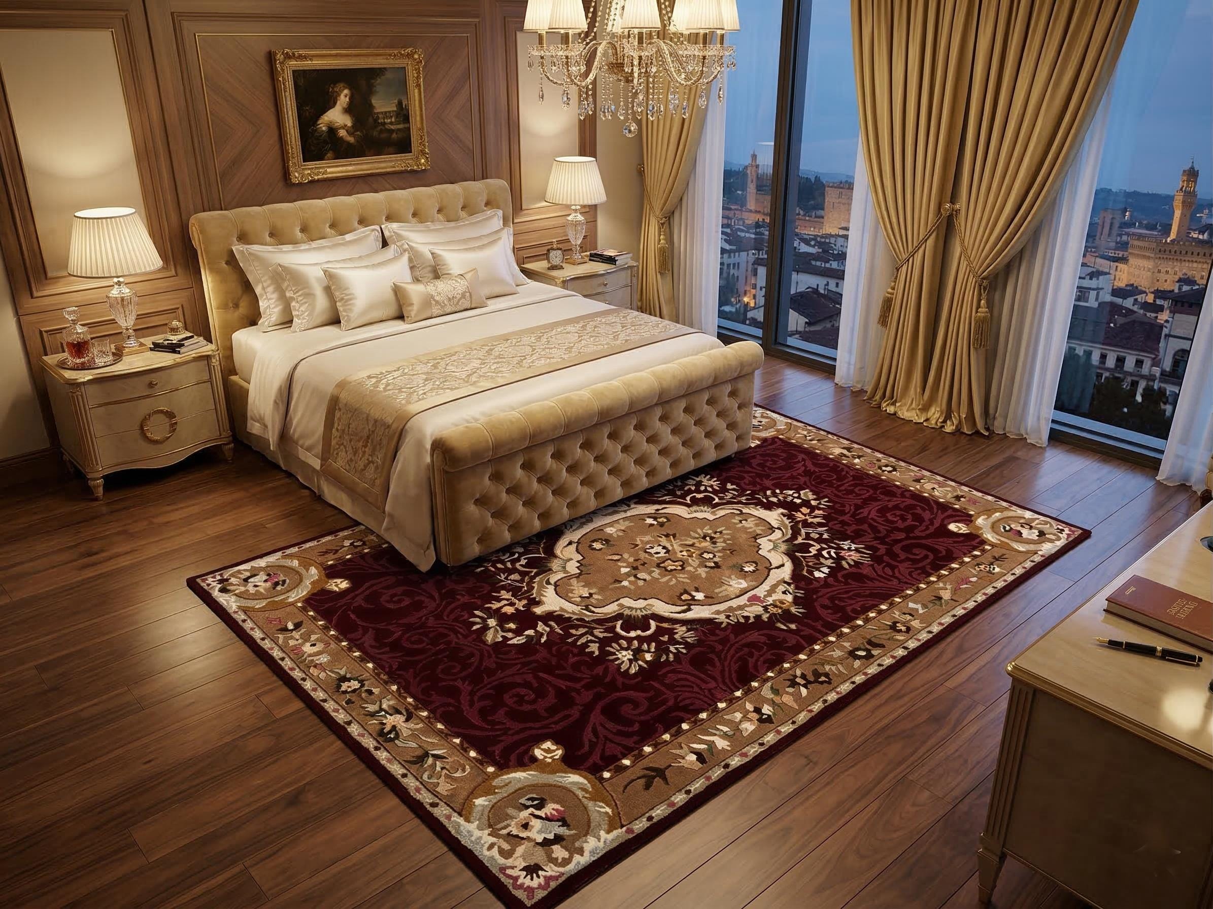 Whether placed in a bedroom, living room, dining room, or luxury apartment, this elegant carpet instantly elevates your décor. The deep red tones combined with beige and gold accents create a rich and welcoming atmosphere.