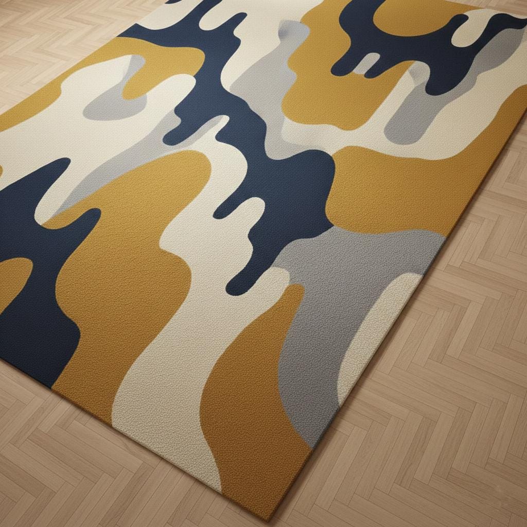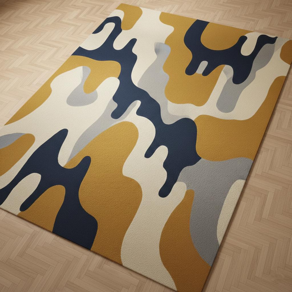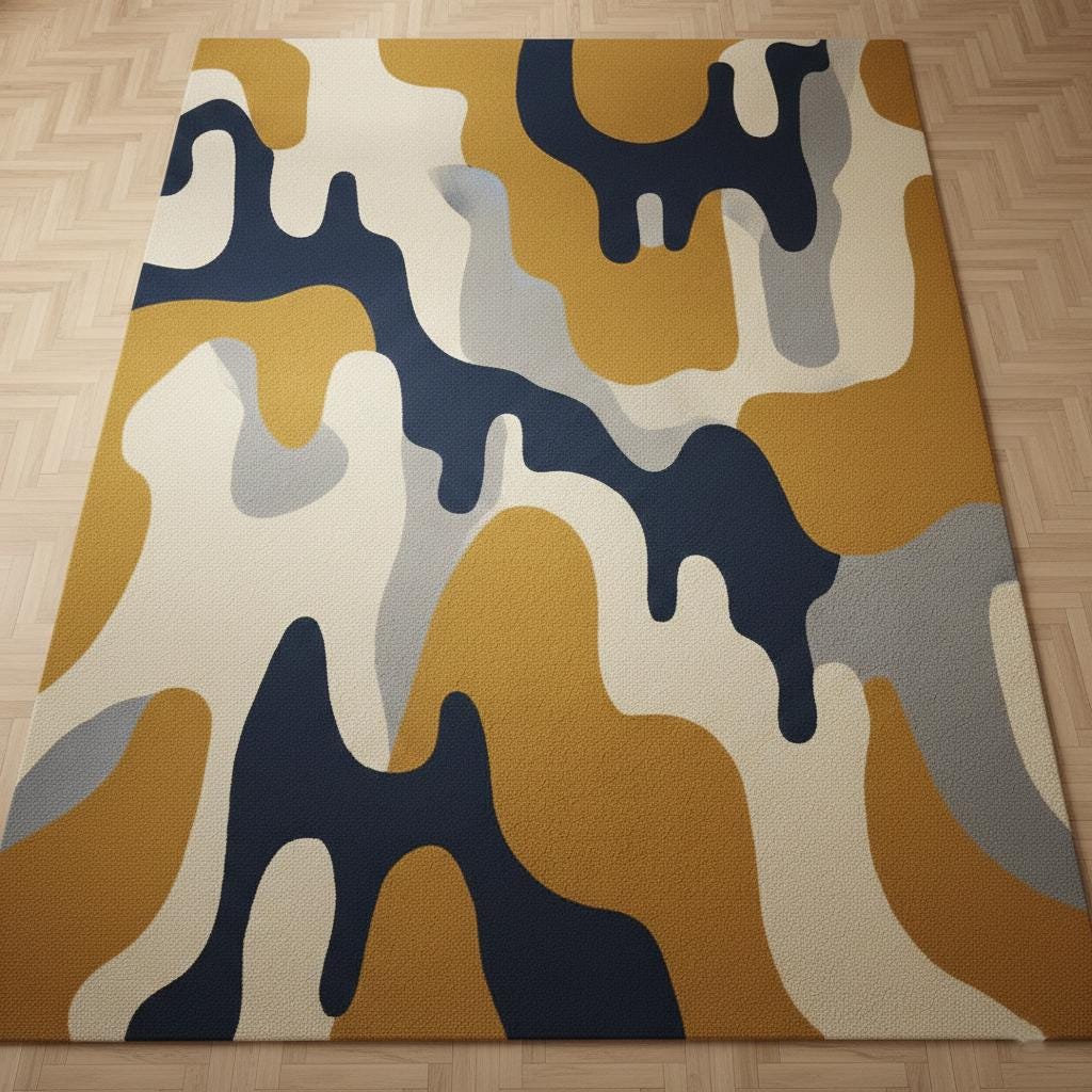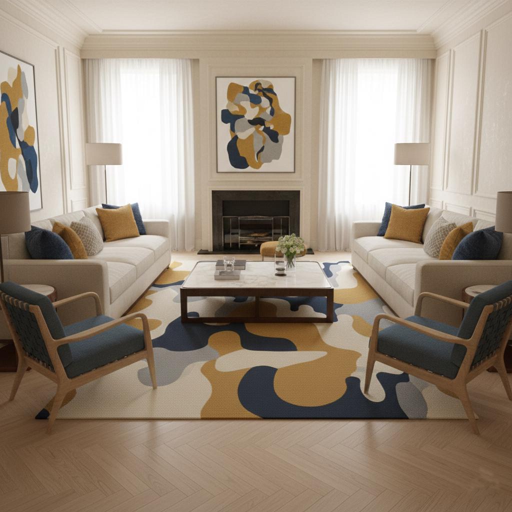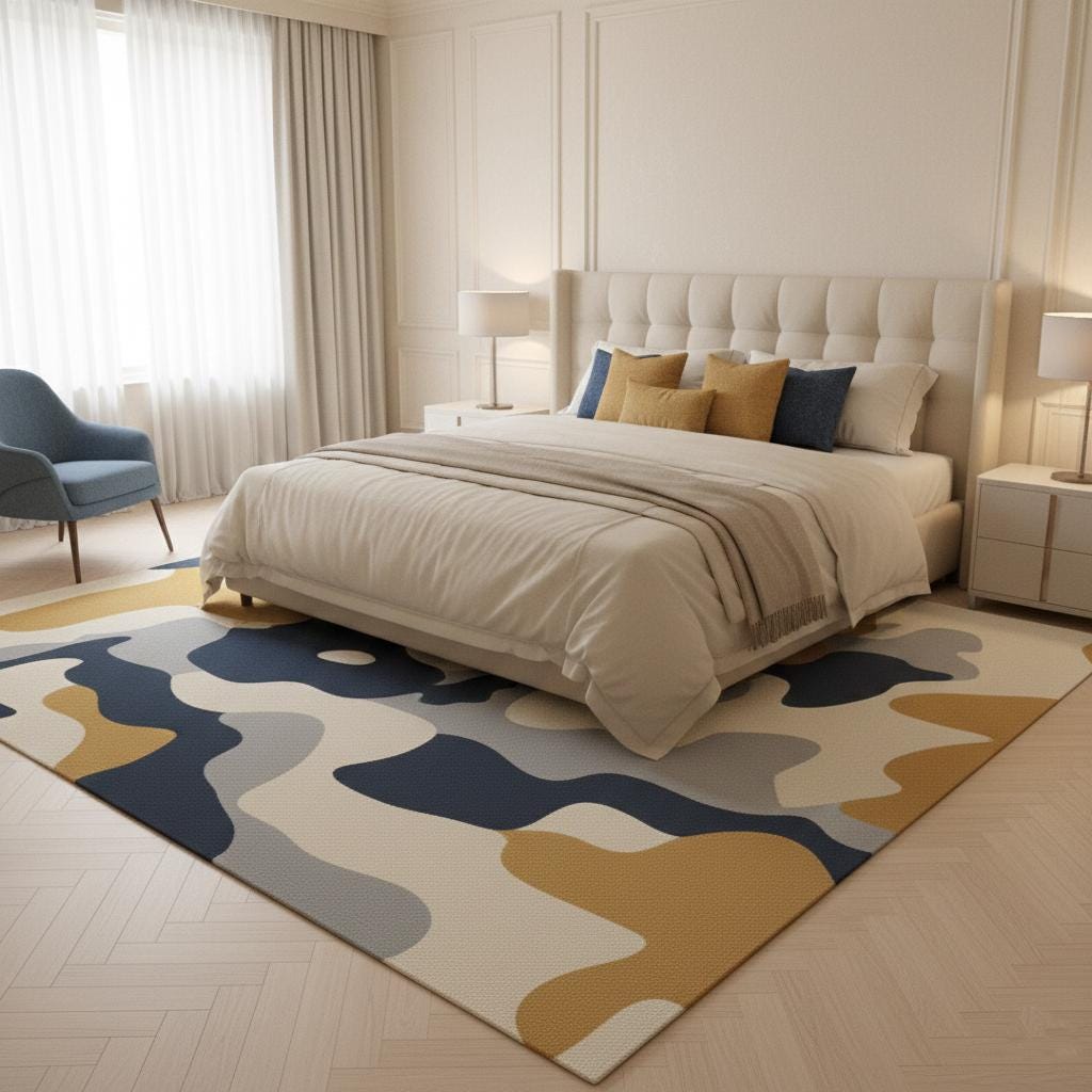 Elevate your space with this handmade hand-tufted wool geometric rug, designed to bring a modern artistic touch to any bedroom or living room. Featuring an abstract pattern in calming cream, deep navy blue, and warm mustard tones, this rug blends contemporary style with cozy comfort. Perfect for luxury interiors, minimalist homes, and designer spaces.