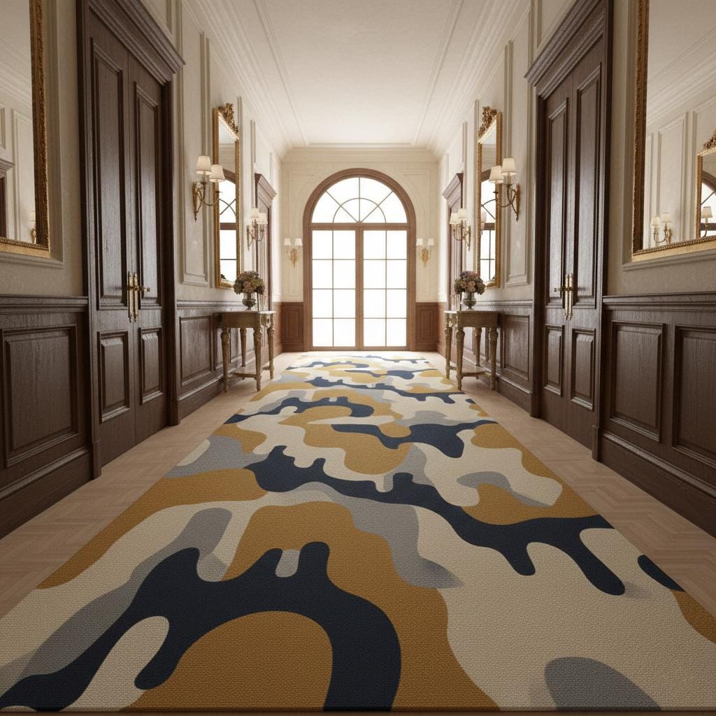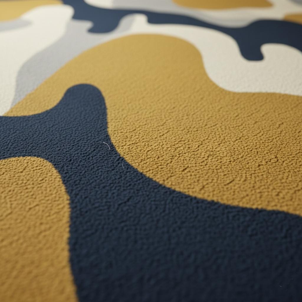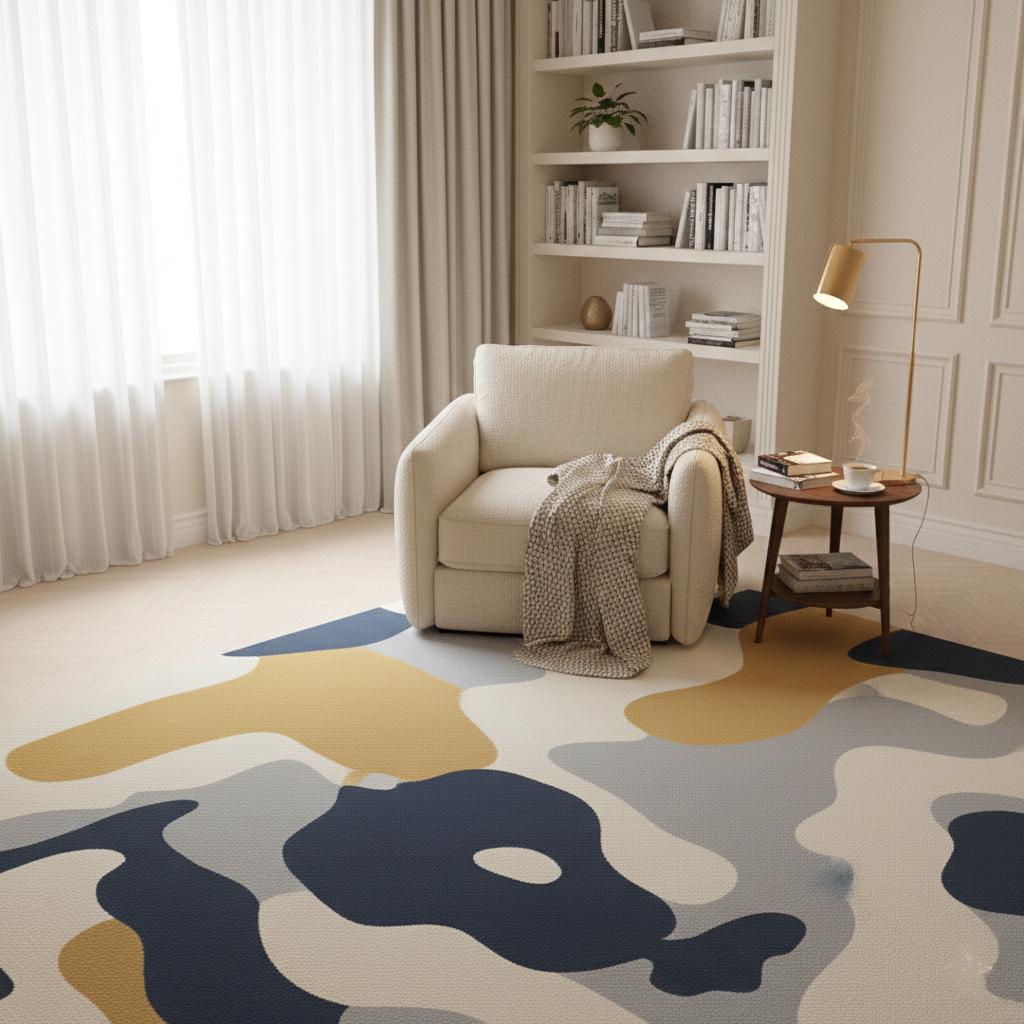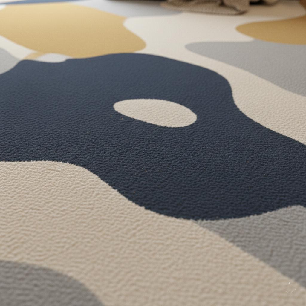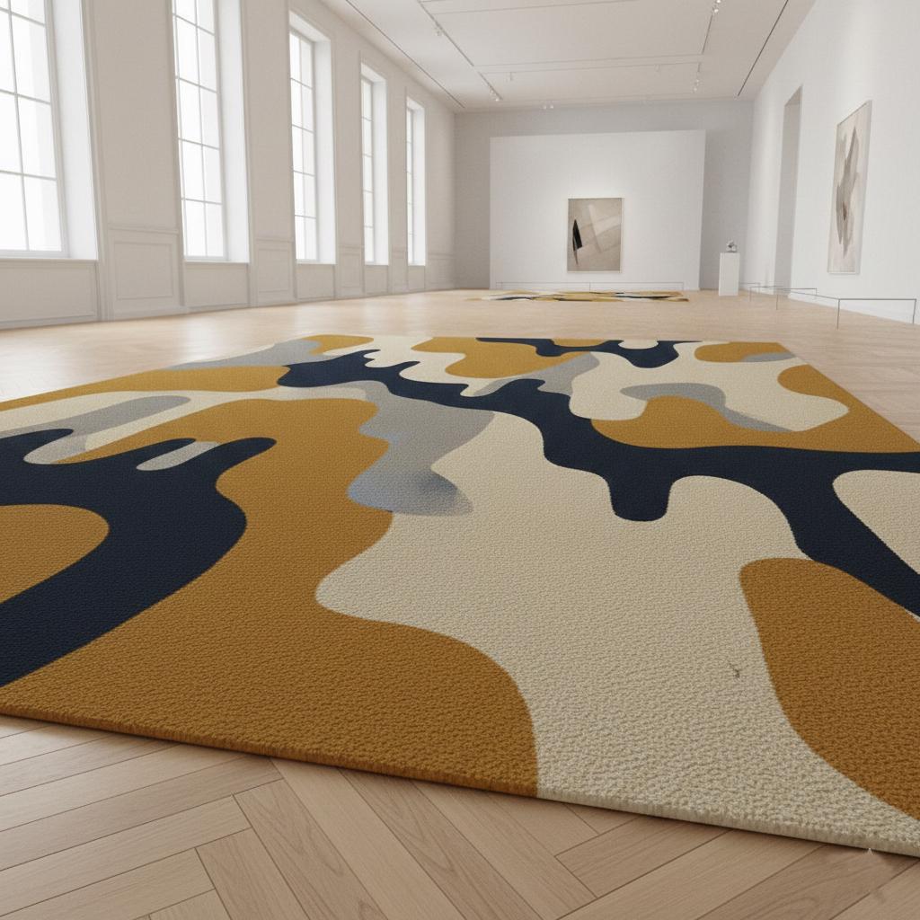 Elevate your space with this handmade hand-tufted wool geometric rug, designed to bring a modern artistic touch to any bedroom or living room. Featuring an abstract pattern in calming cream, deep navy blue, and warm mustard tones, this rug blends contemporary style with cozy comfort. Perfect for luxury interiors, minimalist homes, and designer spaces.