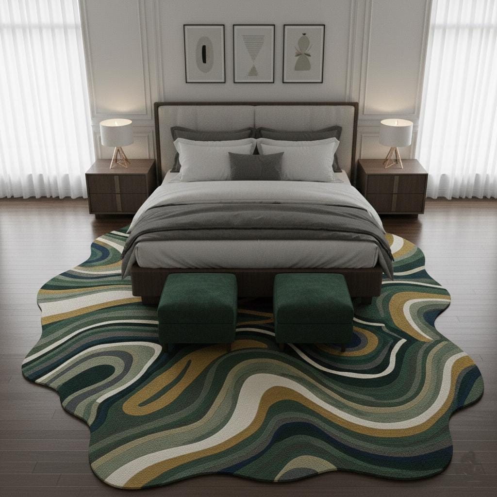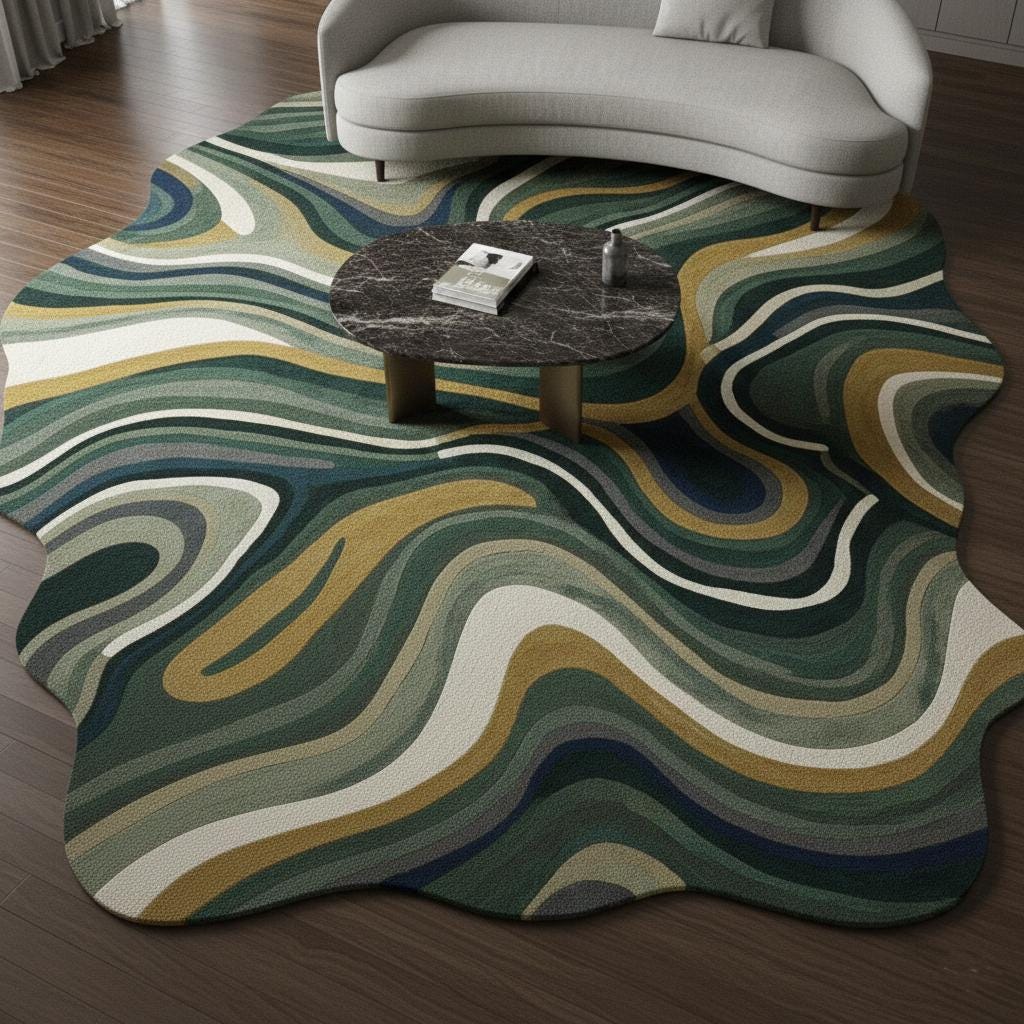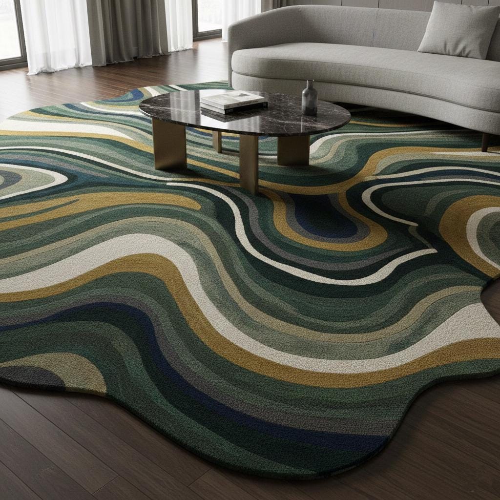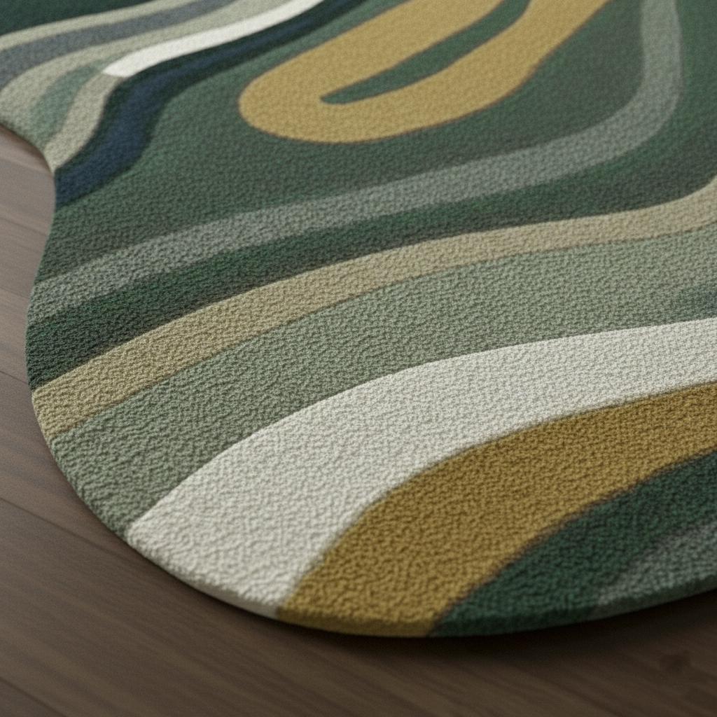 Introduce artistic elegance to your home with this handmade hand-tufted wool abstract rug in soothing green, cream, navy, and mustard tones. Designed in a unique irregular organic shape, this modern area rug adds depth, movement, and a designer touch to contemporary interiors.