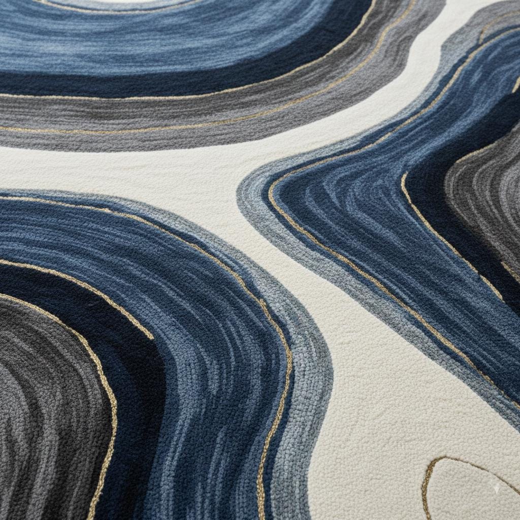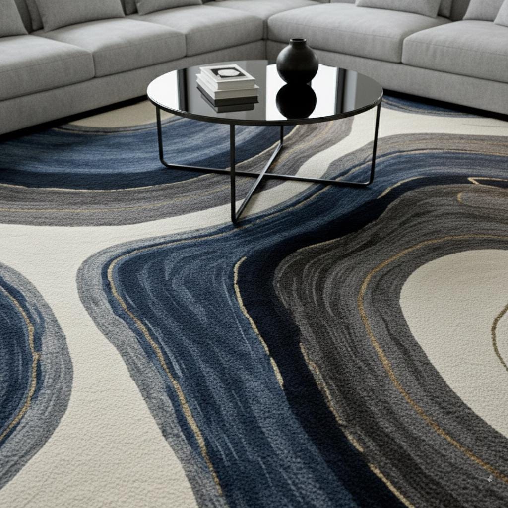 This designer rug is ideal for luxury living rooms, modern apartments, creative studios, and statement interiors. The artistic pattern blends deep navy, slate, and cream tones to complement neutral and contemporary décor styles.
