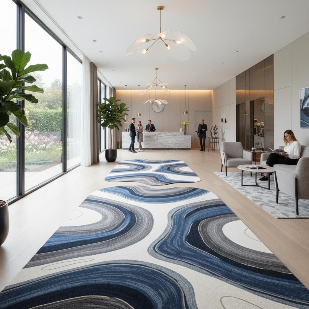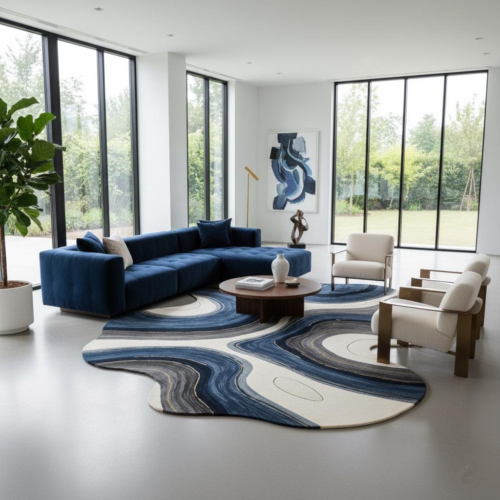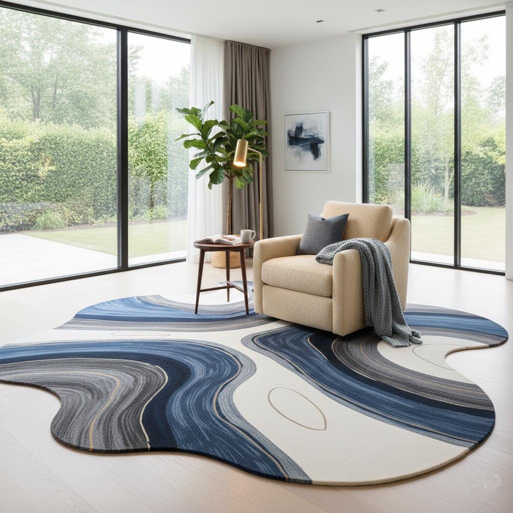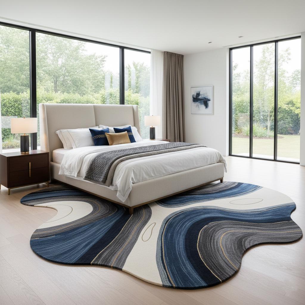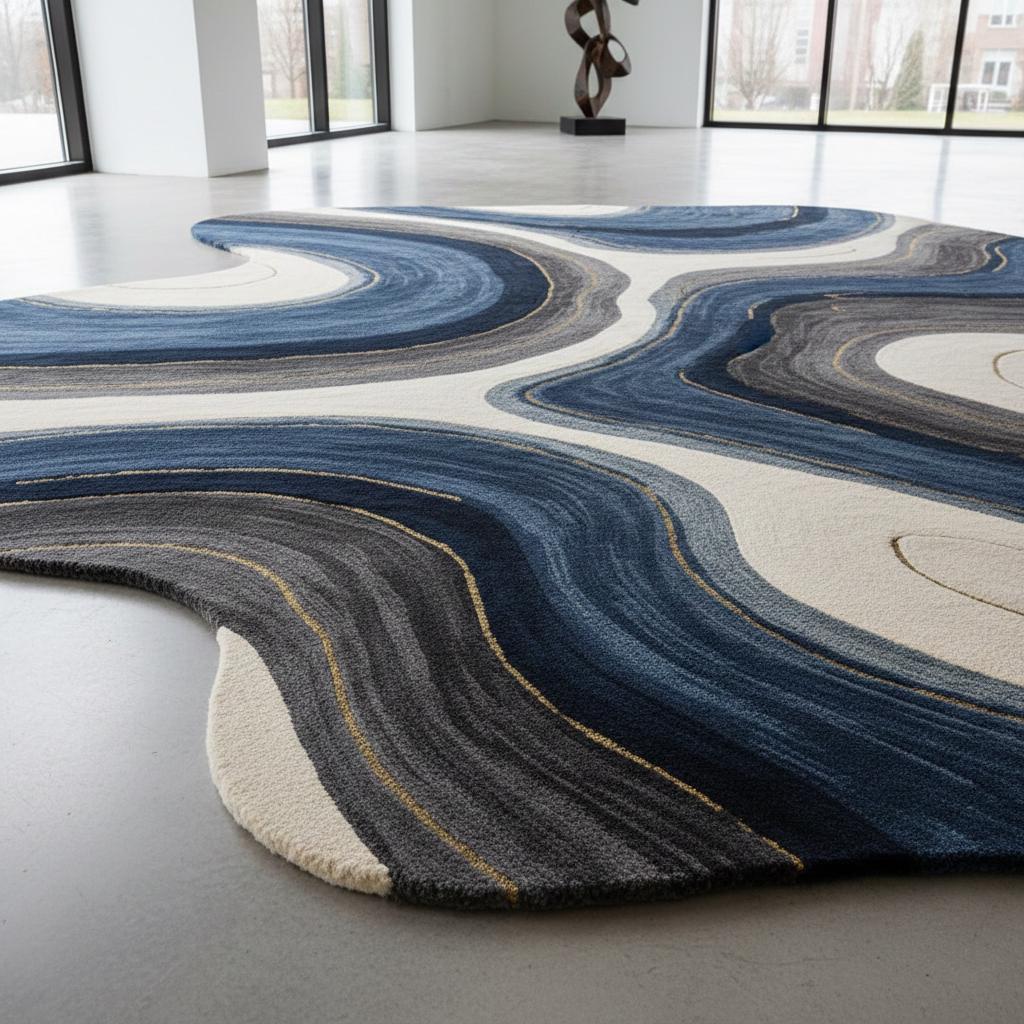 Hand-Tufted Wool Rug: Abstract Blue Wave Design, Irregular Shape