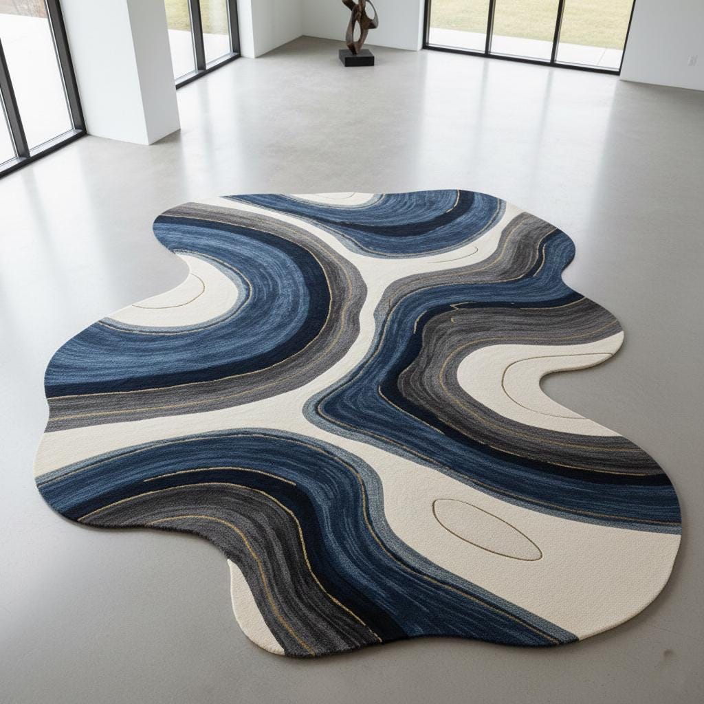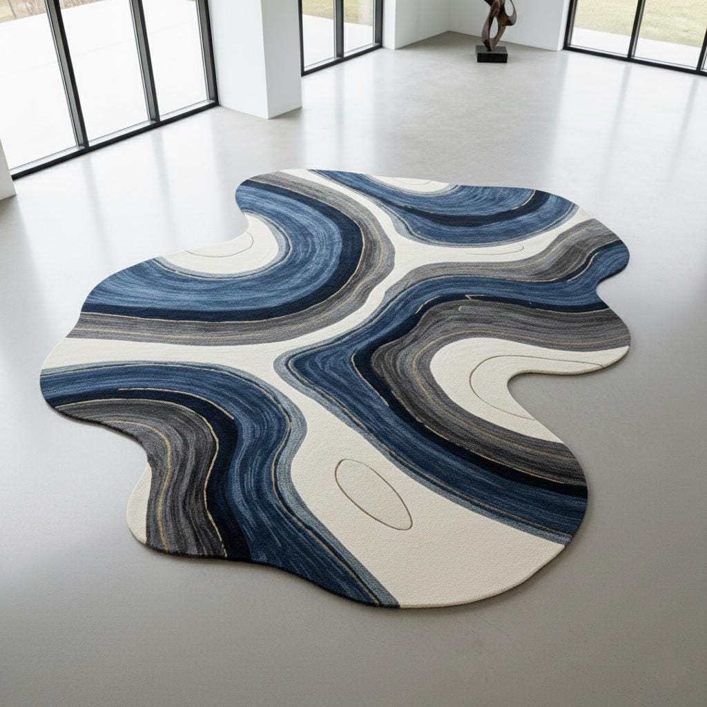 Elevate your interior with this stunning handmade abstract irregular shape rug, featuring flowing blue, ivory, and charcoal wave patterns inspired by natural stone formations. Expertly hand-tufted using premium wool, this modern designer carpet brings artistic movement and luxury texture to any living room, bedroom, or office space.