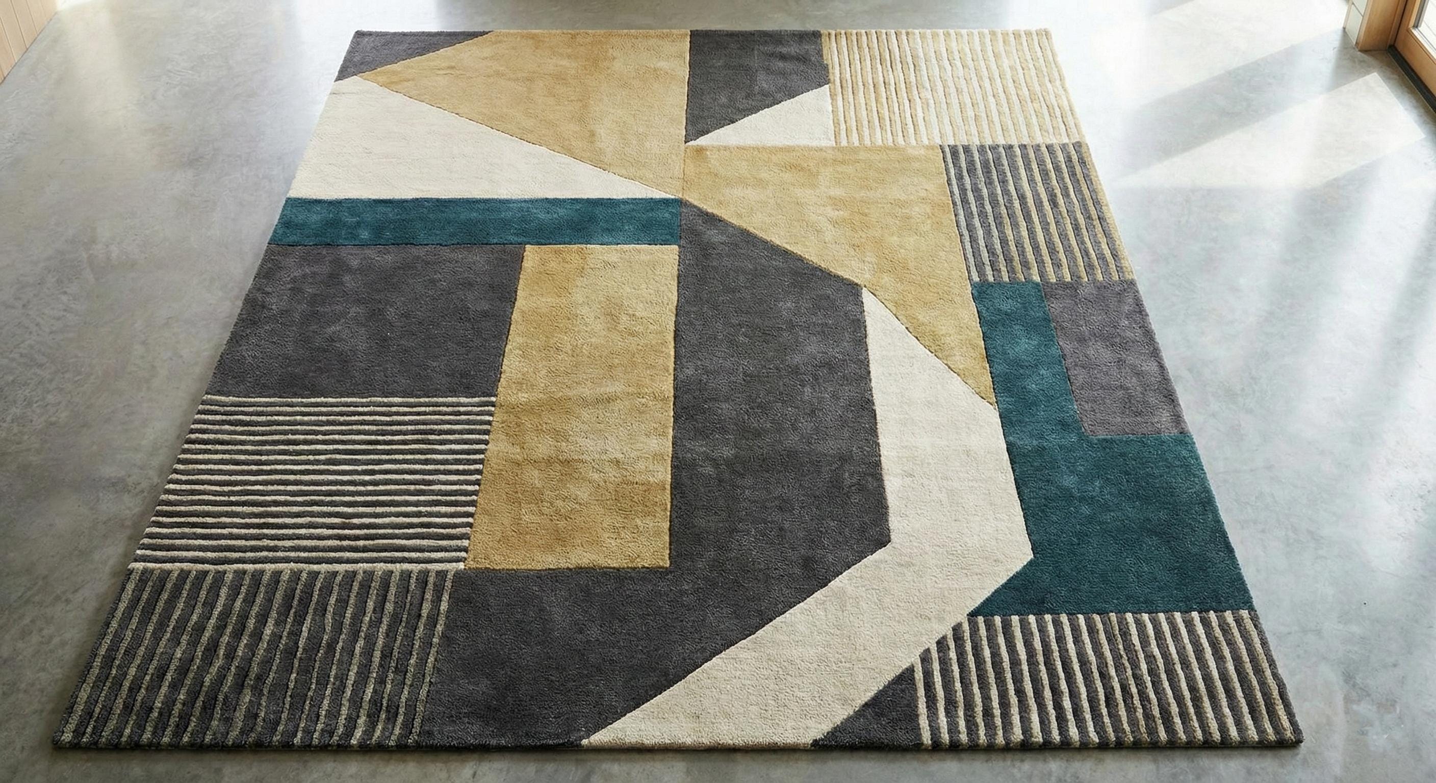 Elevate your space with this luxurious hand-tufted wool rug featuring a bold modern geometric design in teal, mustard, cream, and charcoal tones. Expertly crafted from premium wool, this contemporary area rug adds warmth, texture, and artistic style to any living room, bedroom, or office interior.