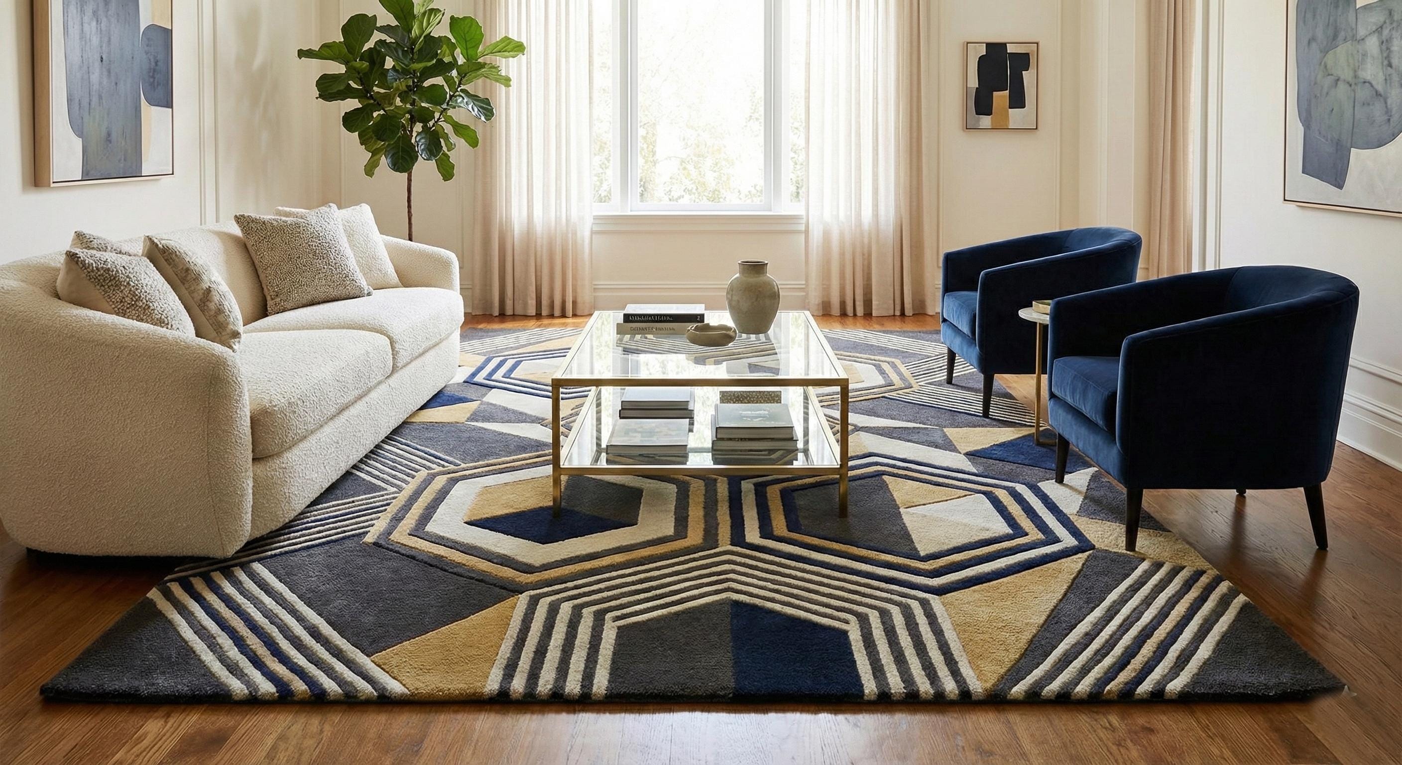 Make a bold statement with this stunning hand-tufted wool rug featuring a striking geometric design in navy blue, gold, cream, and charcoal tones. Crafted with precision and premium-quality wool, this contemporary area rug brings warmth, texture, and modern elegance to any space.