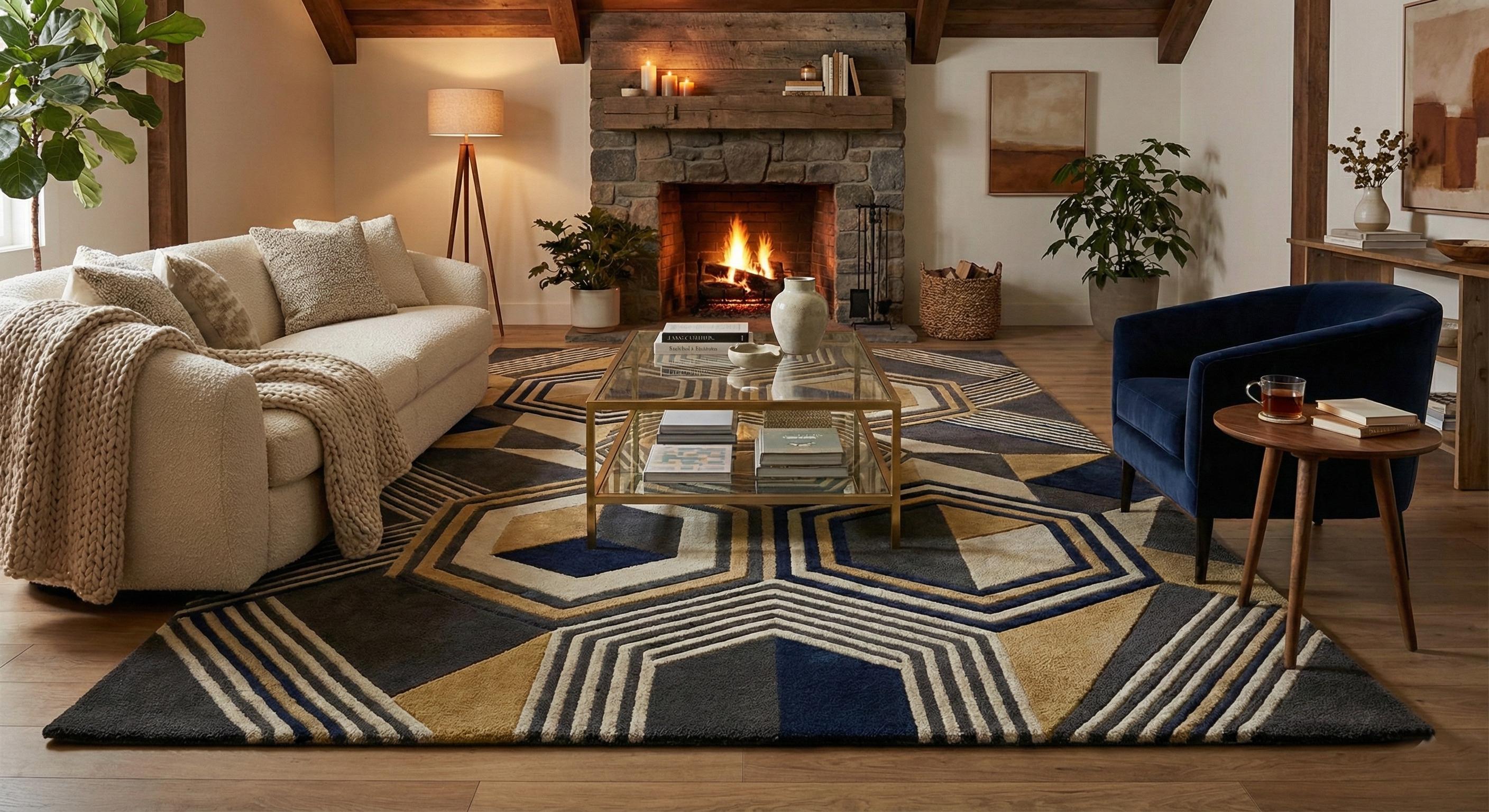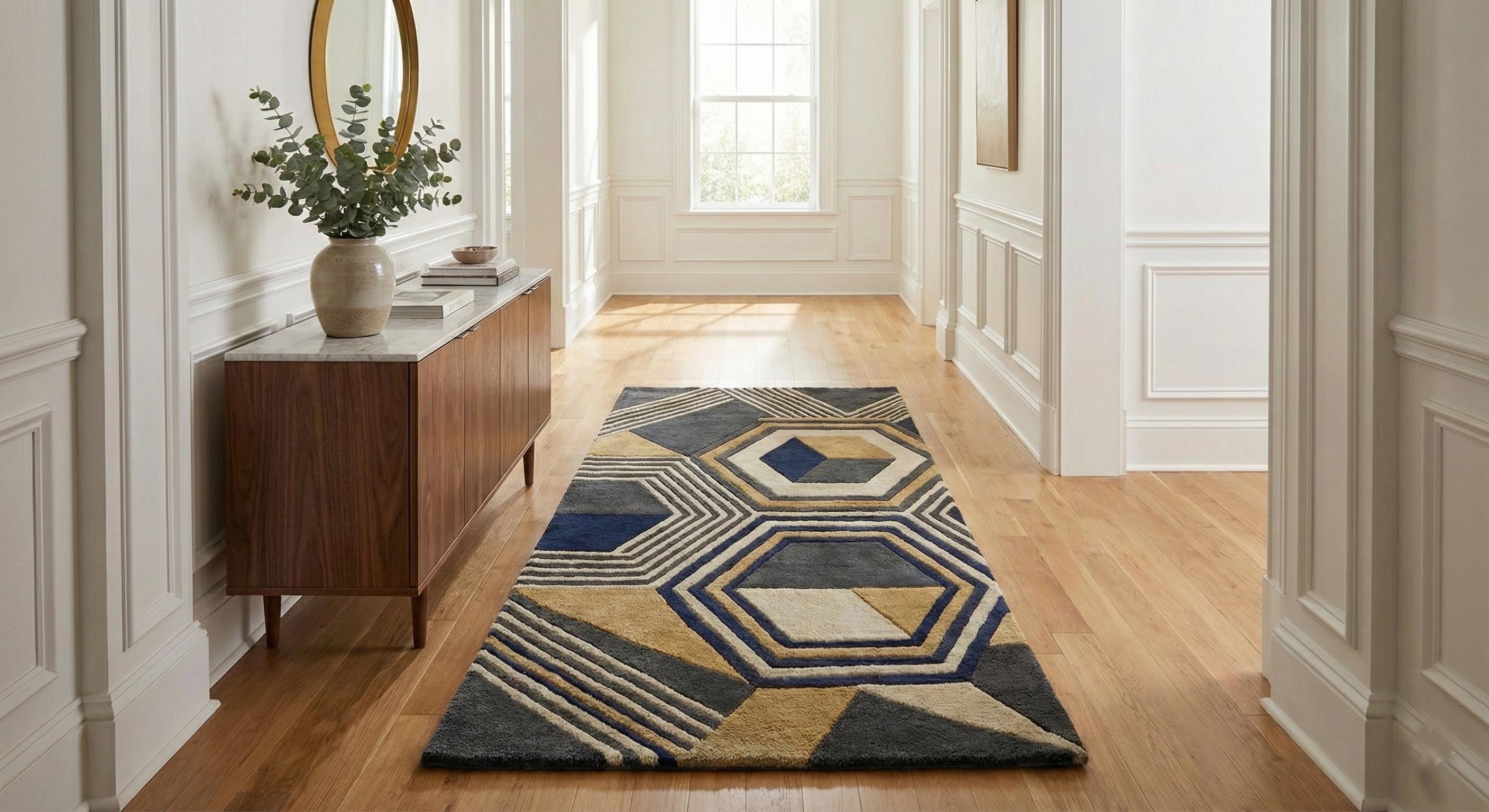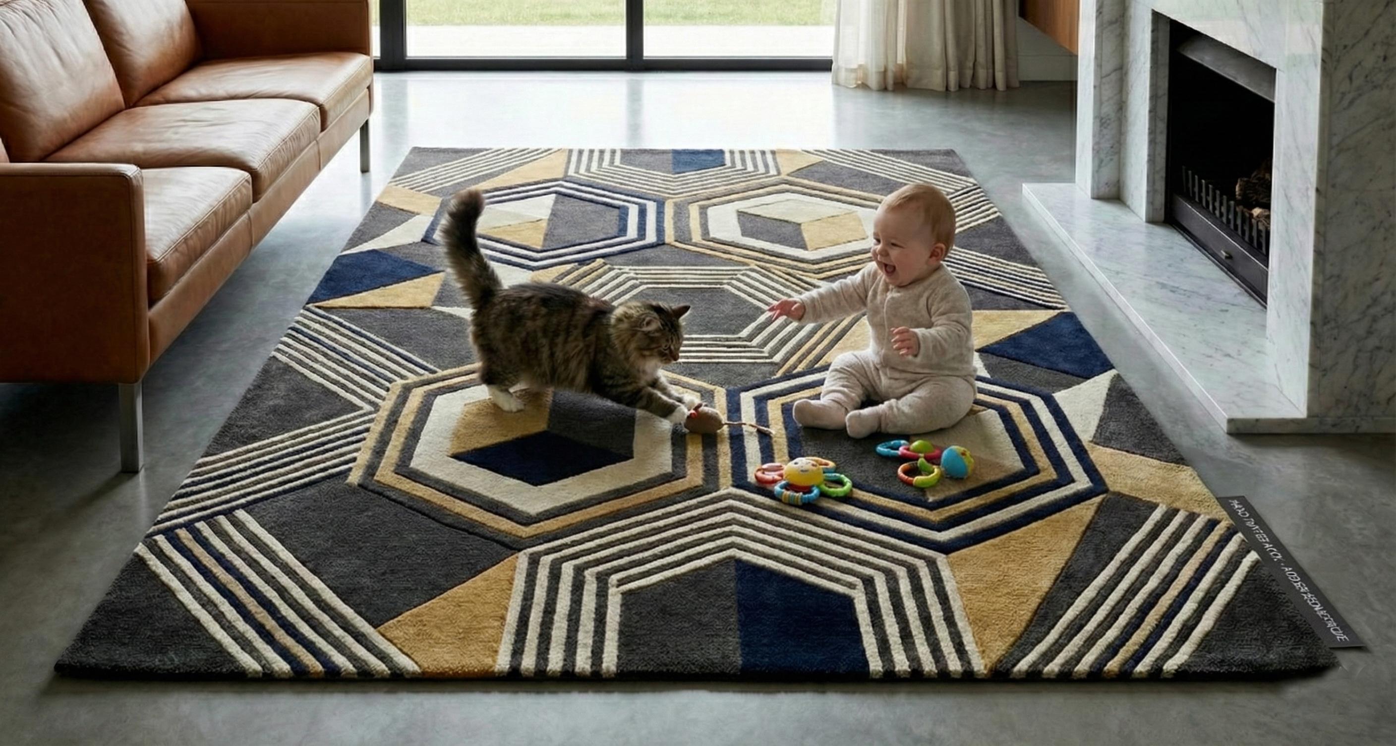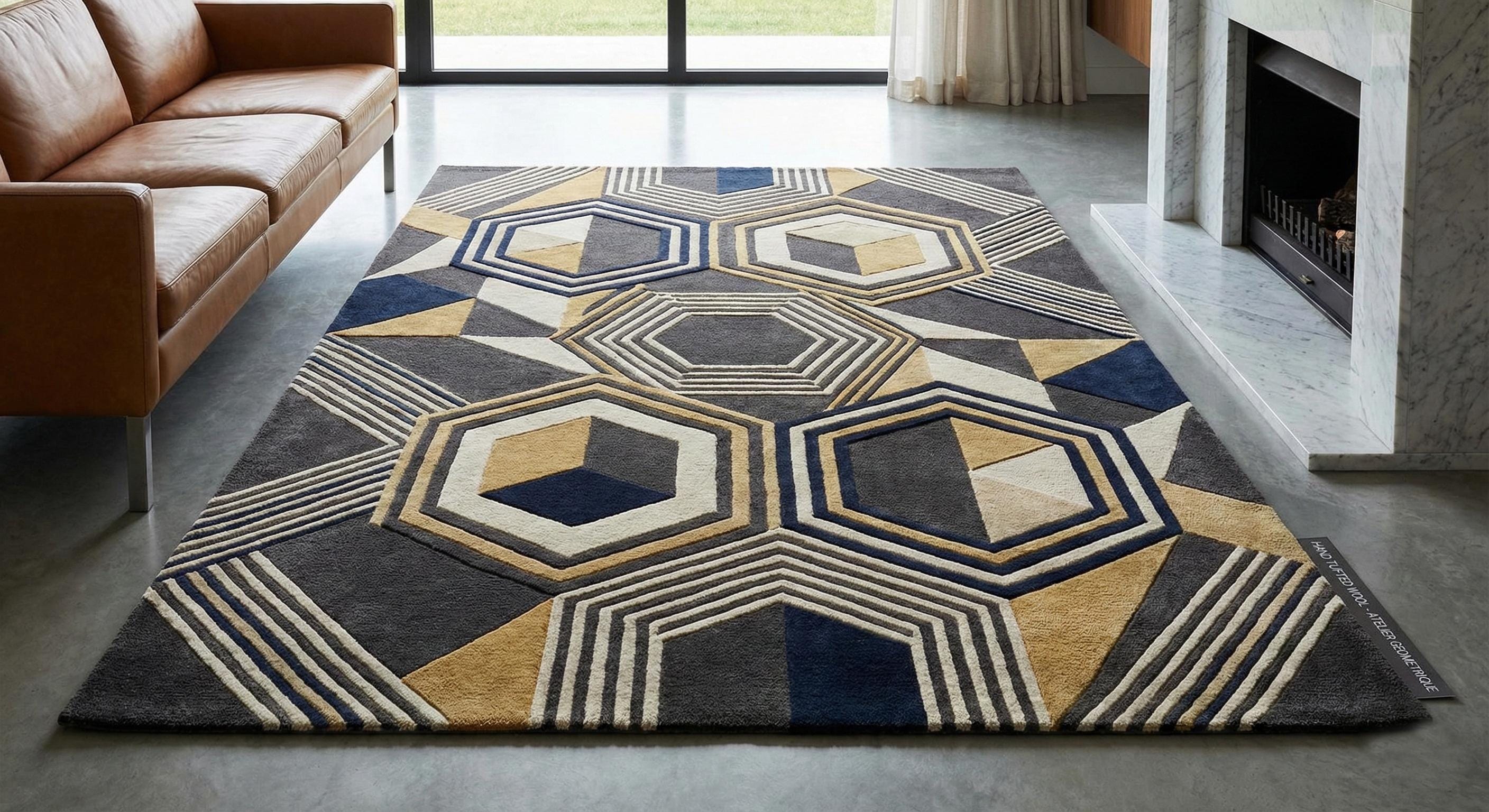 The layered hexagonal and linear pattern creates depth and dimension, making it a perfect focal point for living rooms, bedrooms, offices, or luxury interiors. Its plush surface feels soft underfoot while remaining durable for everyday use.