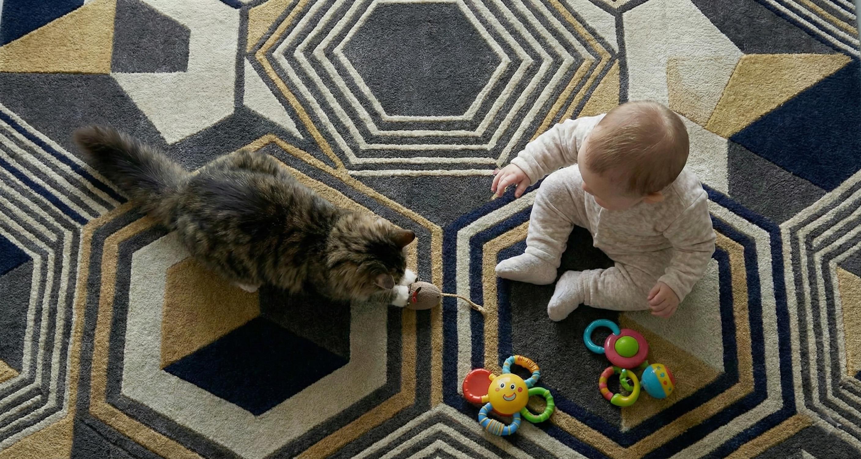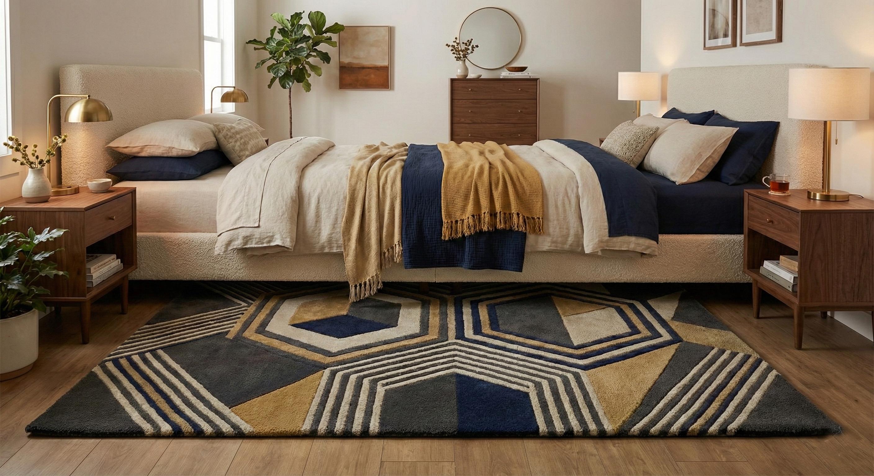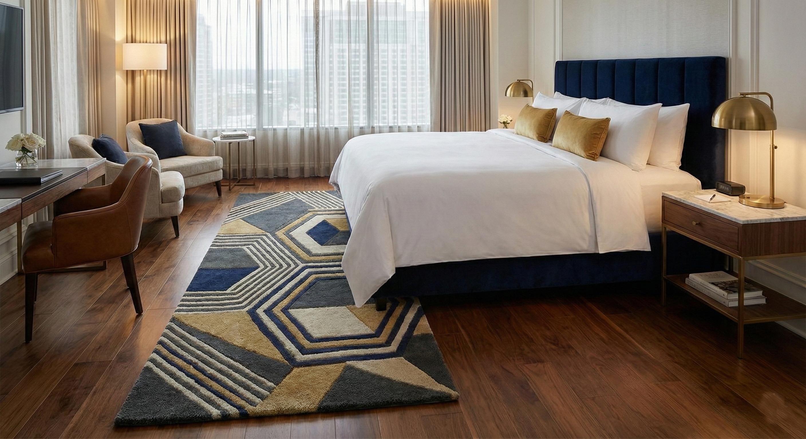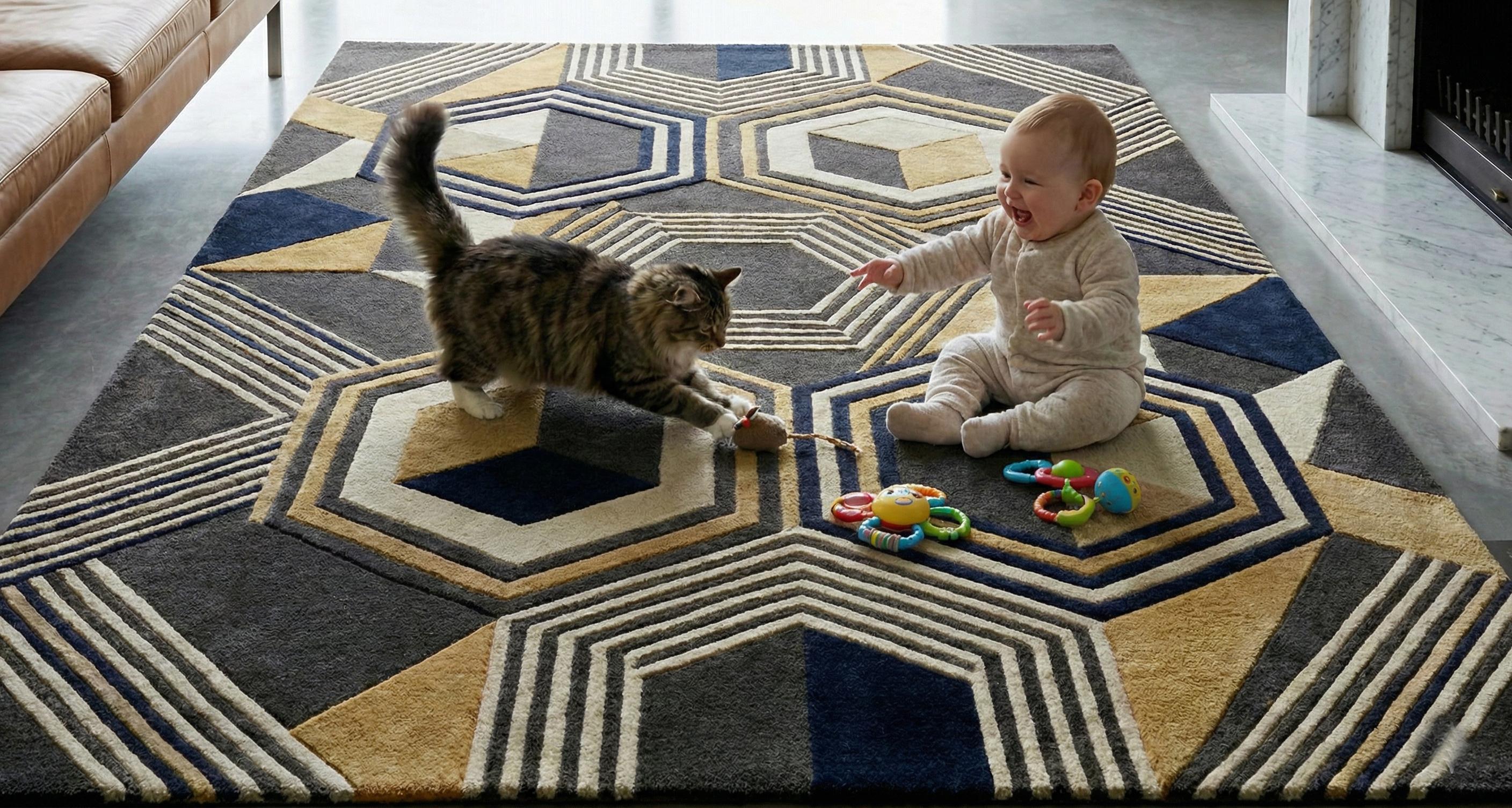 The layered hexagonal and linear pattern creates depth and dimension, making it a perfect focal point for living rooms, bedrooms, offices, or luxury interiors. Its plush surface feels soft underfoot while remaining durable for everyday use.