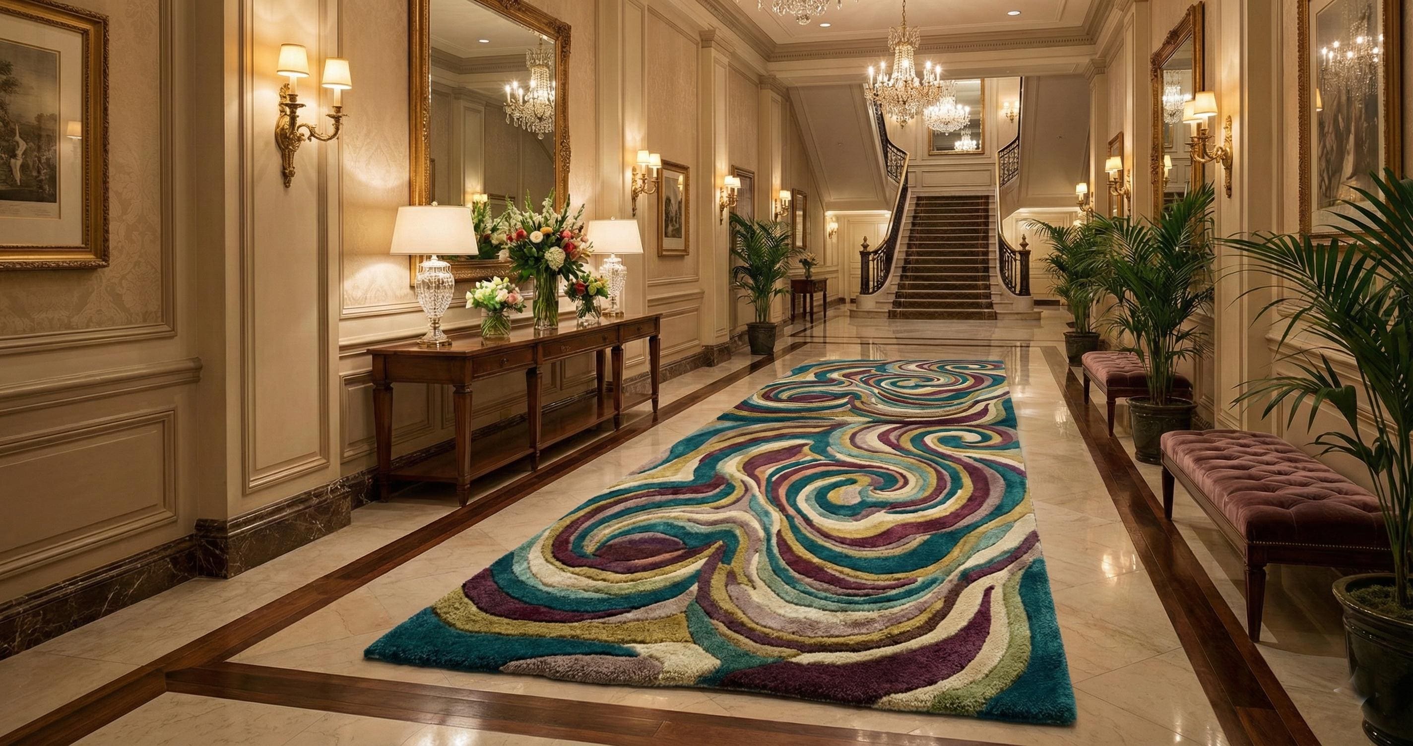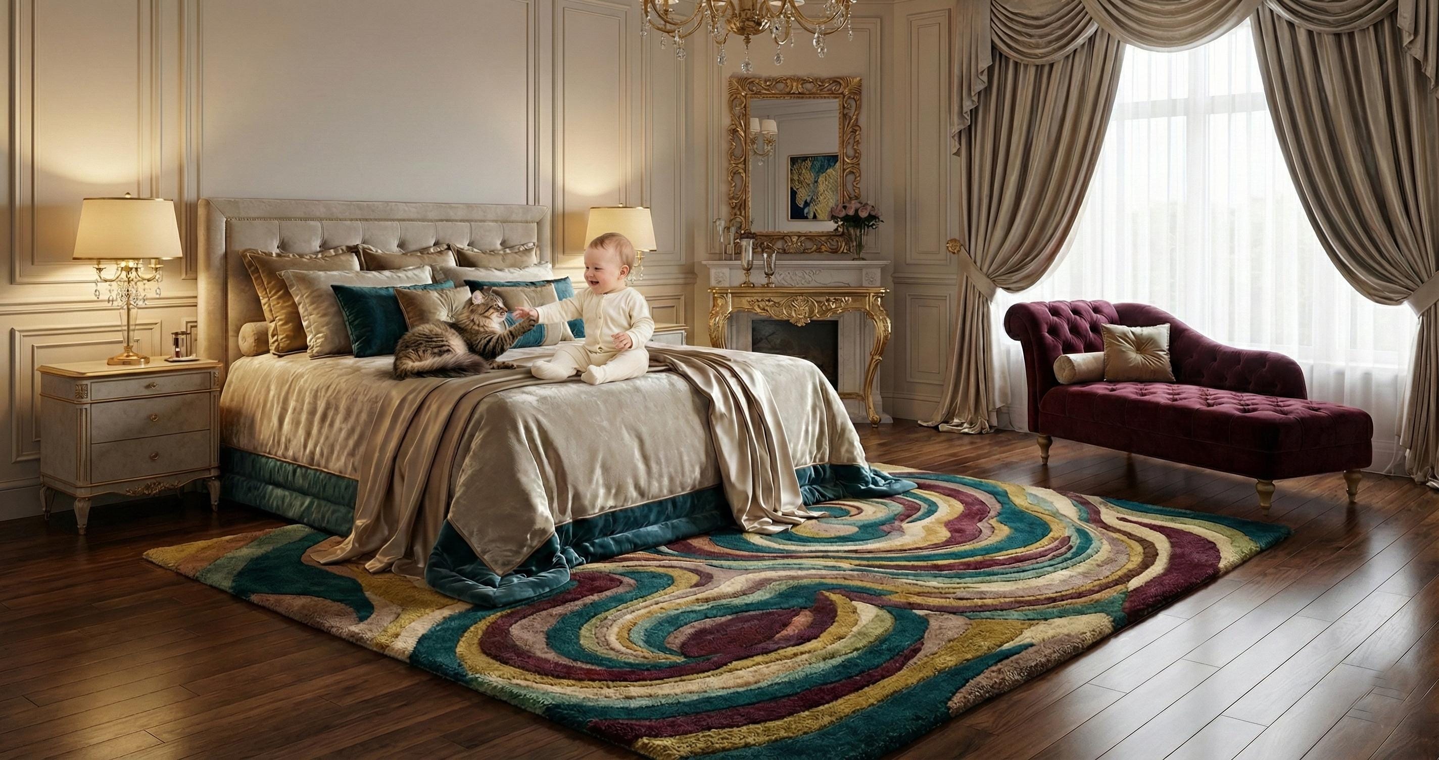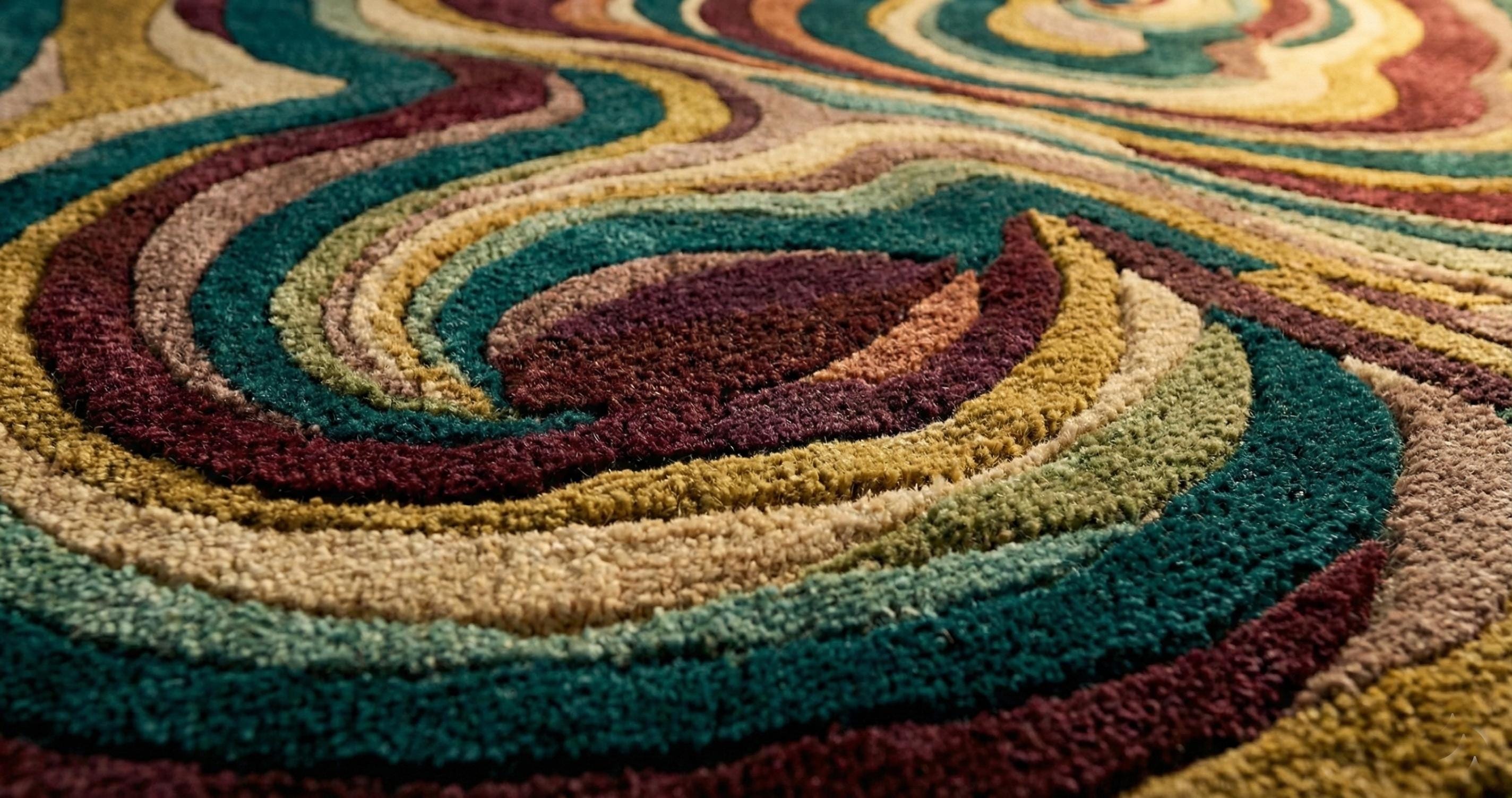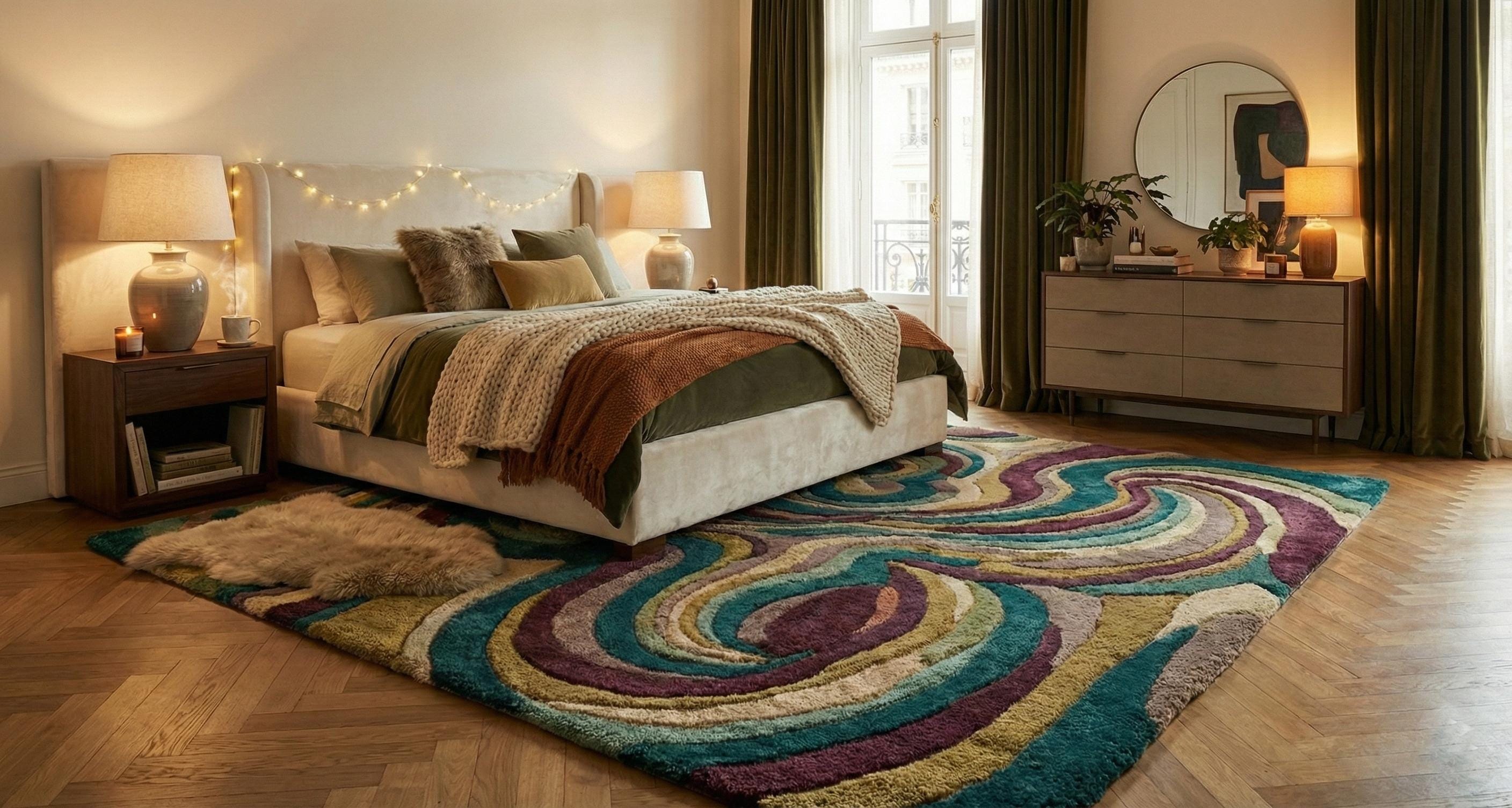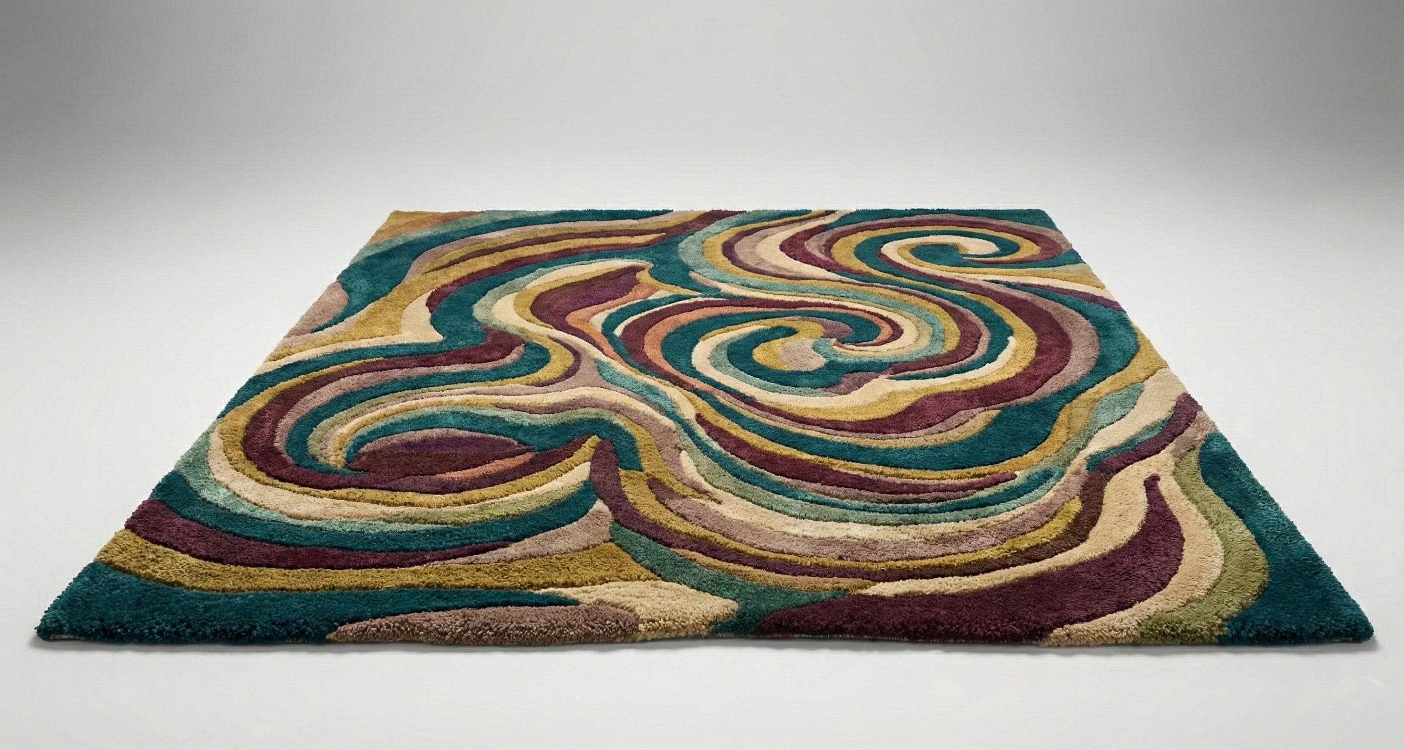 Add a bold statement of luxury and comfort to your space with this premium hand-tufted wool area rug. Featuring a stunning abstract swirl design in rich teal, gold, cream, and deep plum tones, this plush carpet instantly elevates any bedroom, living room, or luxury interior.