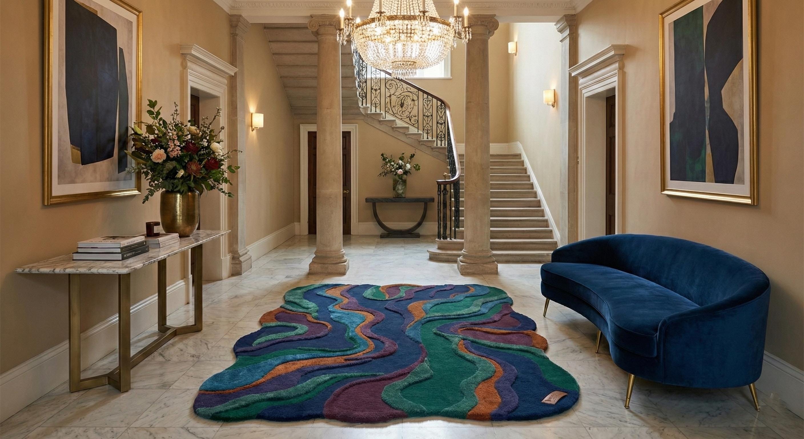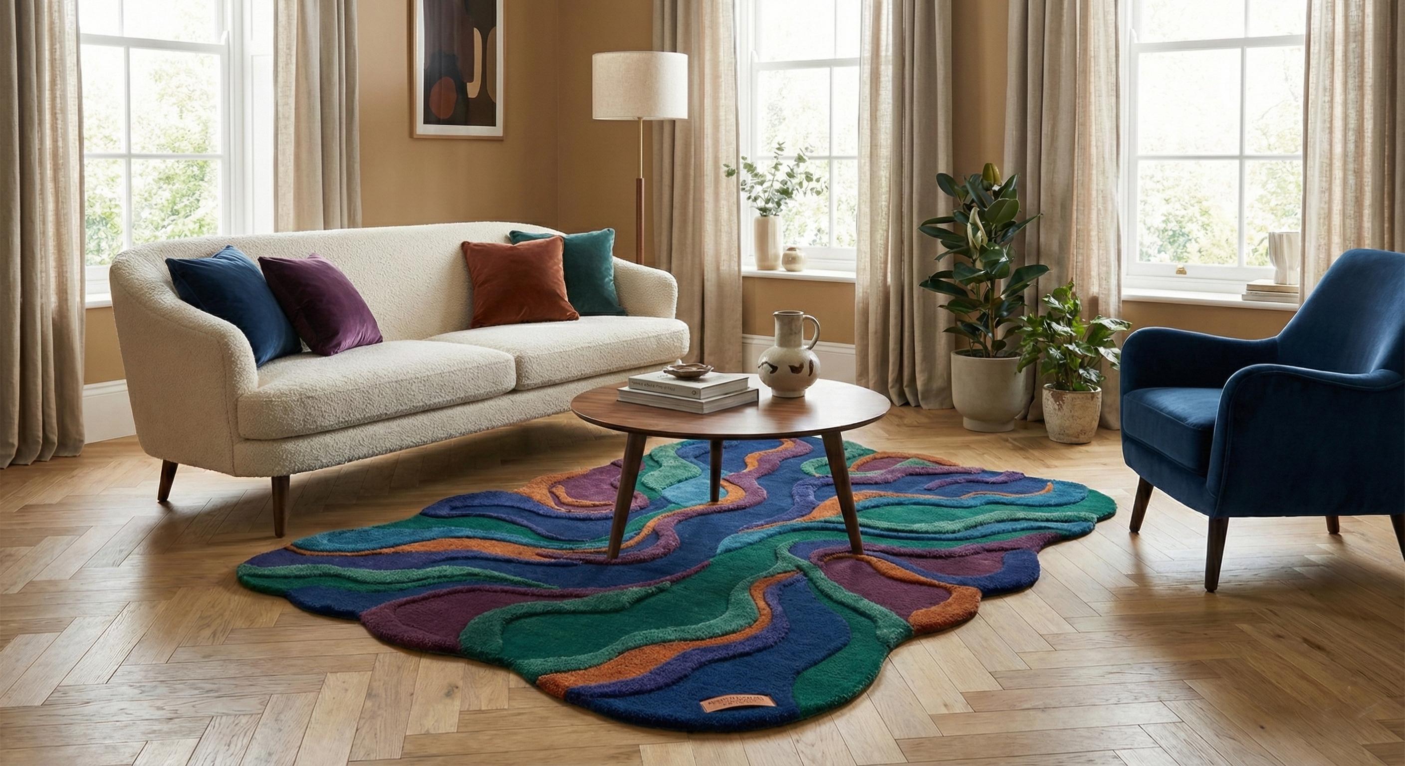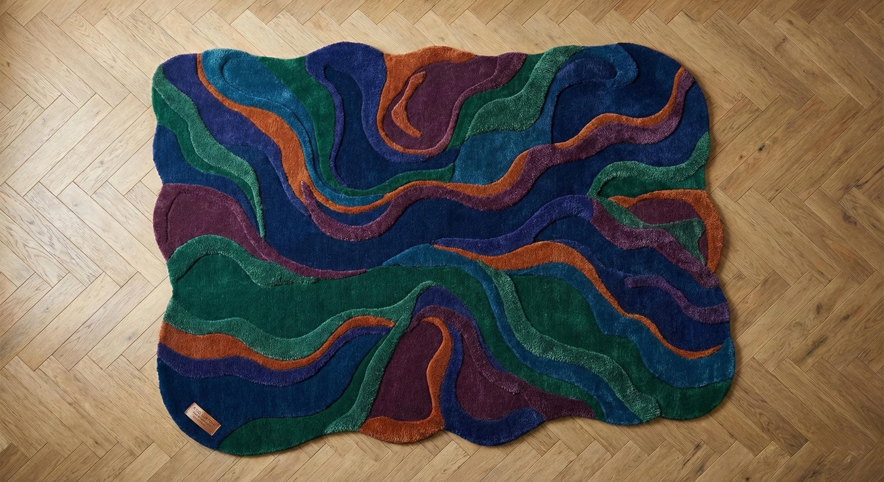 Make a bold statement with this stunning hand tufted abstract wool rug, designed to transform any modern interior into a work of art. Featuring a unique irregular shape and flowing layered pattern in rich shades of deep blue, emerald green, purple, and warm rust tones, this rug adds depth, texture, and personality to your living space.