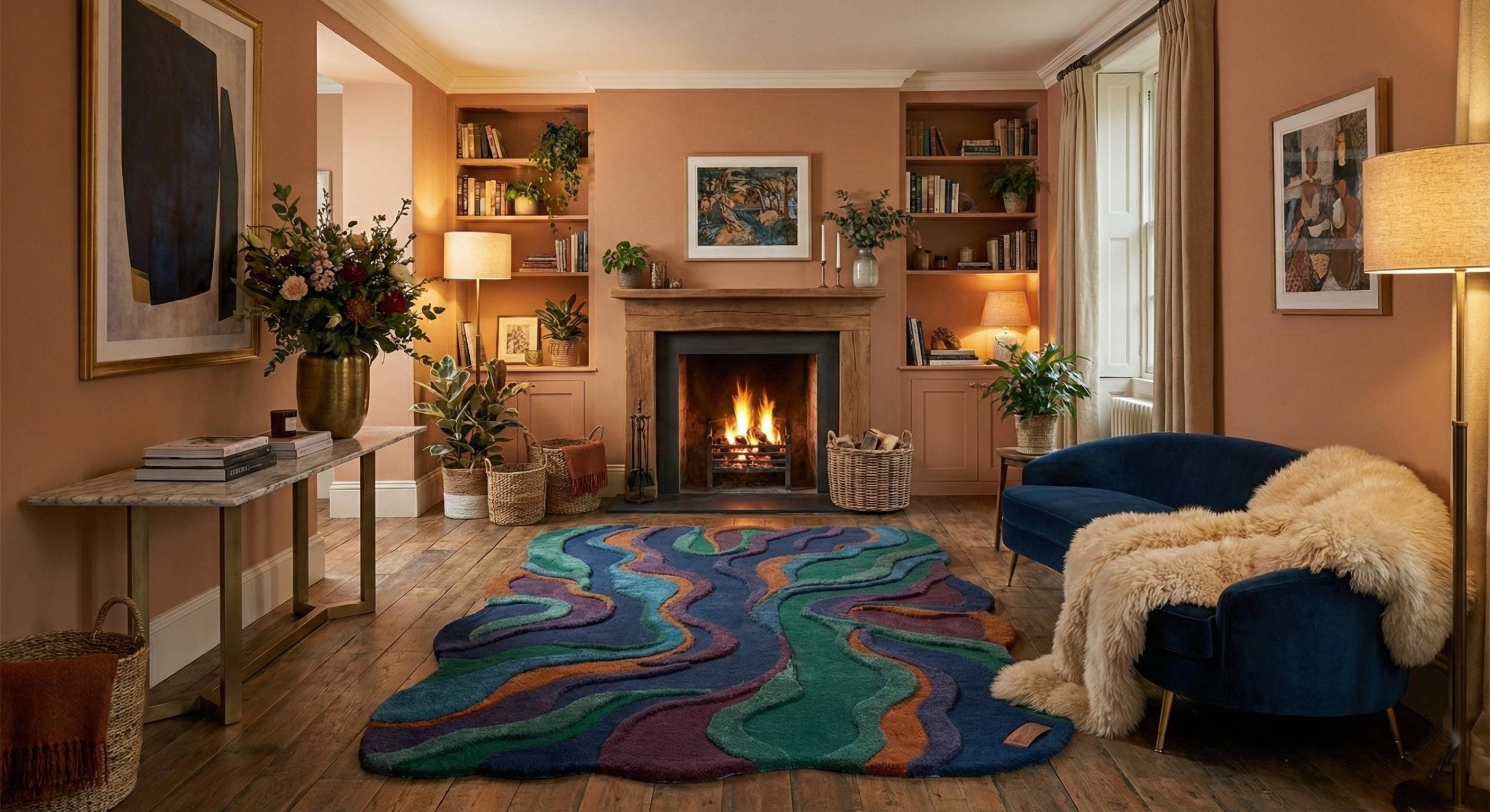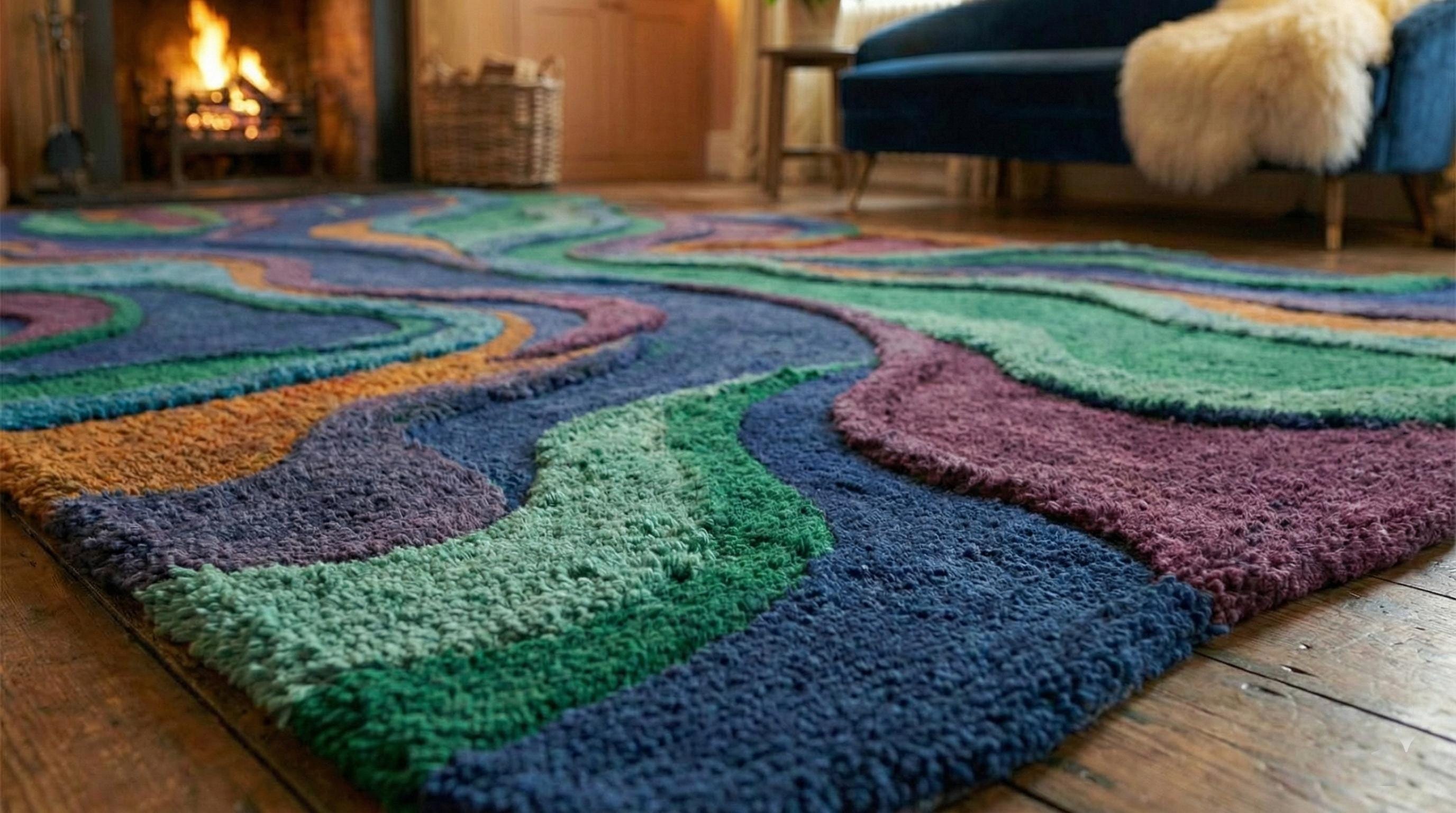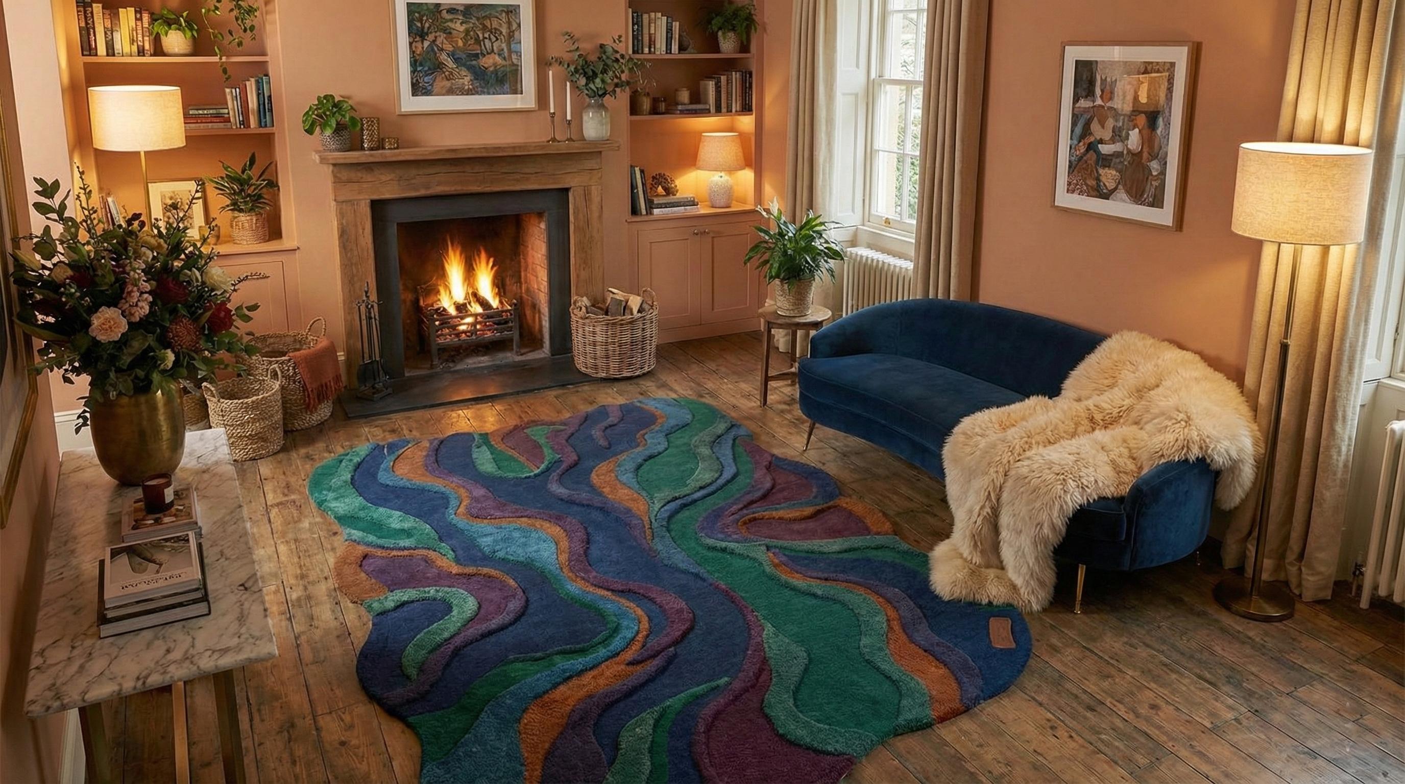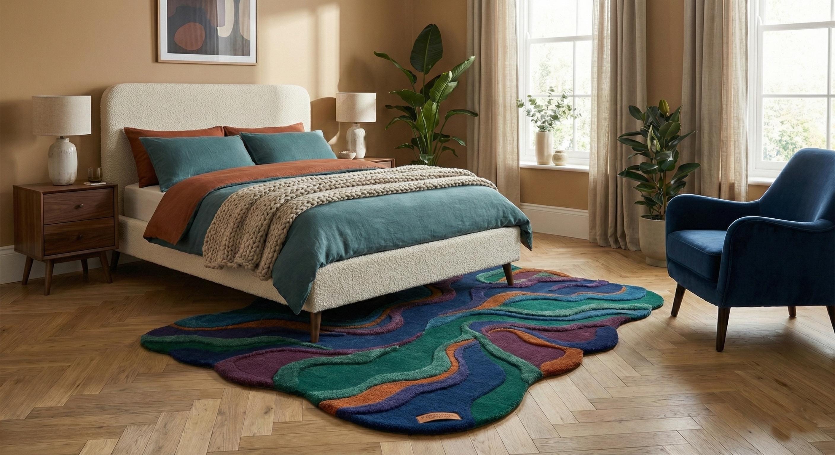 Make a bold statement with this stunning hand tufted abstract wool rug, designed to transform any modern interior into a work of art. Featuring a unique irregular shape and flowing layered pattern in rich shades of deep blue, emerald green, purple, and warm rust tones, this rug adds depth, texture, and personality to your living space.