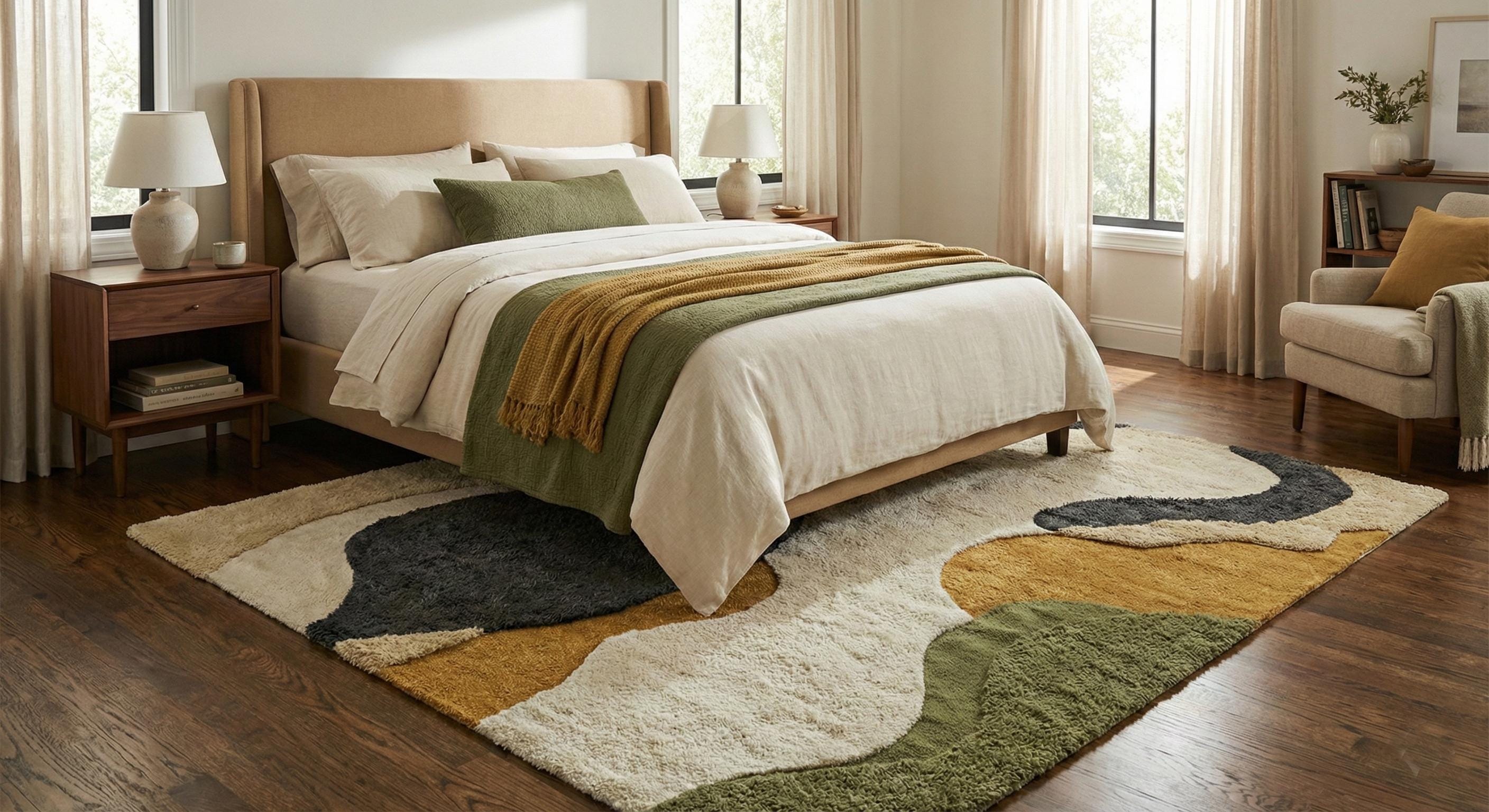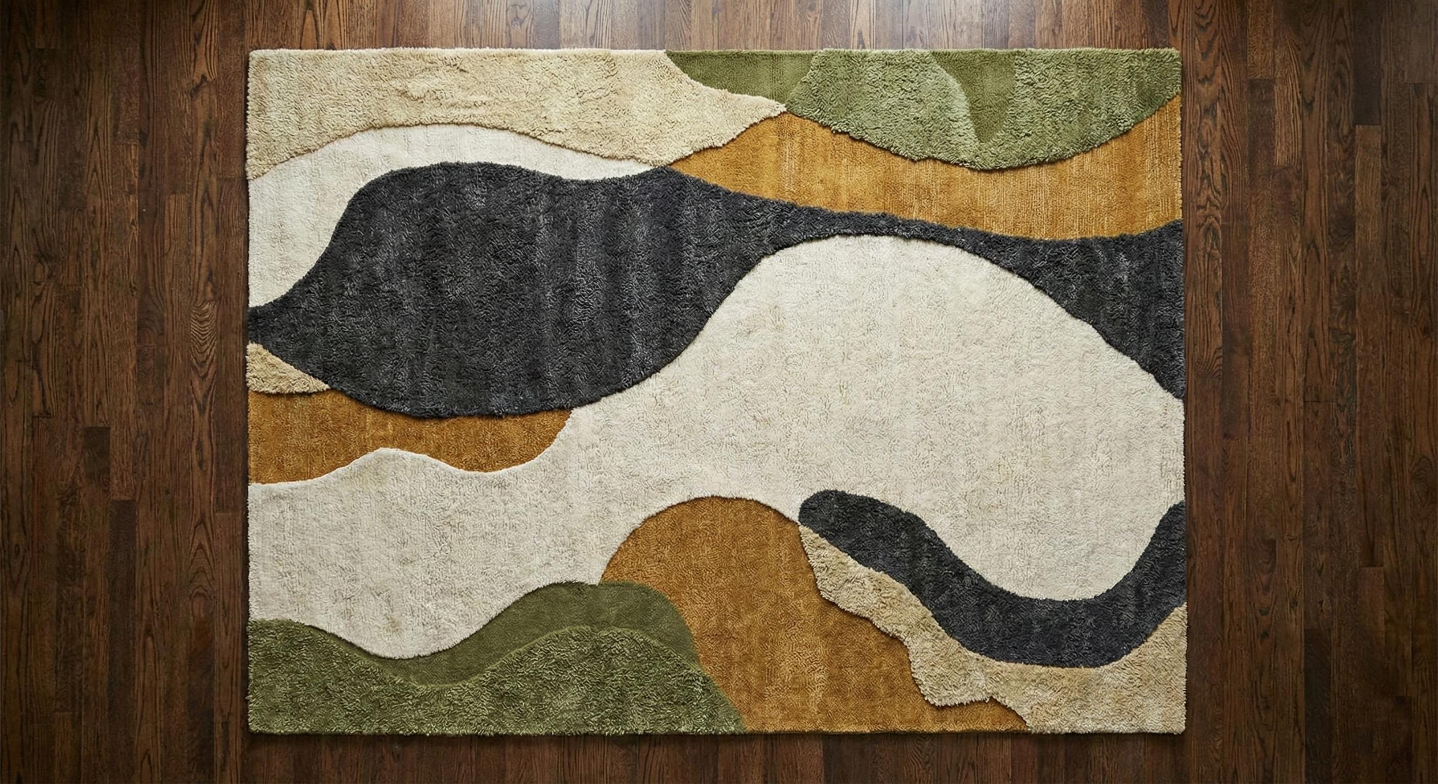 Hand Tufted Wool Area Rug – Abstract Modern Green, Gold & Cream