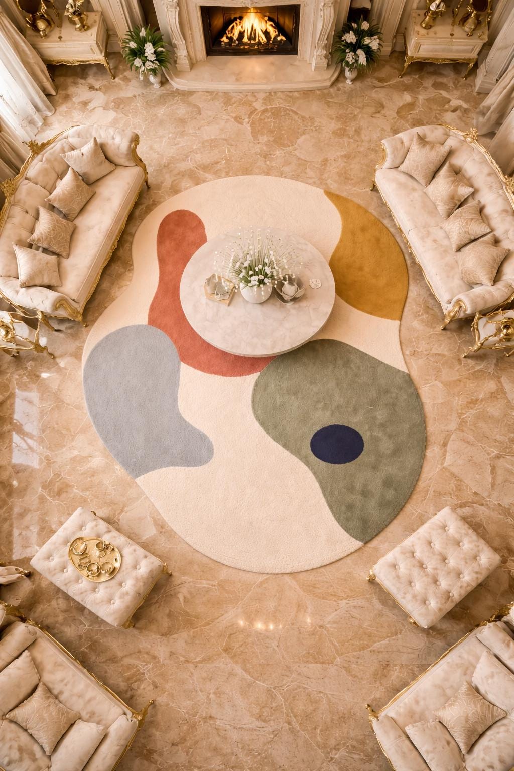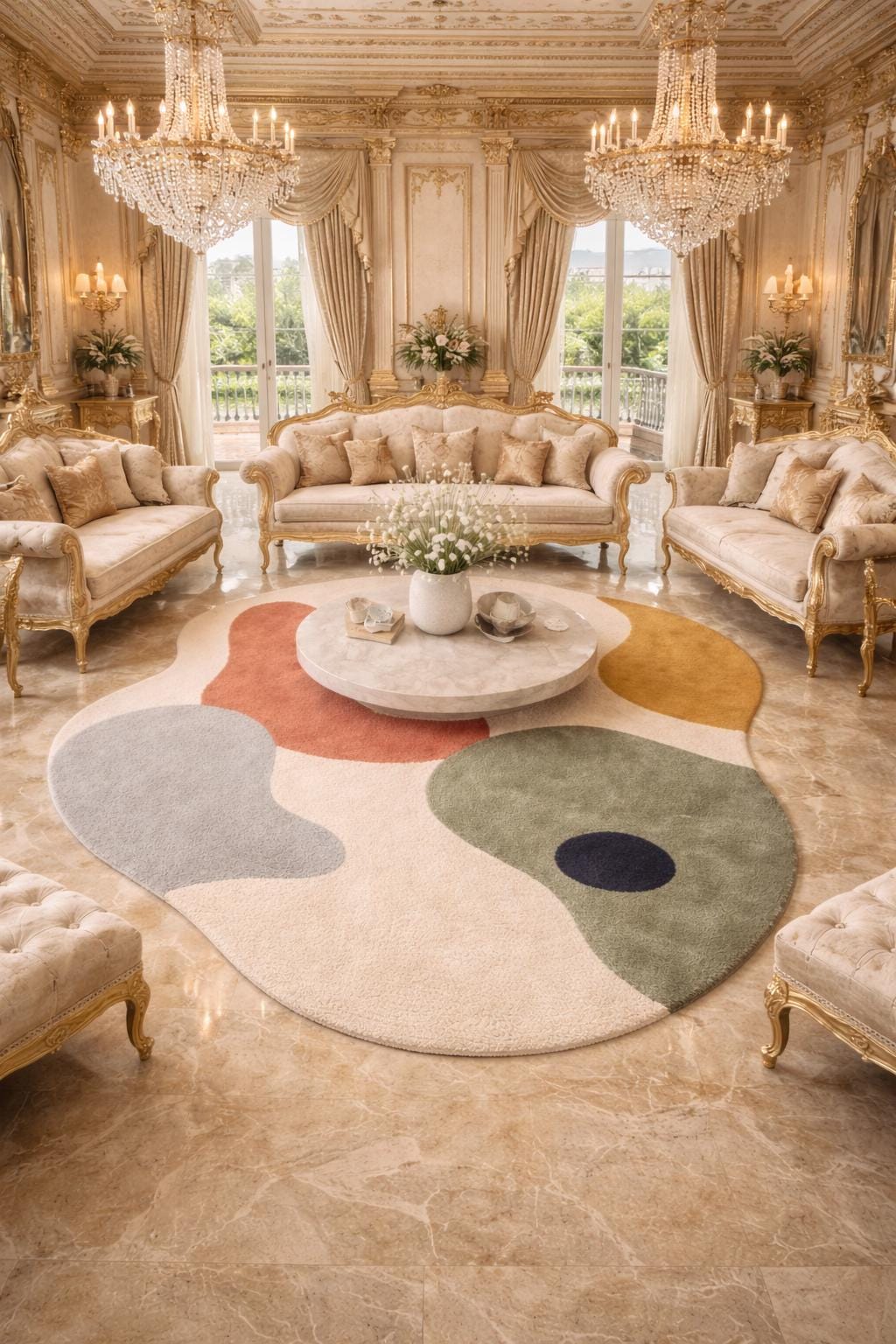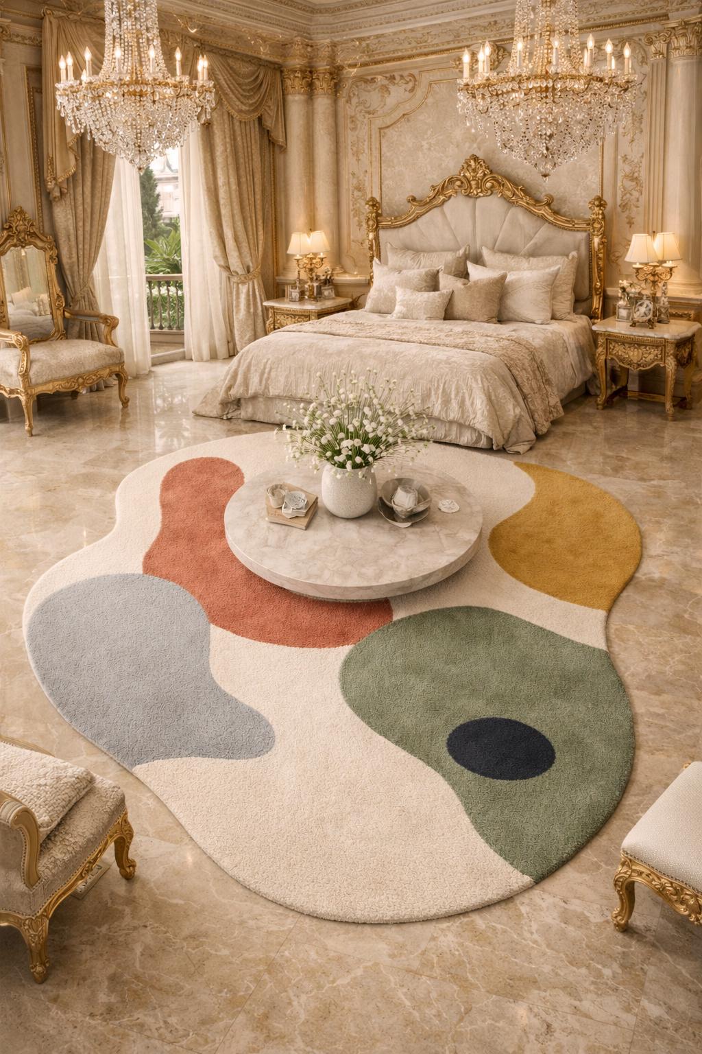This irregular-shaped rug is inspired by modern art and palace-style décor, making it an eye-catching centerpiece for living rooms, bedrooms, entryways, or cozy lounge areas. The plush wool pile provides exceptional softness, durability, and warmth underfoot while maintaining a sophisticated high-end aesthetic.