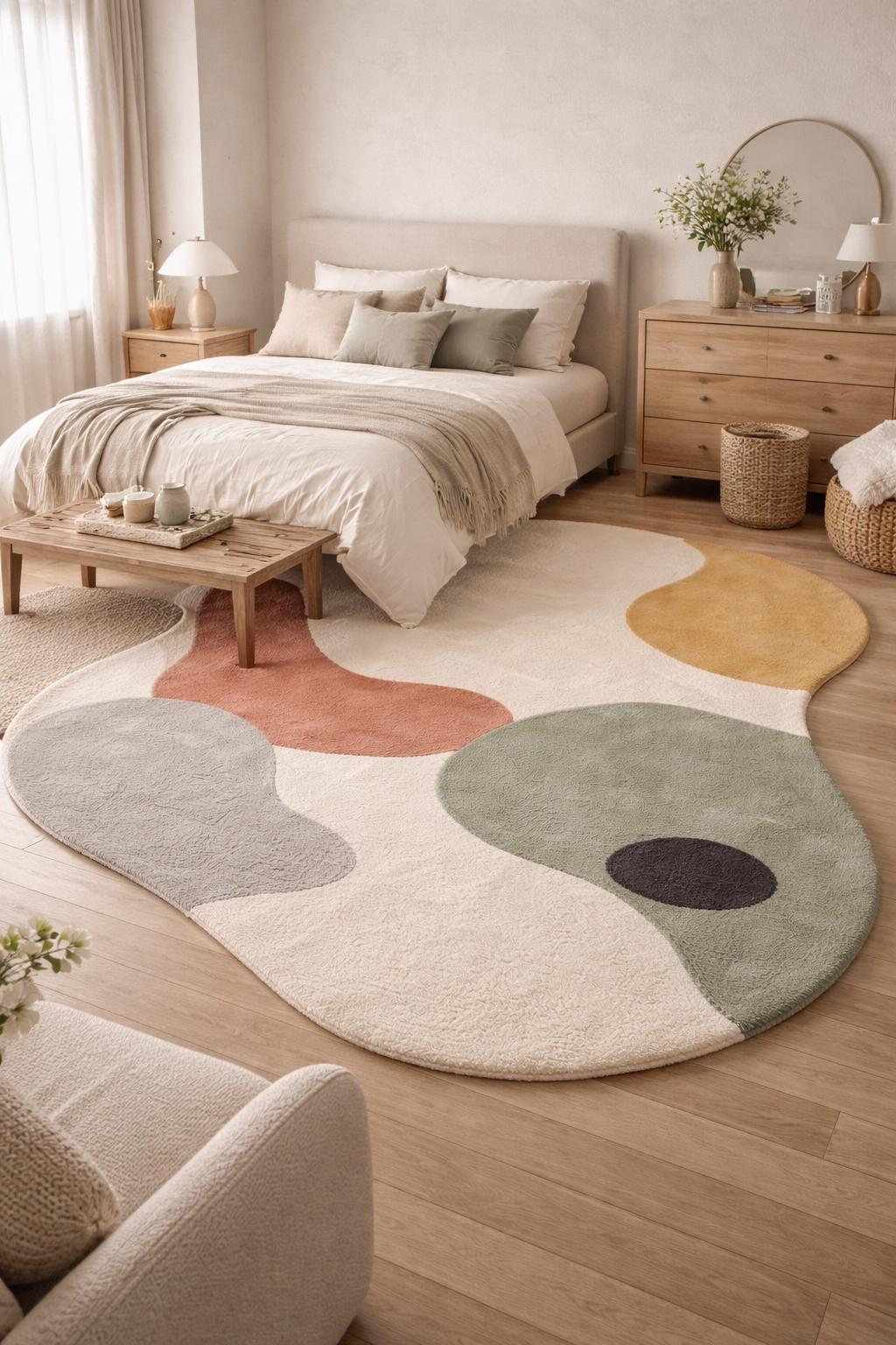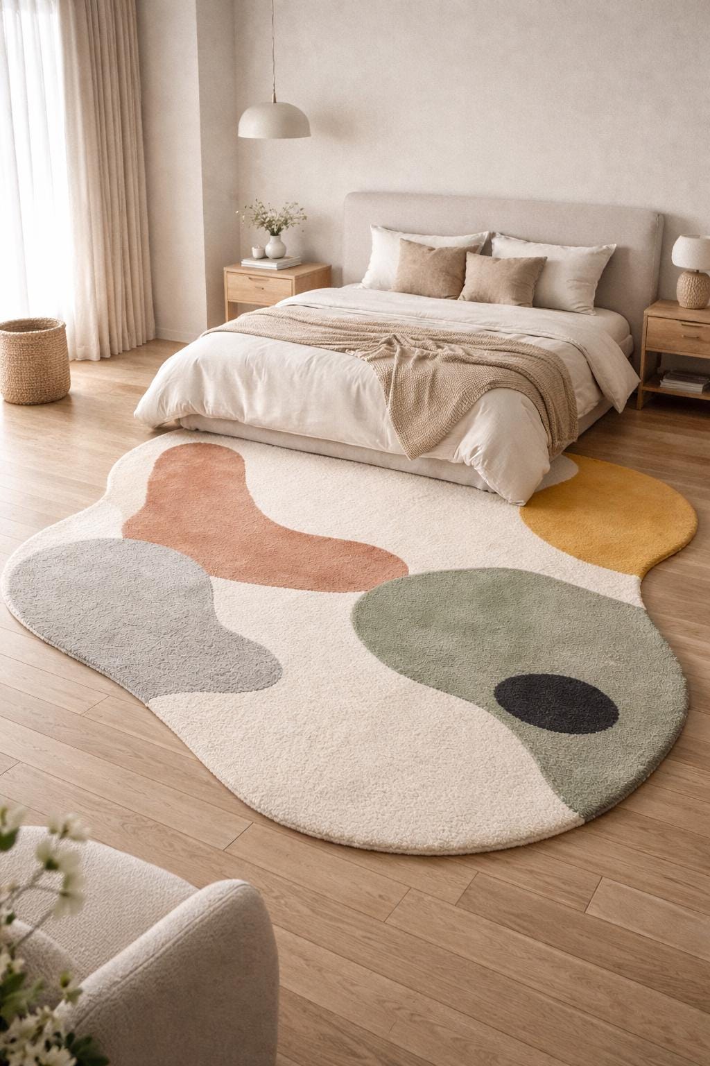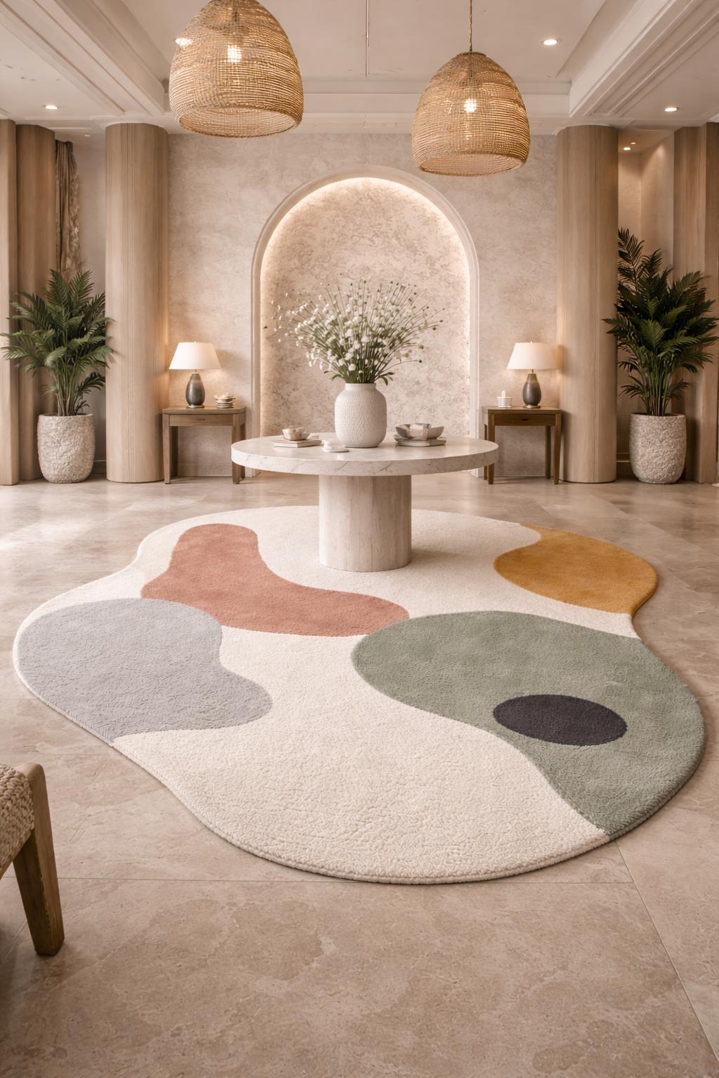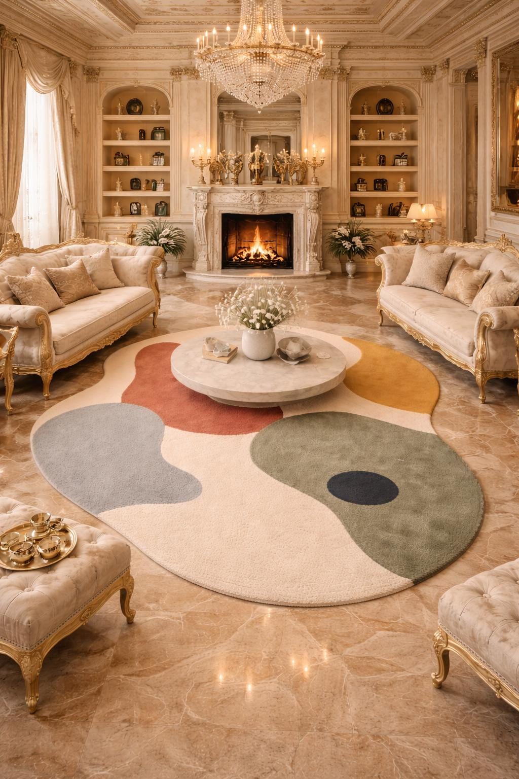 This irregular-shaped rug is inspired by modern art and palace-style décor, making it an eye-catching centerpiece for living rooms, bedrooms, entryways, or cozy lounge areas. The plush wool pile provides exceptional softness, durability, and warmth underfoot while maintaining a sophisticated high-end aesthetic.