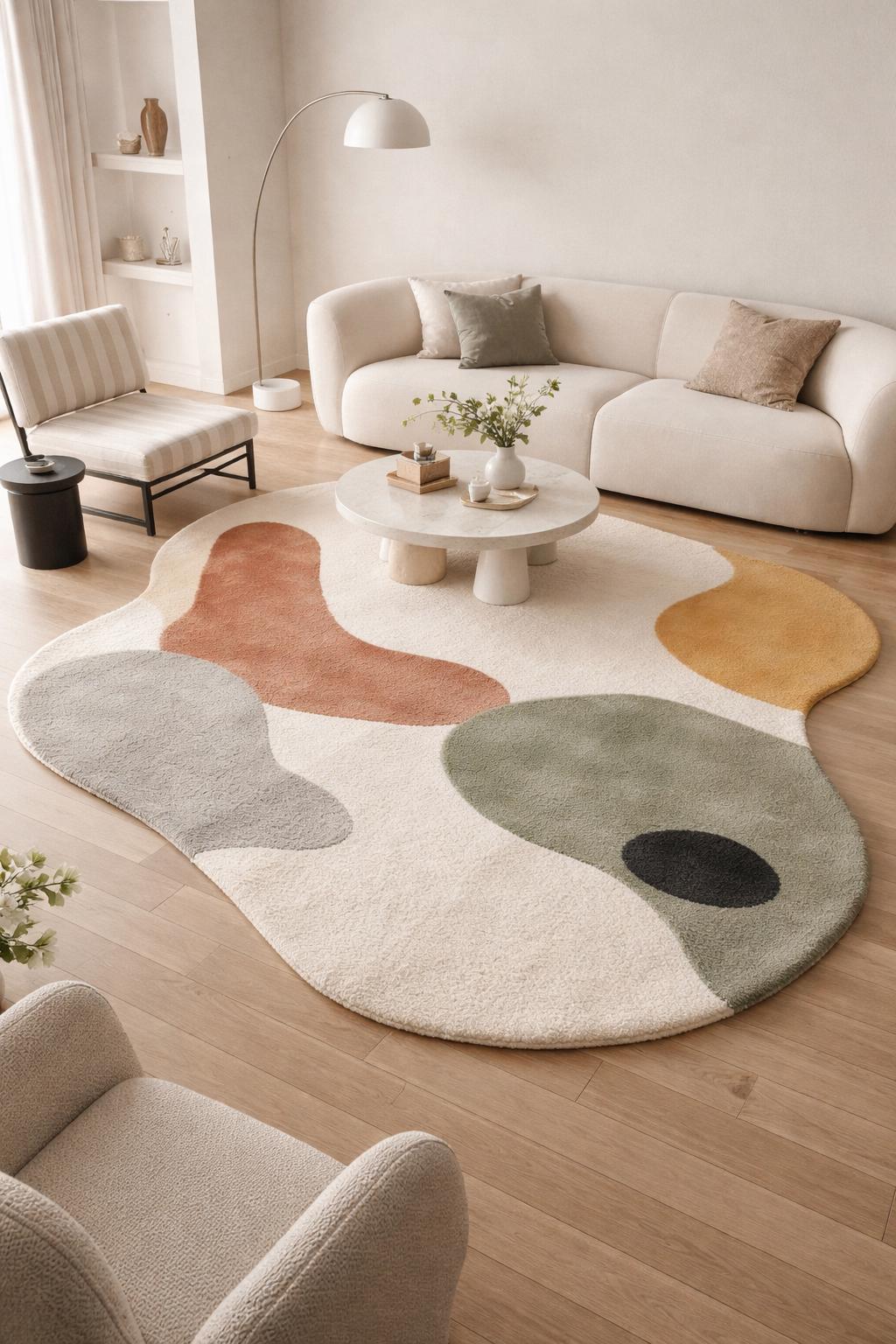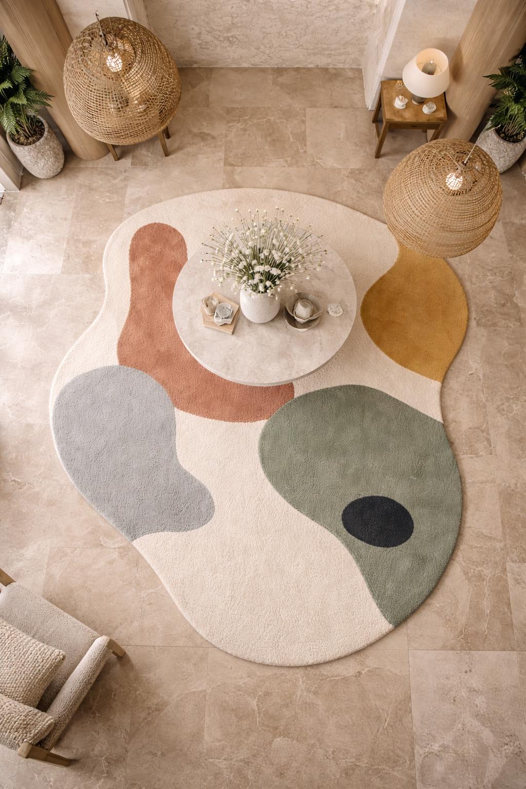 Elevate your interior with this luxurious handmade hand-tufted abstract rug, designed to bring elegance and modern artistry into your living space. Crafted from premium quality wool, this designer rug features a unique organic shape with soothing neutral tones of ivory, terracotta, sage green, mustard, and soft grey—perfect for contemporary and luxury interiors.