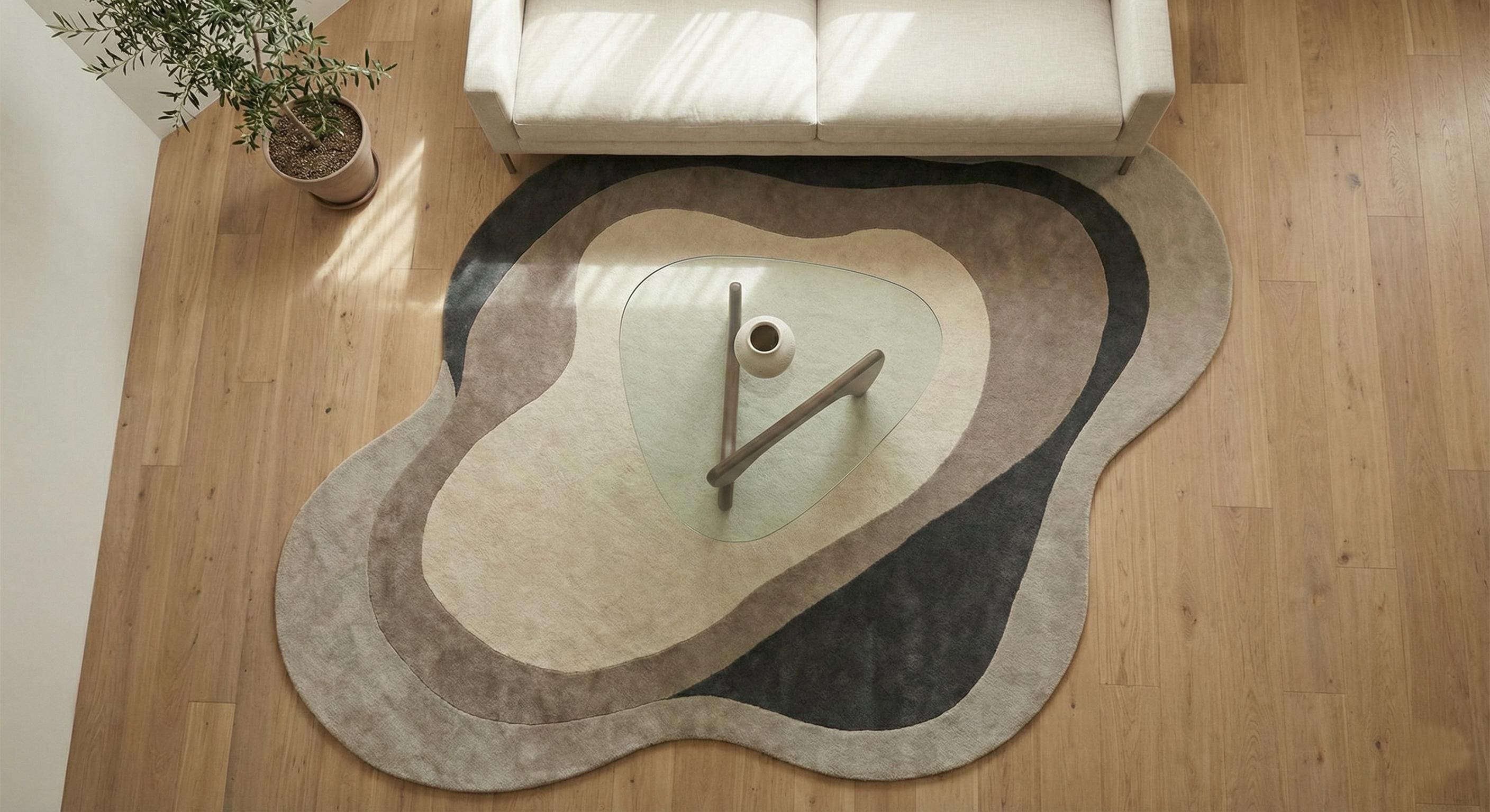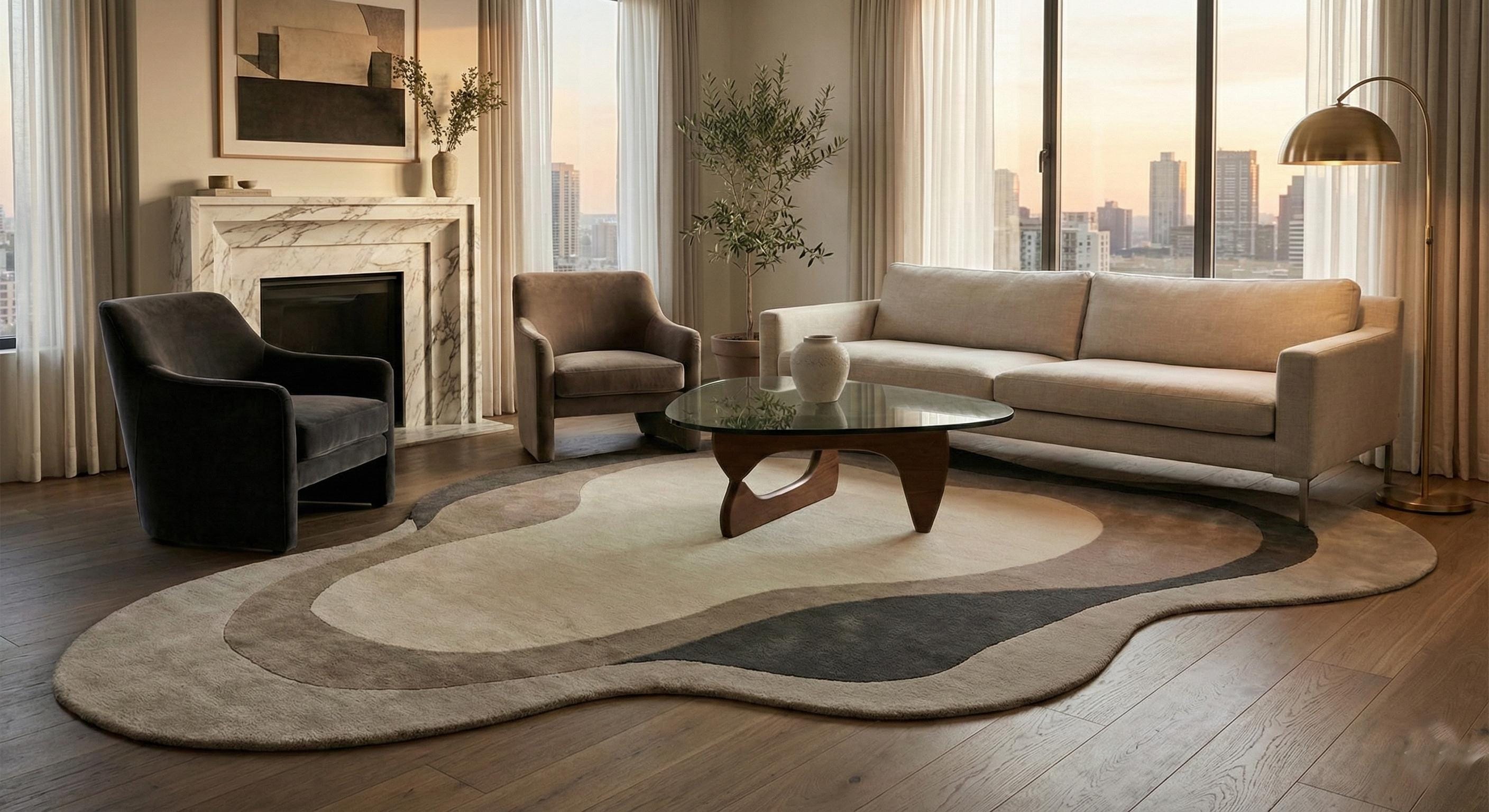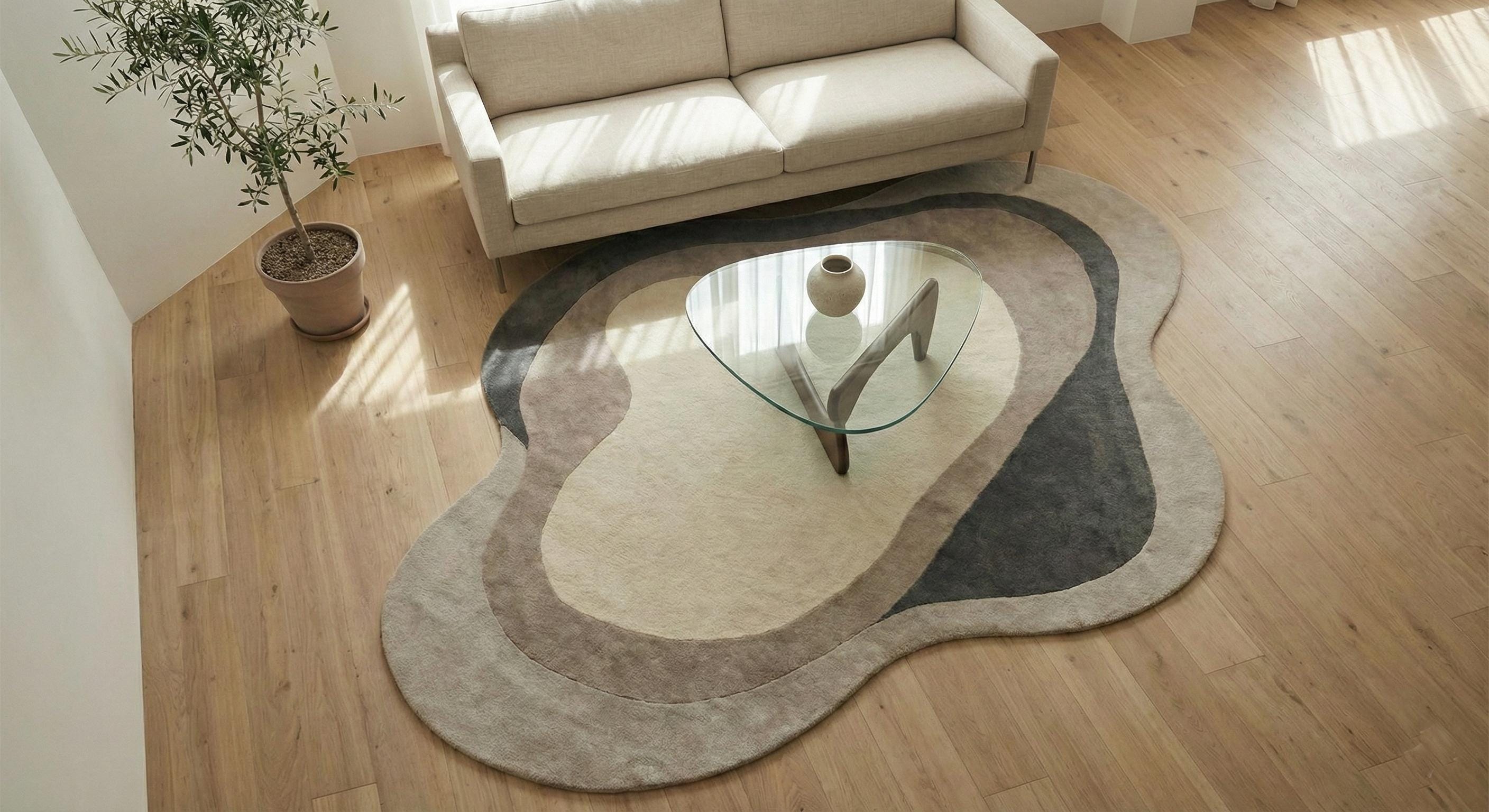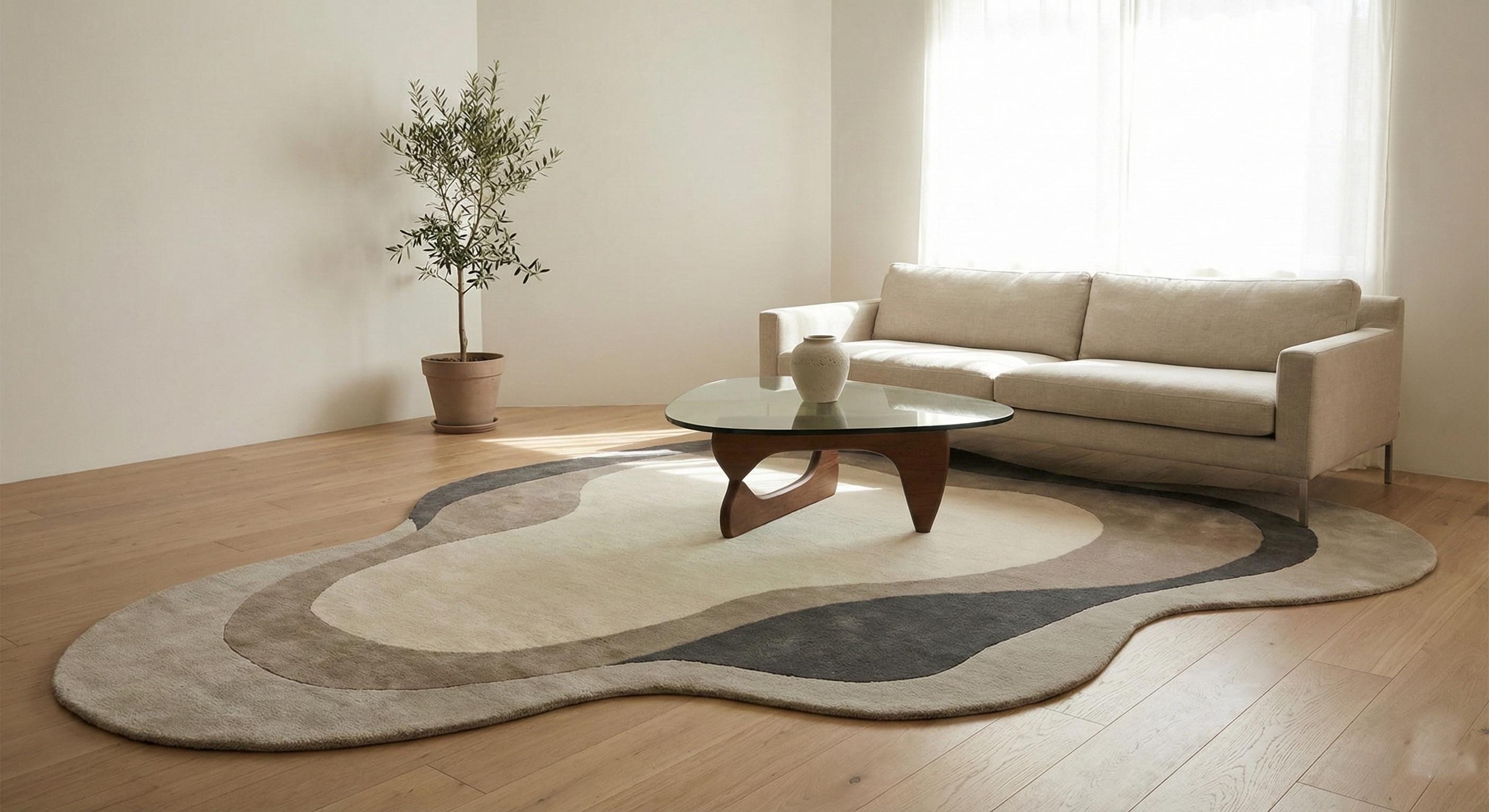 Elevate your space with this Luxury Irregular Hand Tufted Wool Rug, designed to bring elegance, warmth, and modern sophistication into your home. Featuring a unique abstract oval shape with soft flowing curves in neutral beige, cream, and deep blue tones, this rug creates a statement without overpowering your décor.