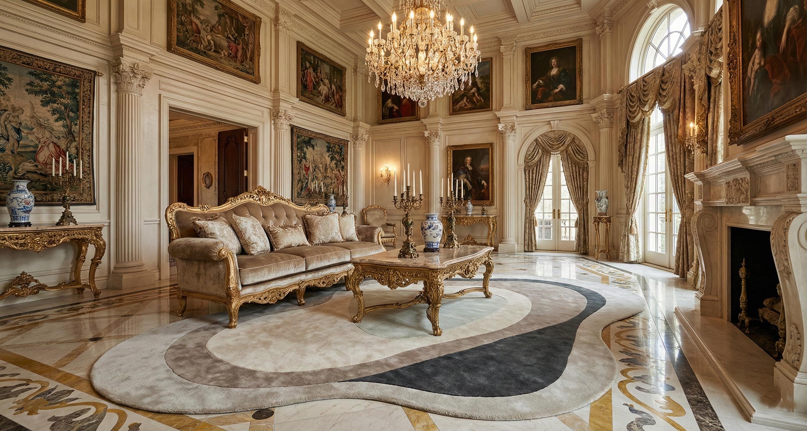 The calming neutral tones make it easy to pair with gold furniture, modern décor, classic interiors, or minimalist themes. The flowing layered pattern adds depth and artistic movement, making it more than just a rug — it’s a centerpiece.