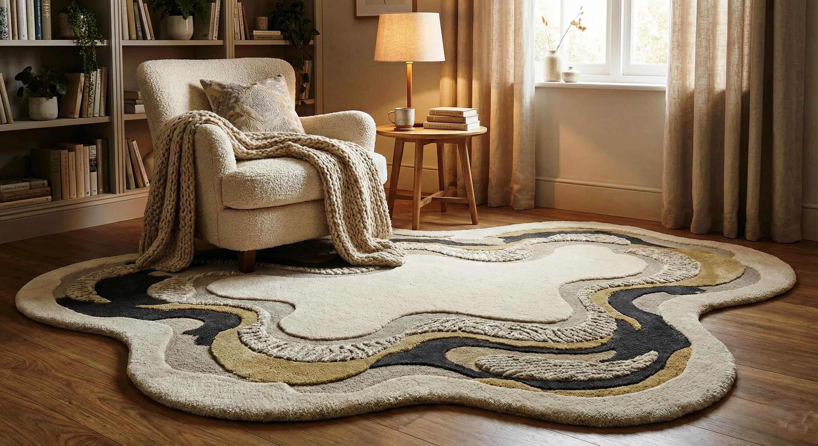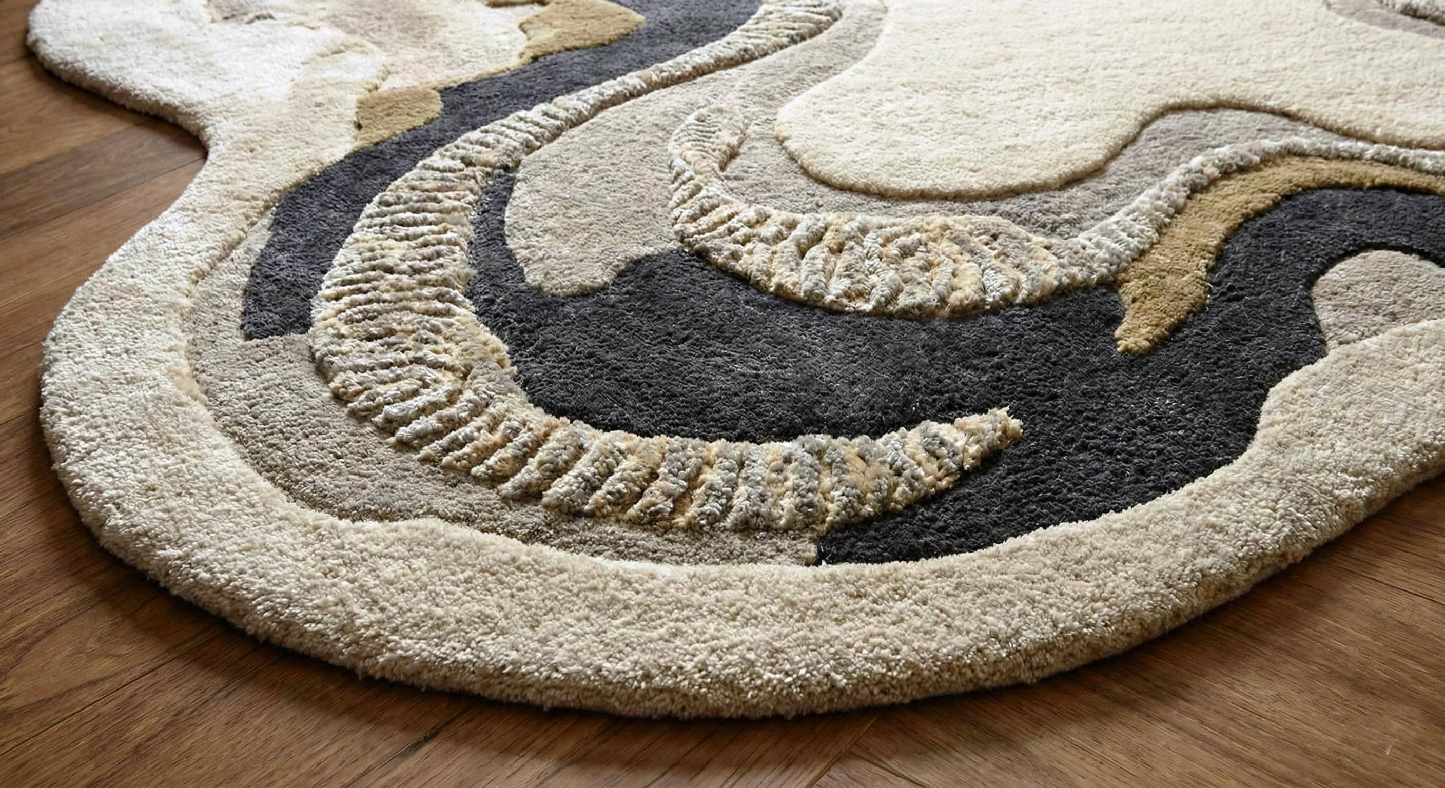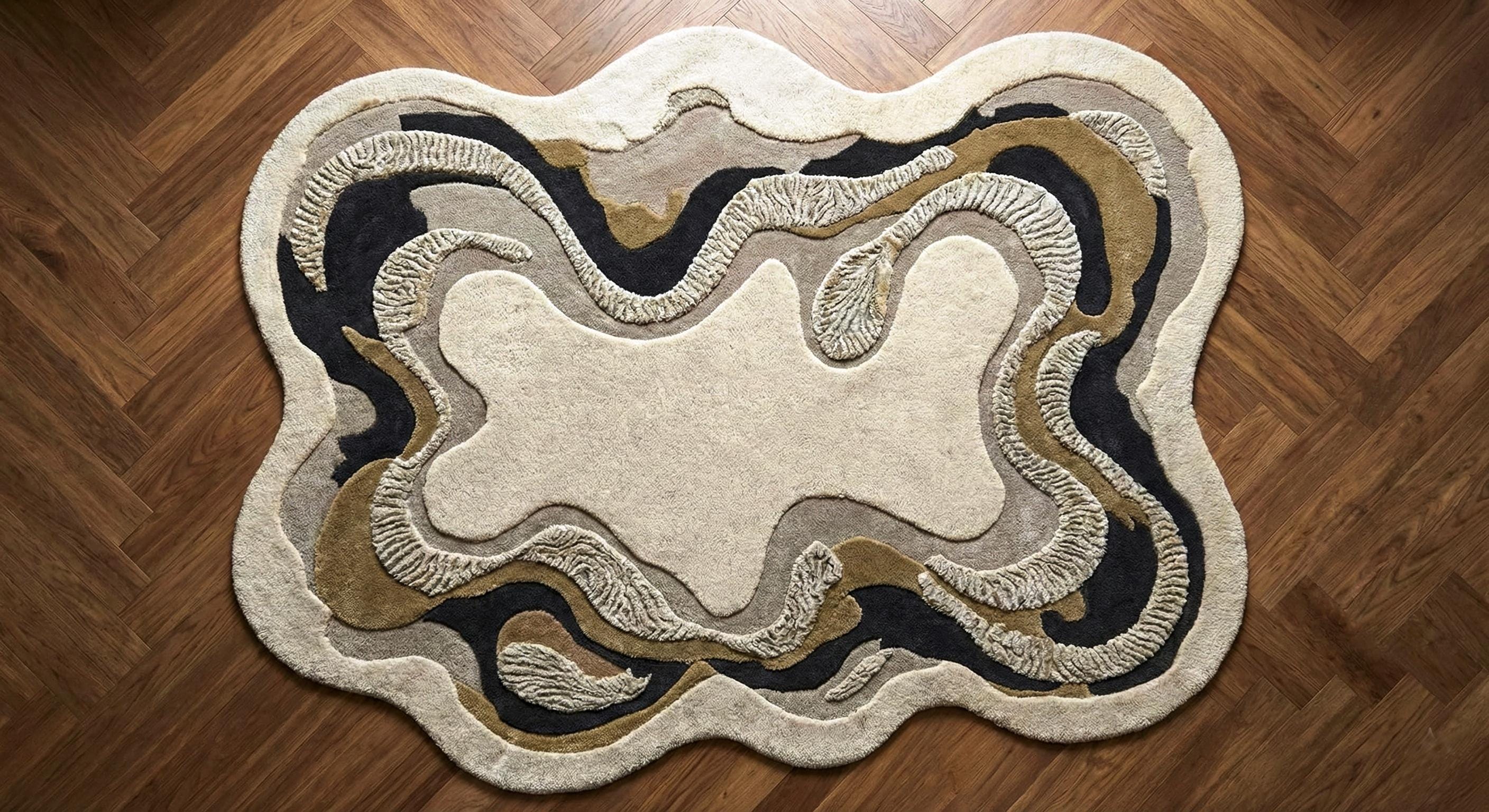 Irregular Abstract Wool Rug, Hand-Tufted Cream Black Gold Organic Carpet