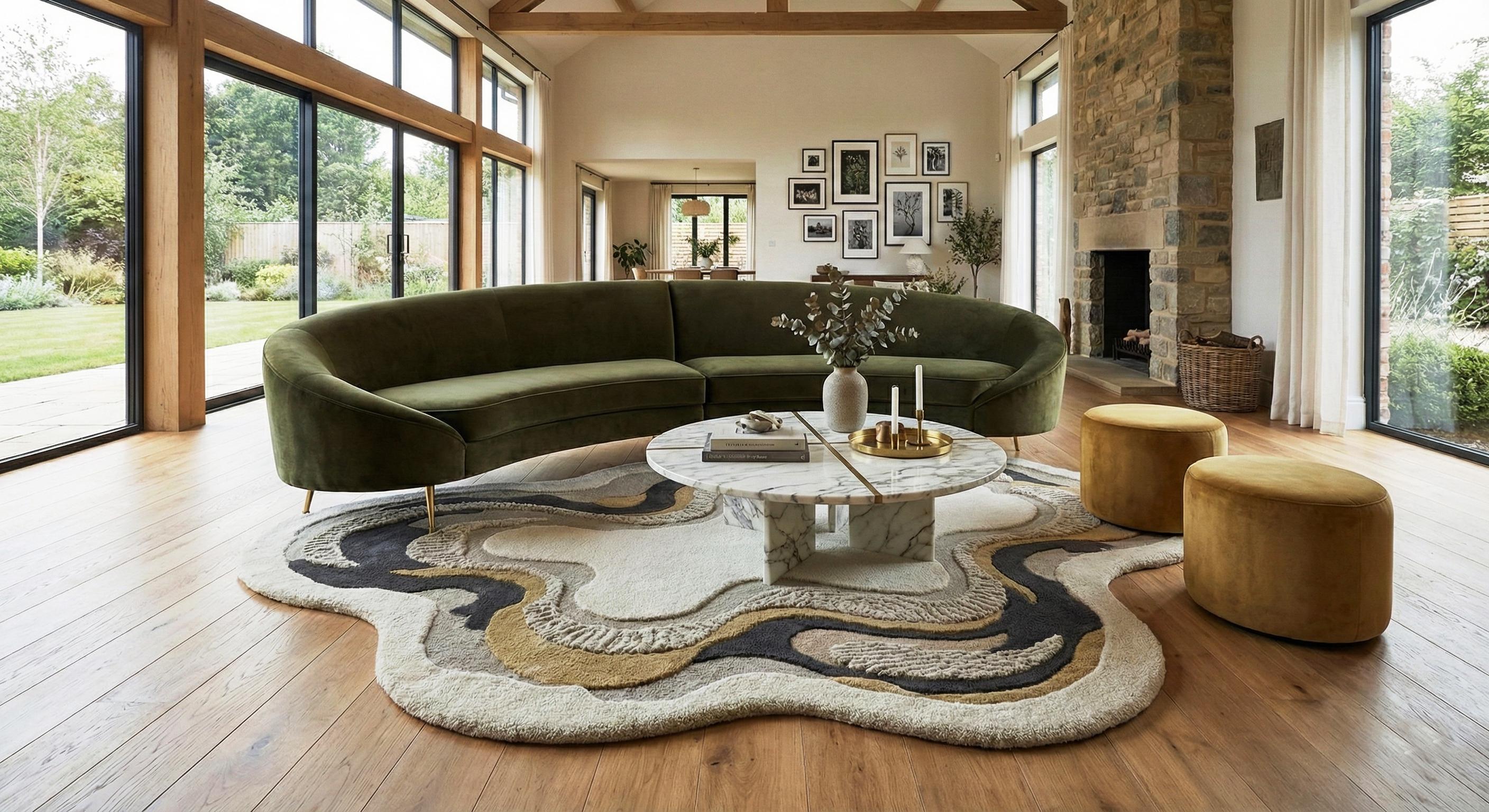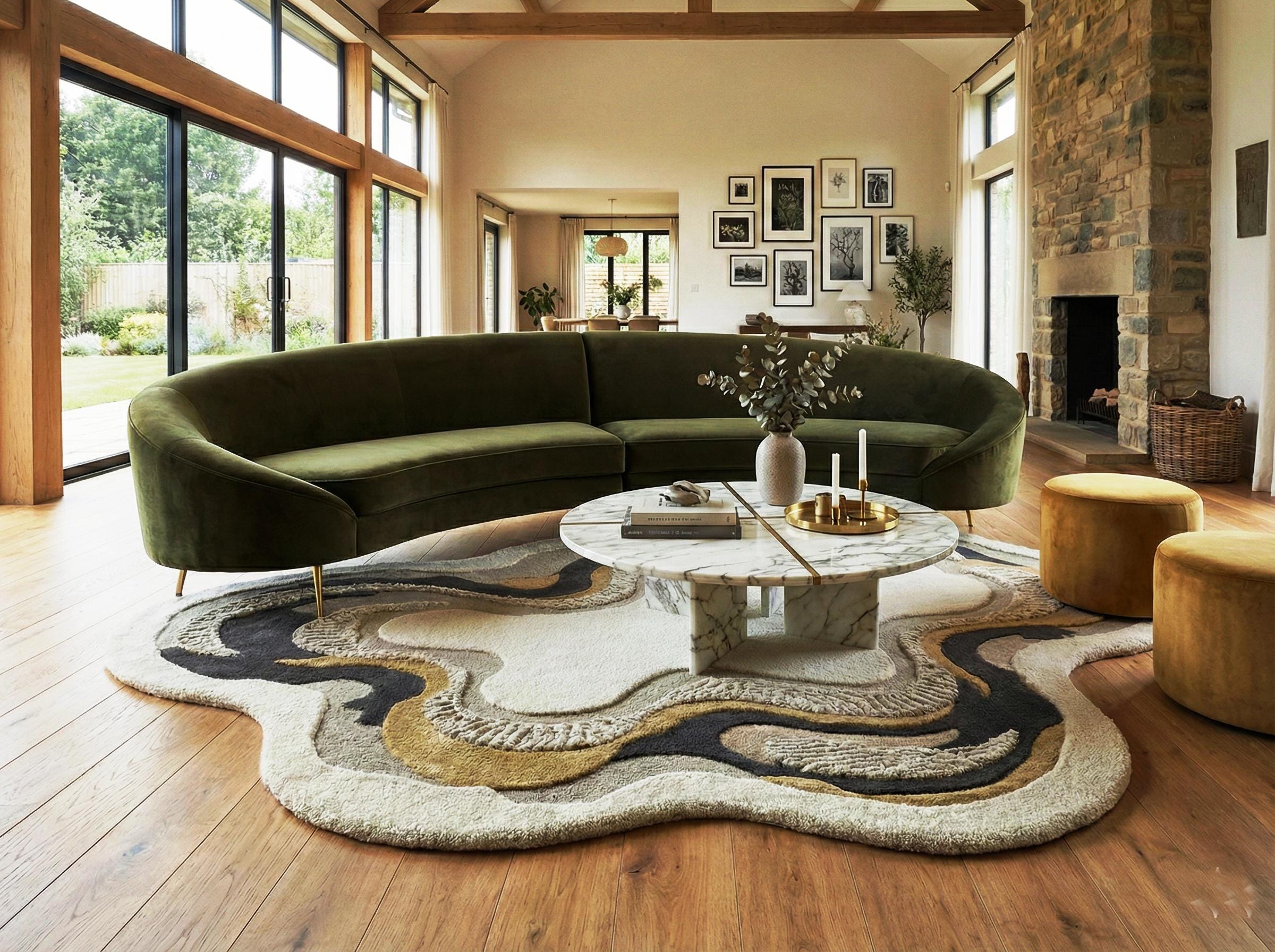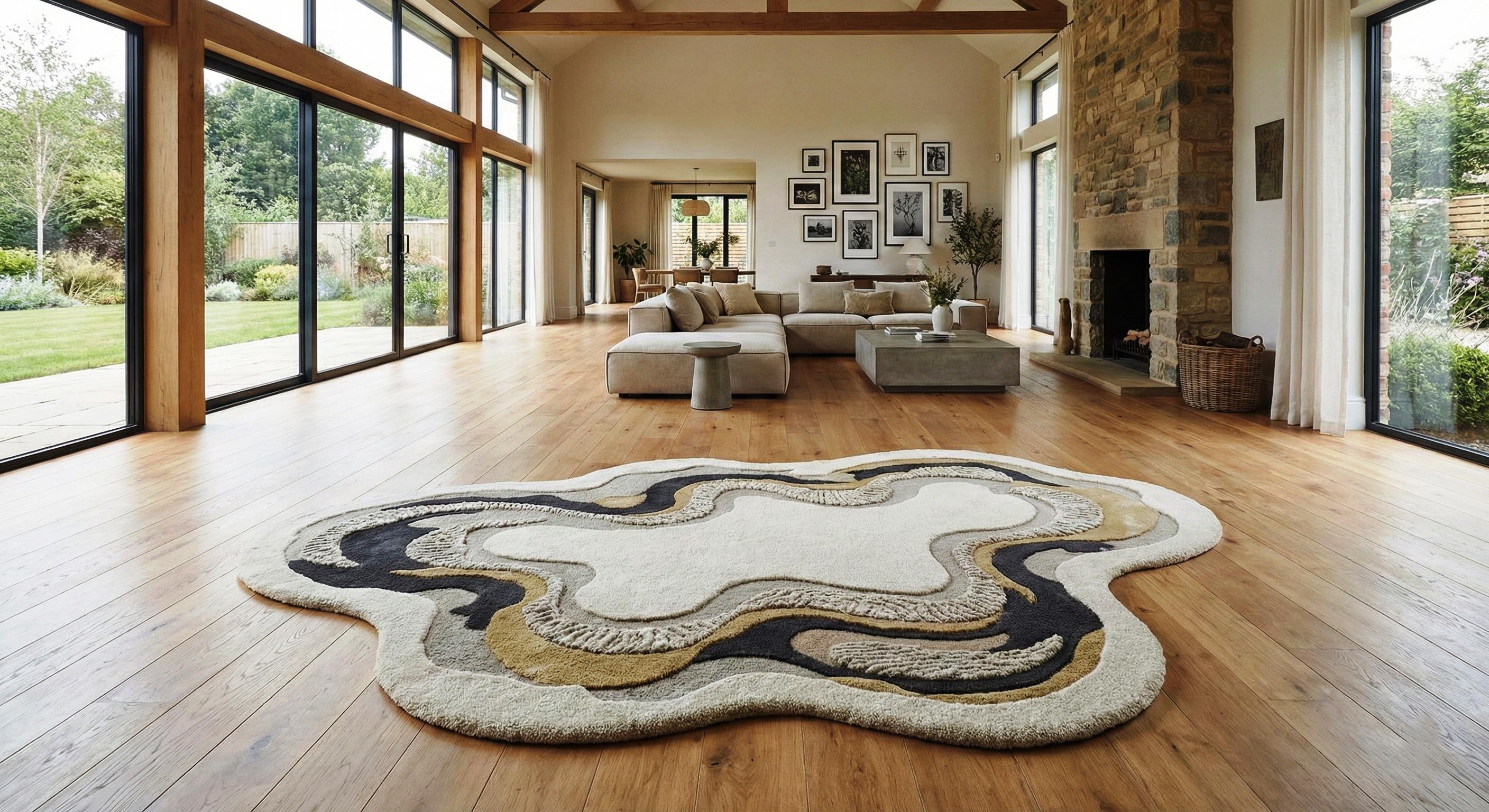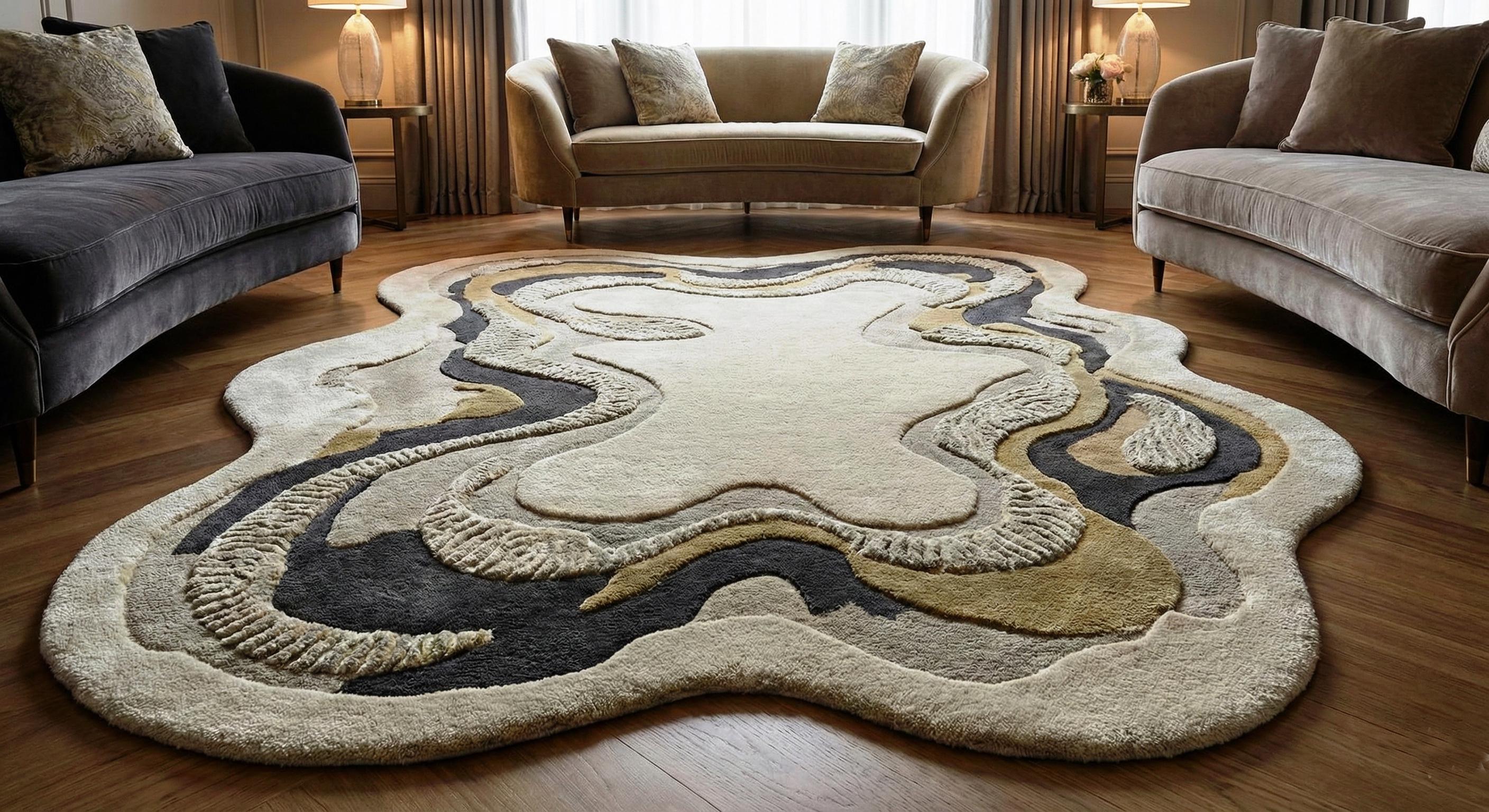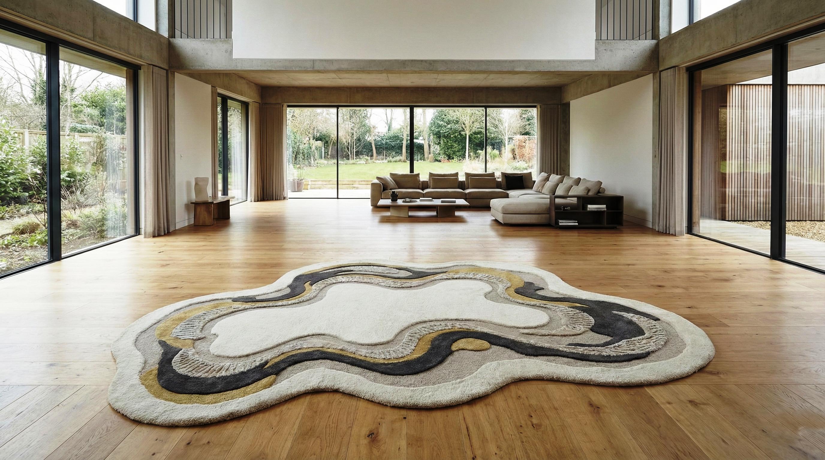 Perfect for modern, minimalist, contemporary, and luxury interiors, this statement rug pairs beautifully with curved sofas, marble tables, and natural wood flooring.