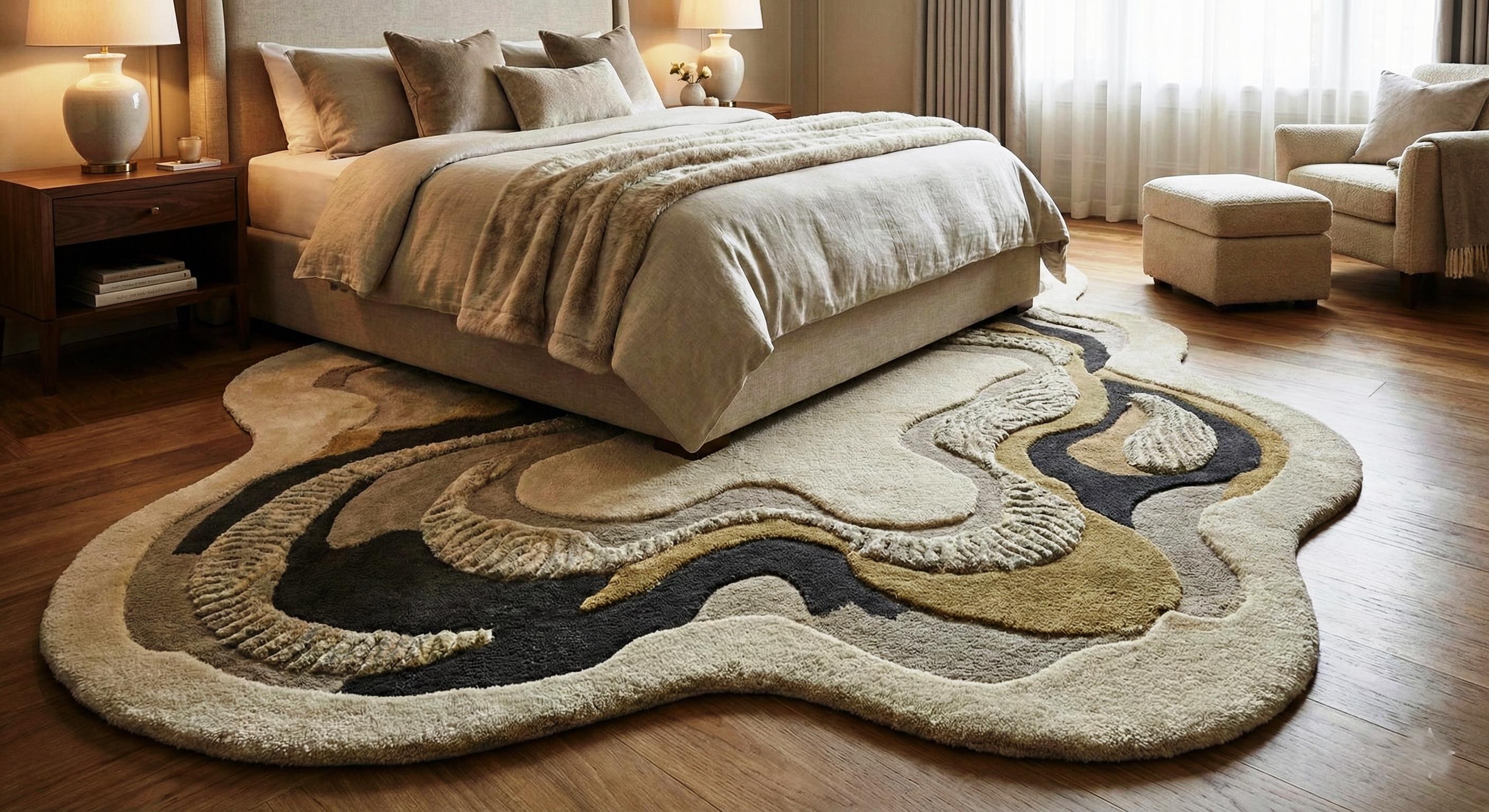 Elevate your interior with this stunning Irregular Abstract Hand-Tufted Wool Rug, designed to bring modern elegance and artistic flow into your space. Featuring a unique organic shape with cream, black, and gold abstract patterns, this rug creates a bold yet sophisticated focal point in any living room, bedroom, or lounge area.