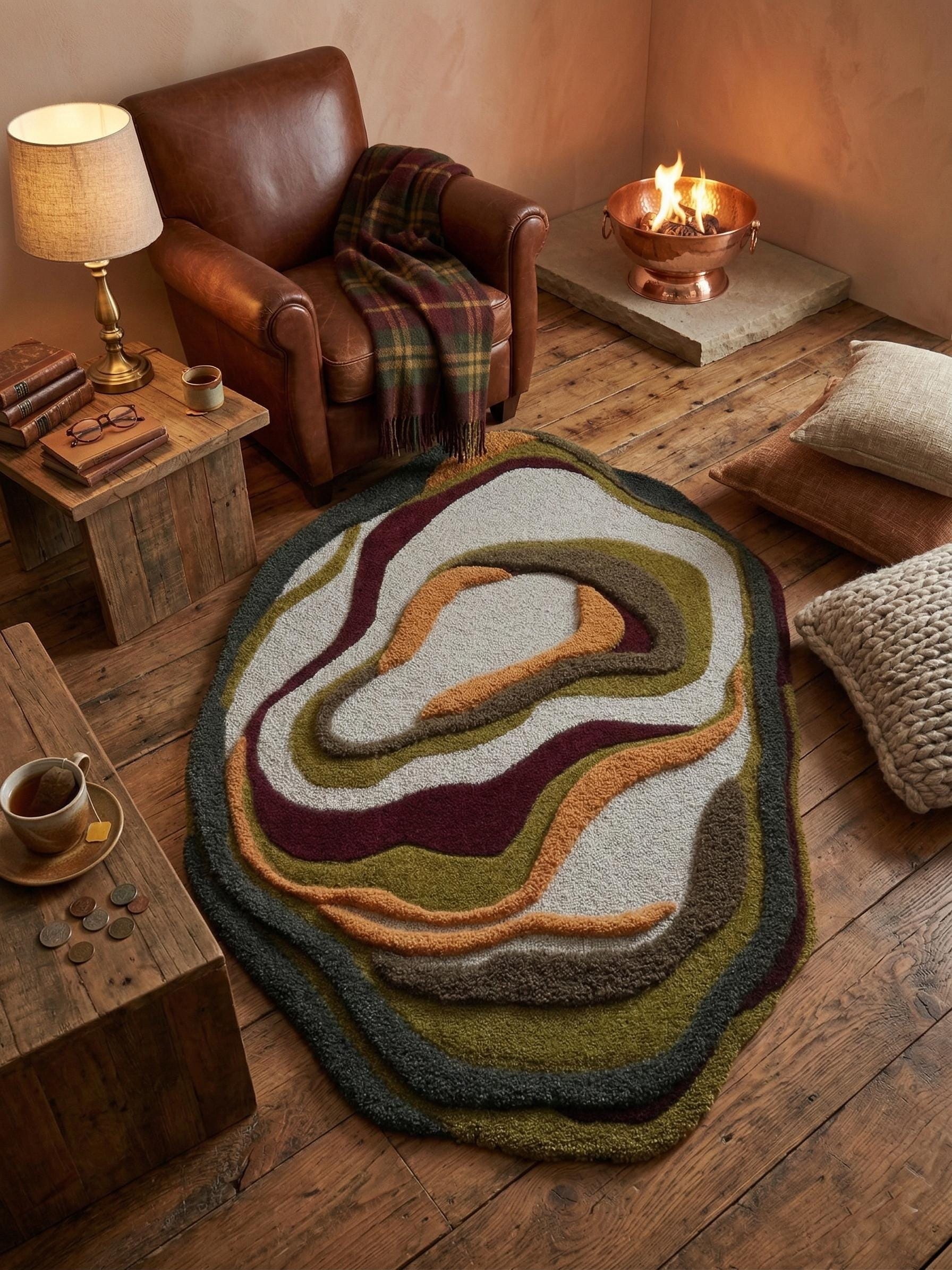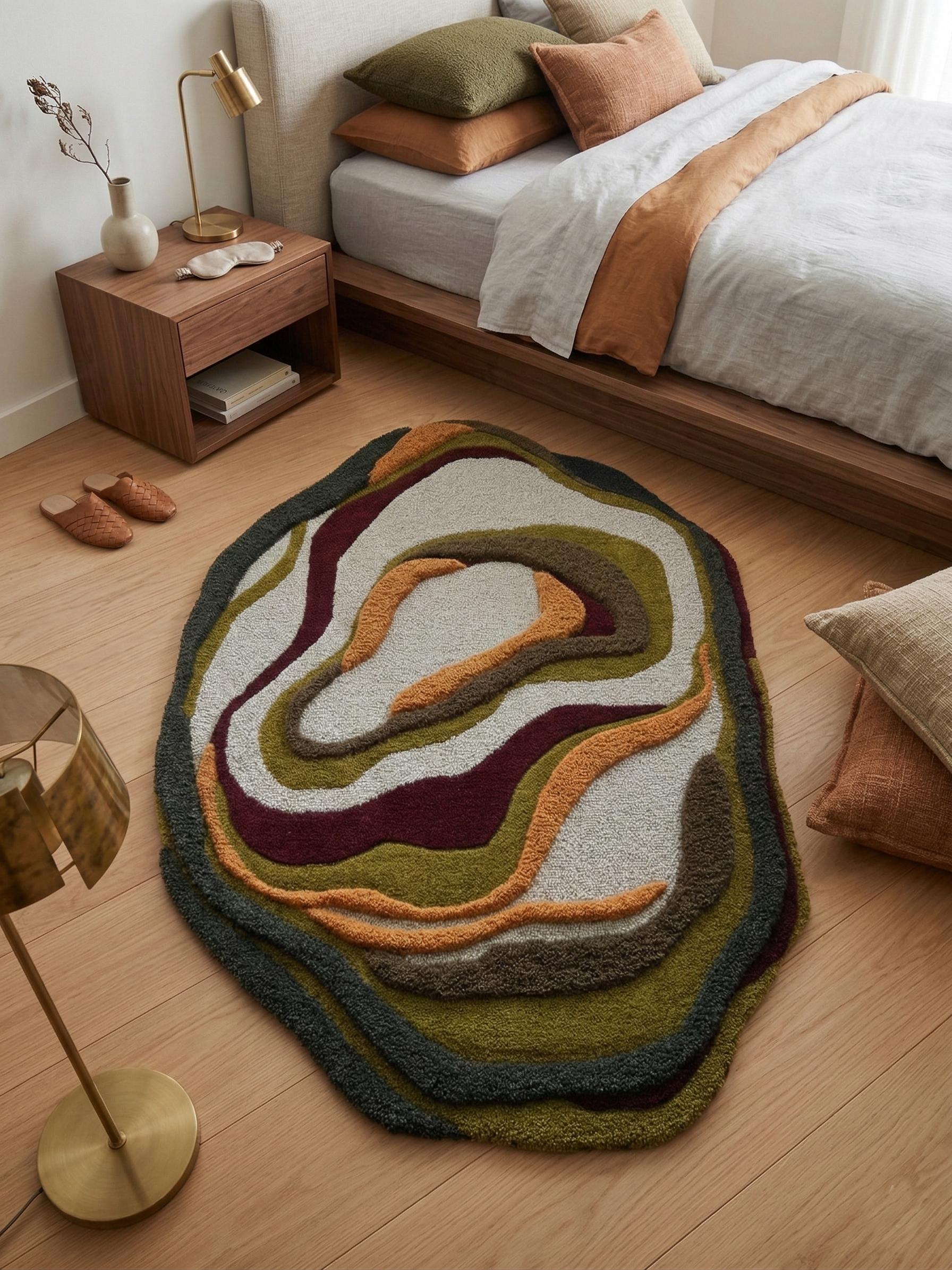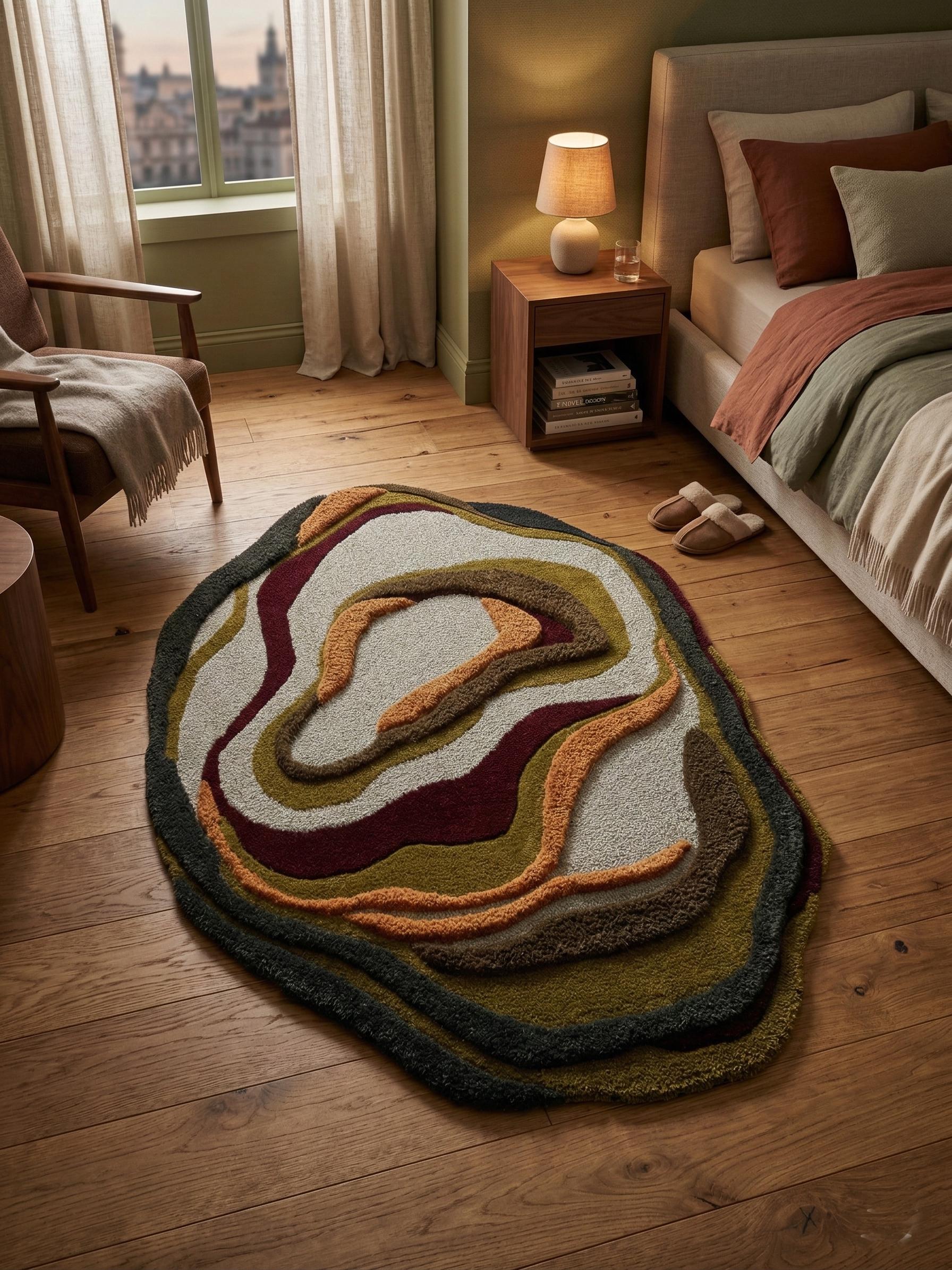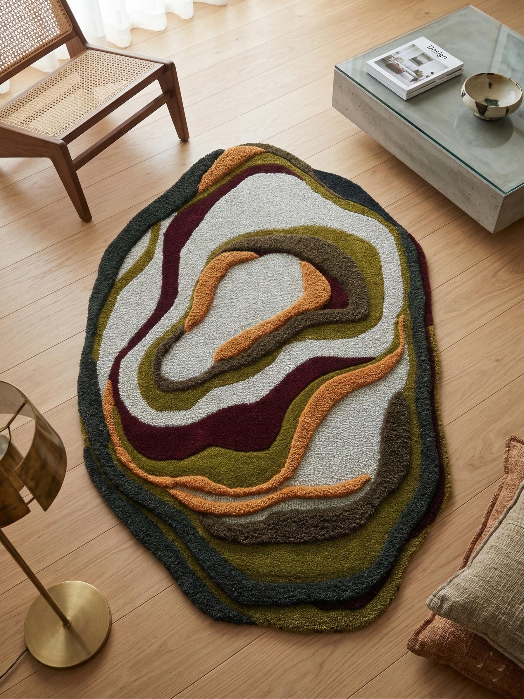 The abstract layered pattern features earthy green, mustard, brown, and burgundy tones, inspired by natural landscapes and organic forms. Its irregular shape softens rigid spaces and pairs beautifully with modern, minimalist, Scandinavian, and contemporary interiors.
