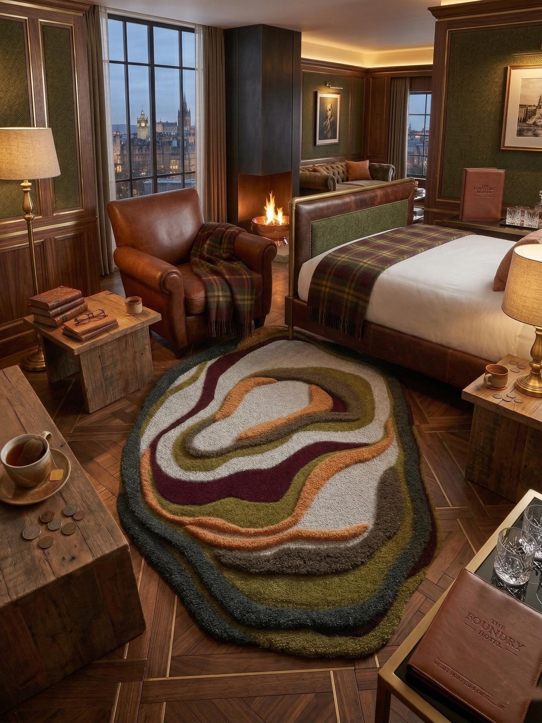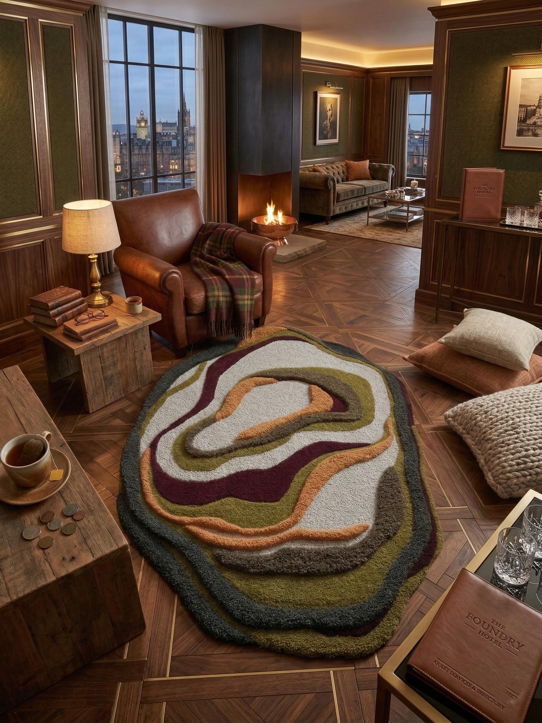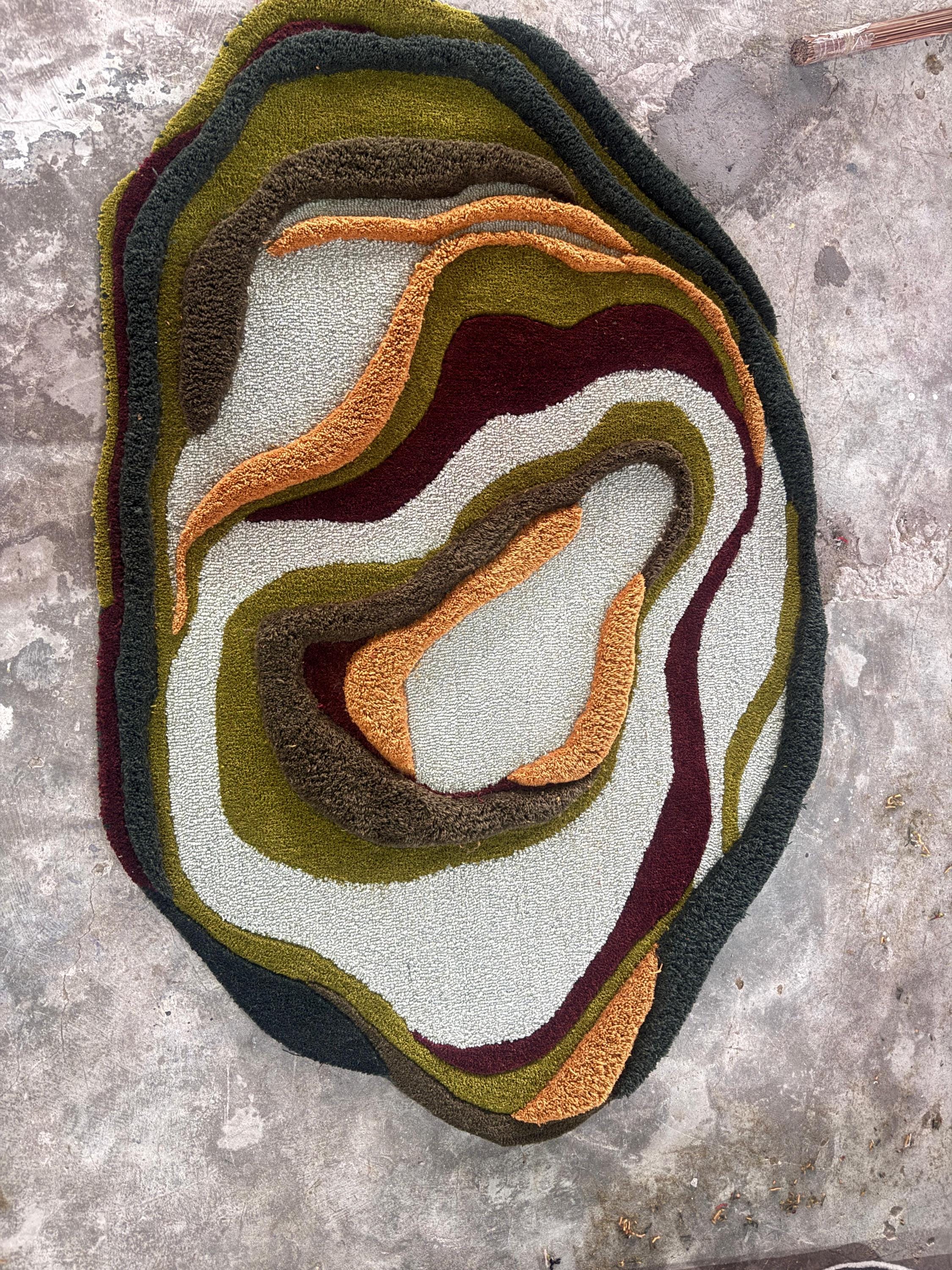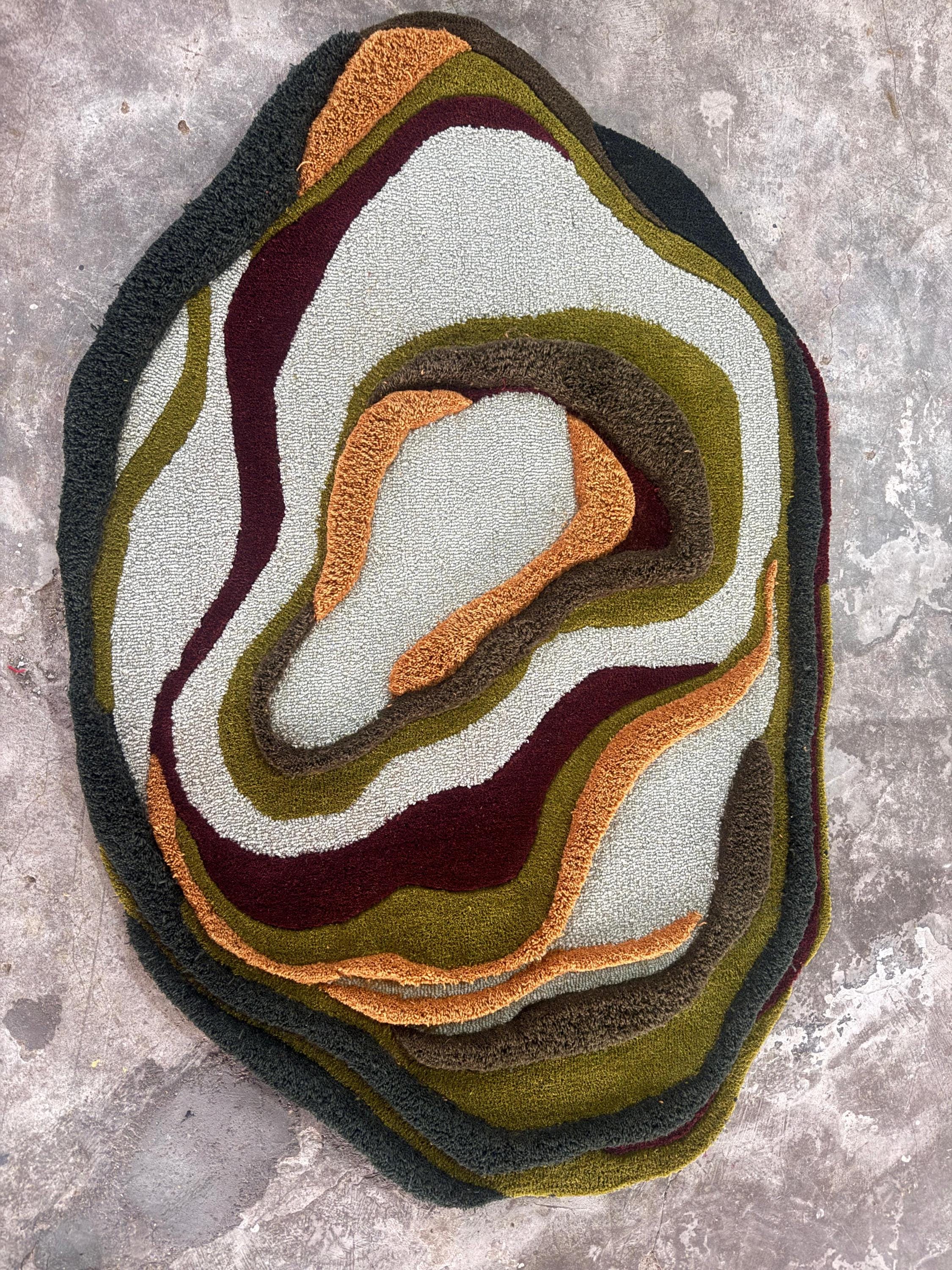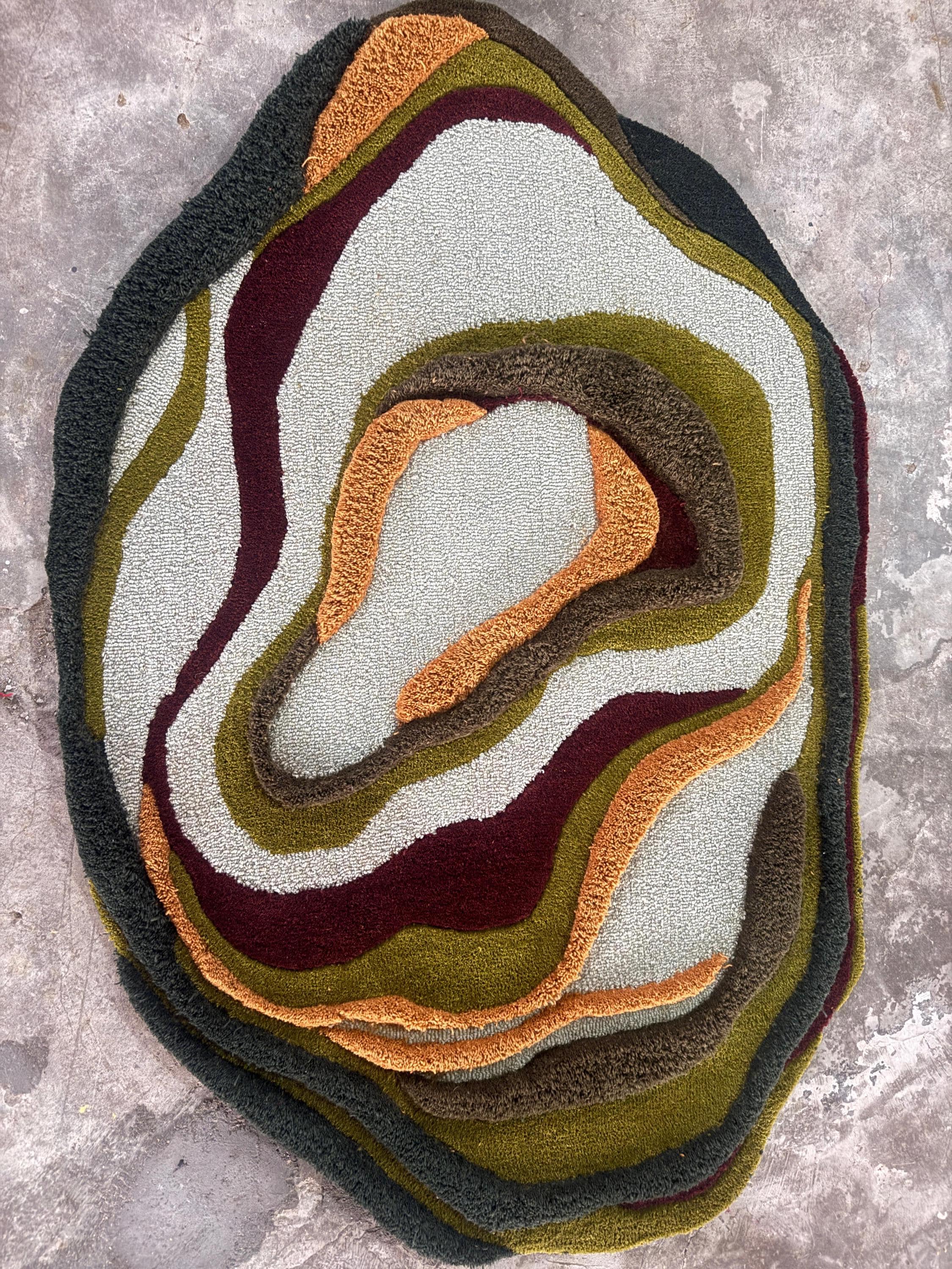The abstract layered pattern features earthy green, mustard, brown, and burgundy tones, inspired by natural landscapes and organic forms. Its irregular shape softens rigid spaces and pairs beautifully with modern, minimalist, Scandinavian, and contemporary interiors.