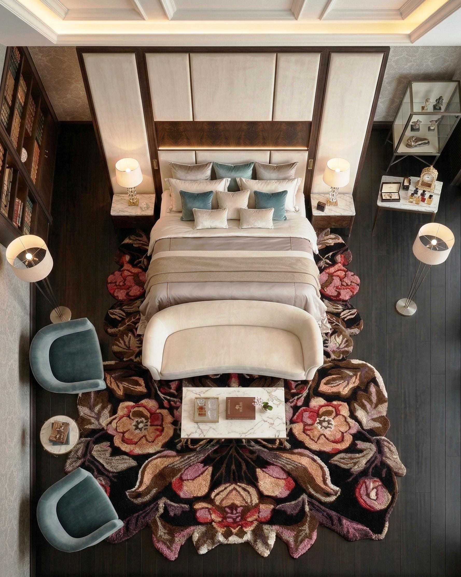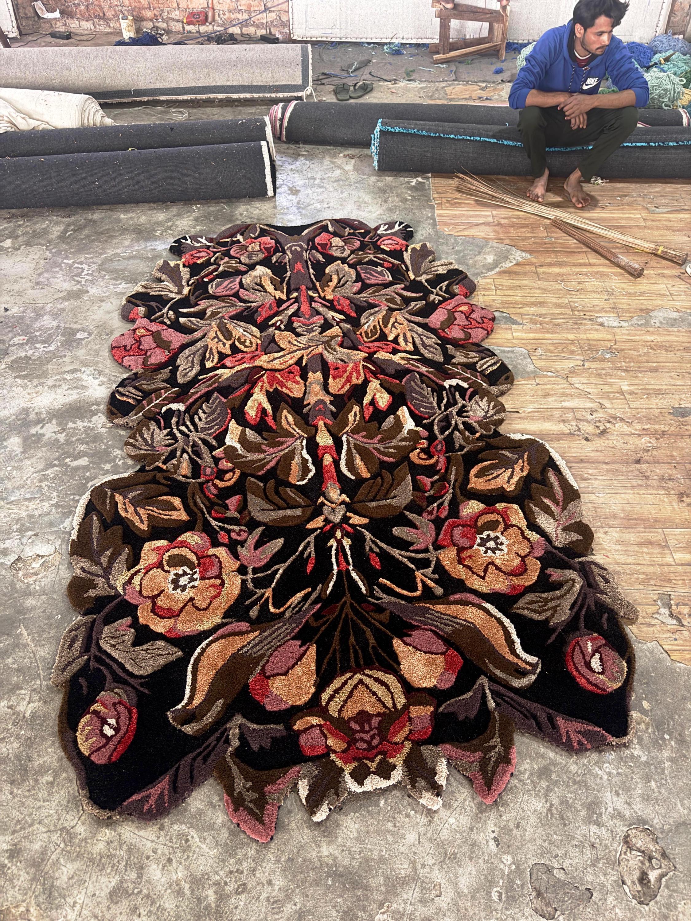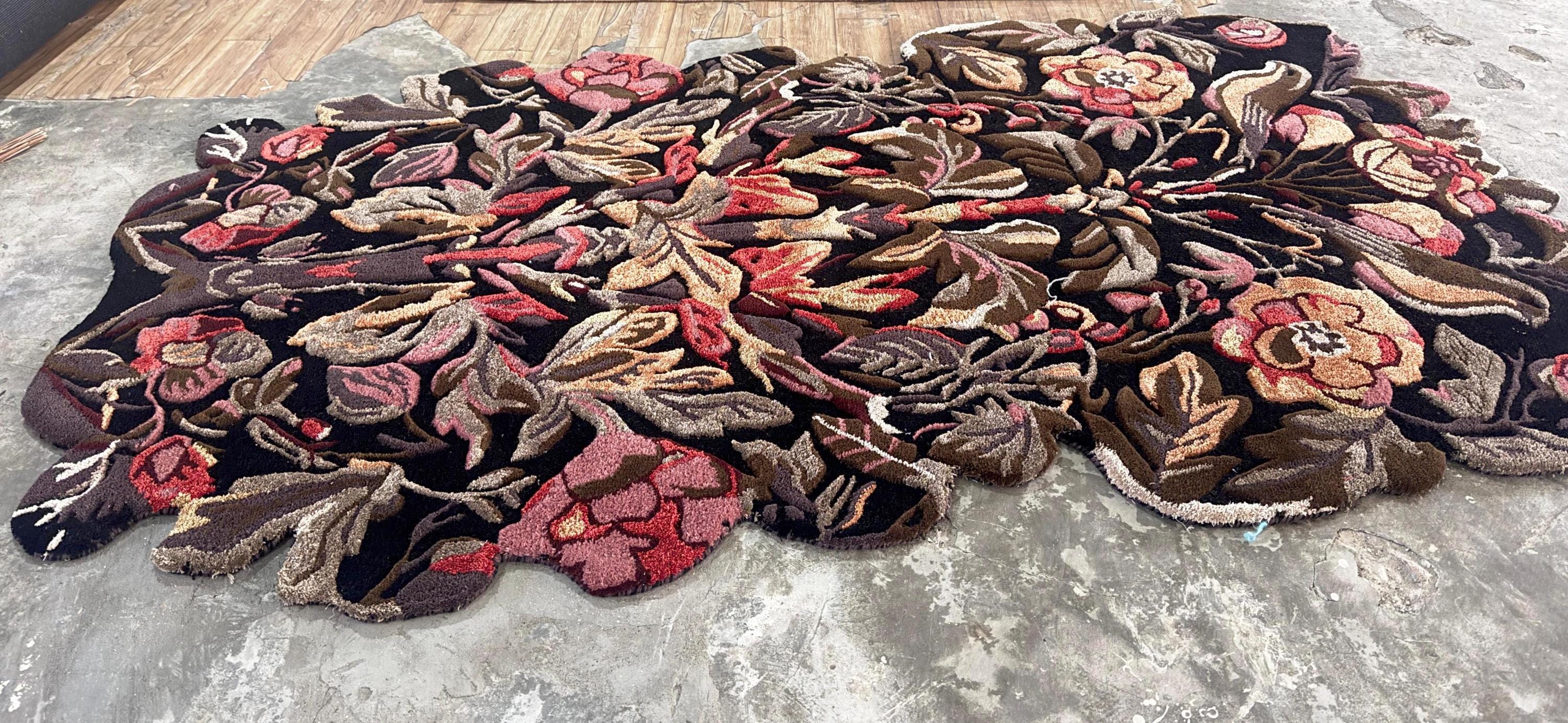 Expertly hand-tufted from 100% premium wool, this designer carpet combines durability, softness, and timeless beauty. The deep black background enhances the intricate floral design in warm shades of burgundy, rose, beige, and brown, creating a luxurious visual contrast.