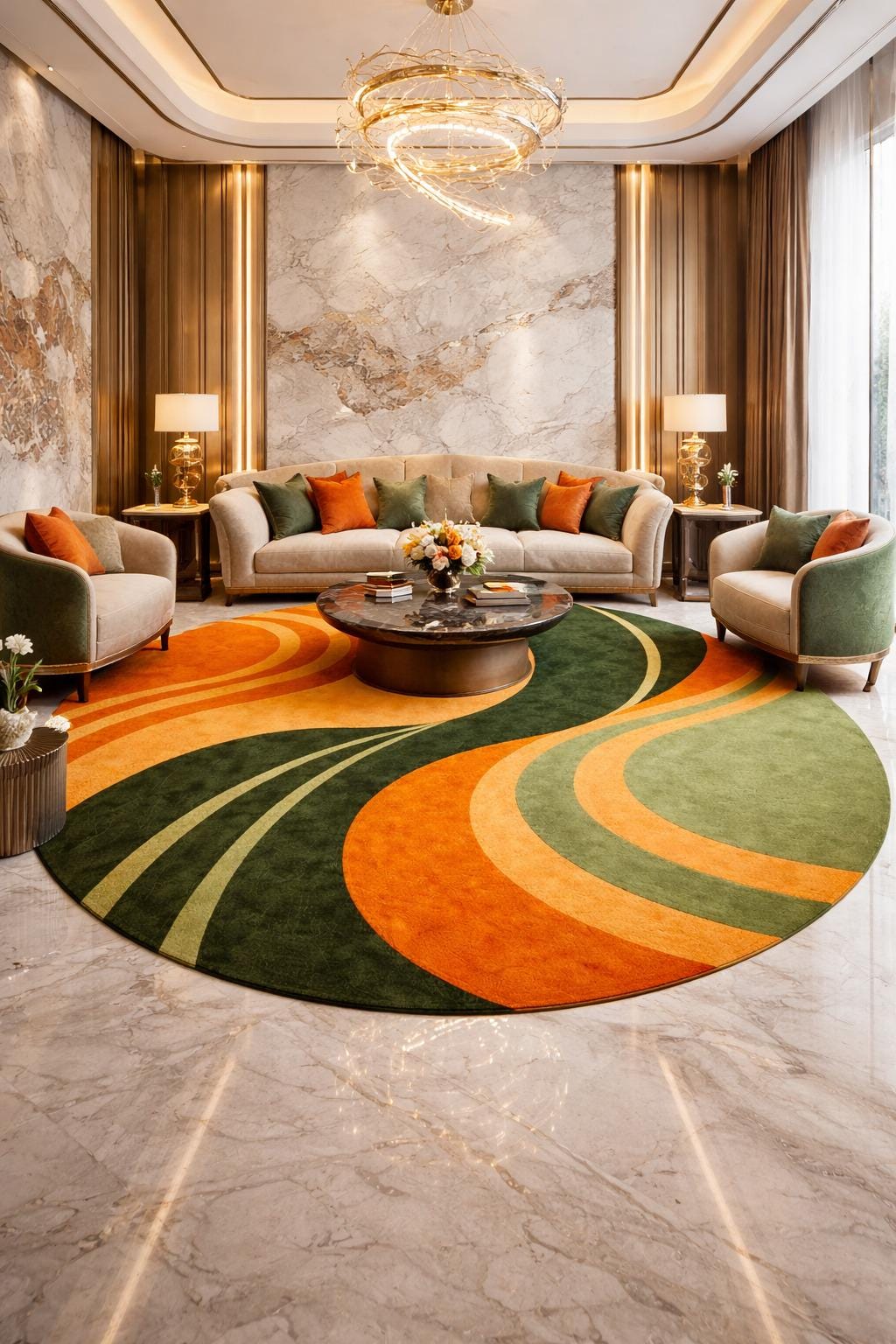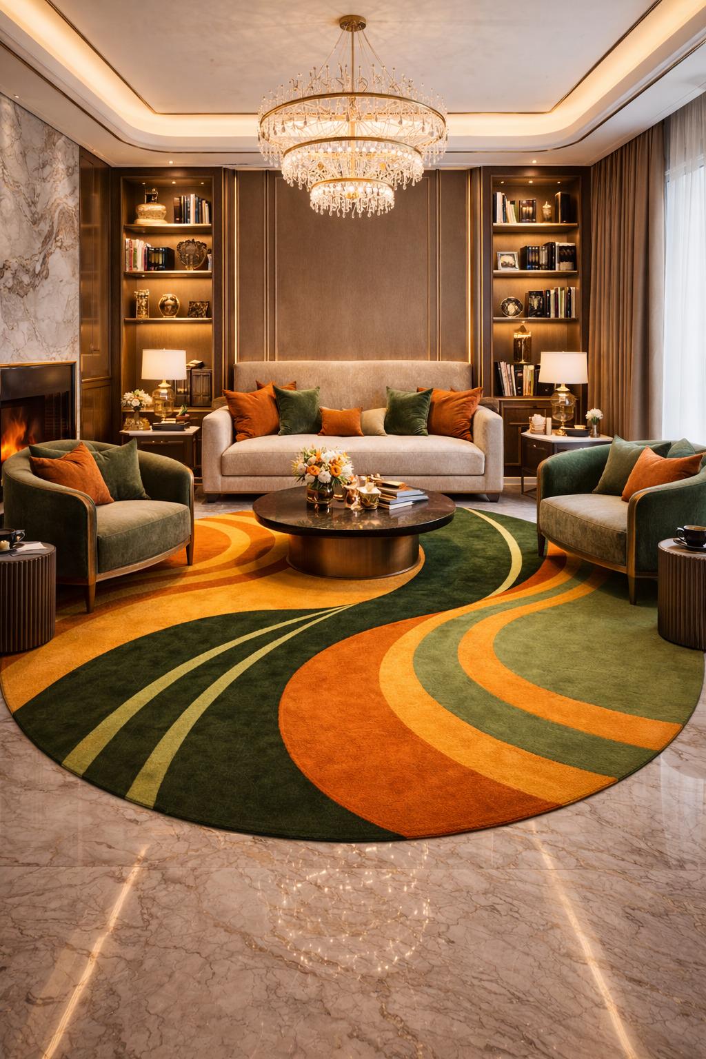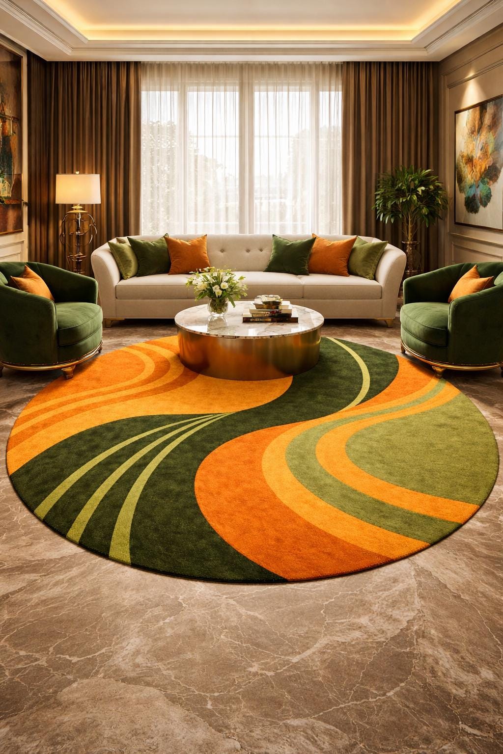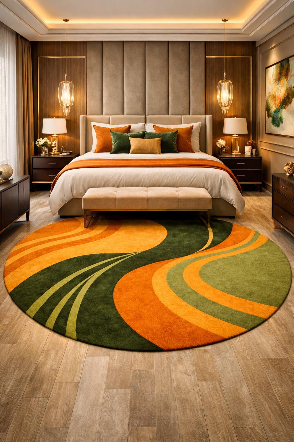 Bring warmth, movement, and artistic elegance into your home with this modern hand-tufted wool round rug. Designed with flowing abstract curves in rich forest green, olive, and warm orange tones, this rug creates a bold yet balanced focal point for any contemporary interior.