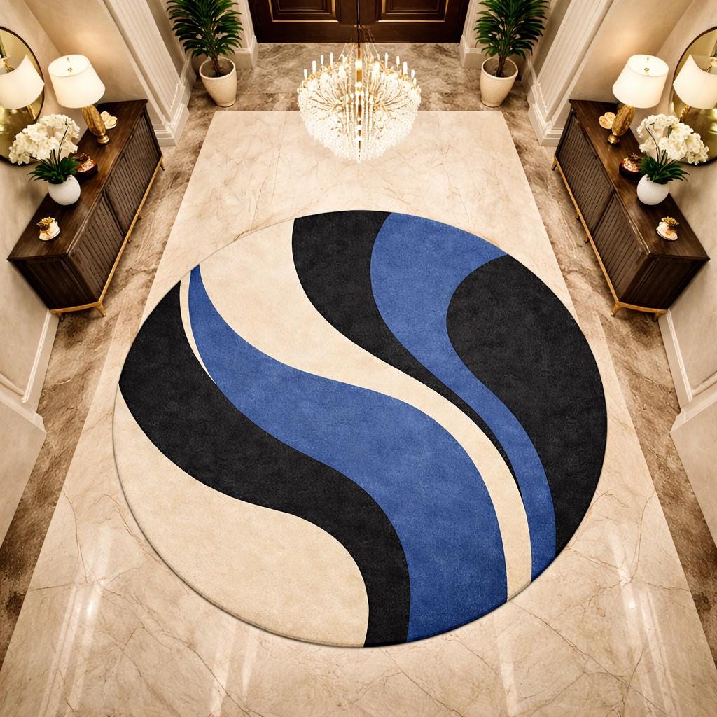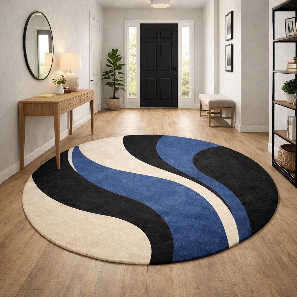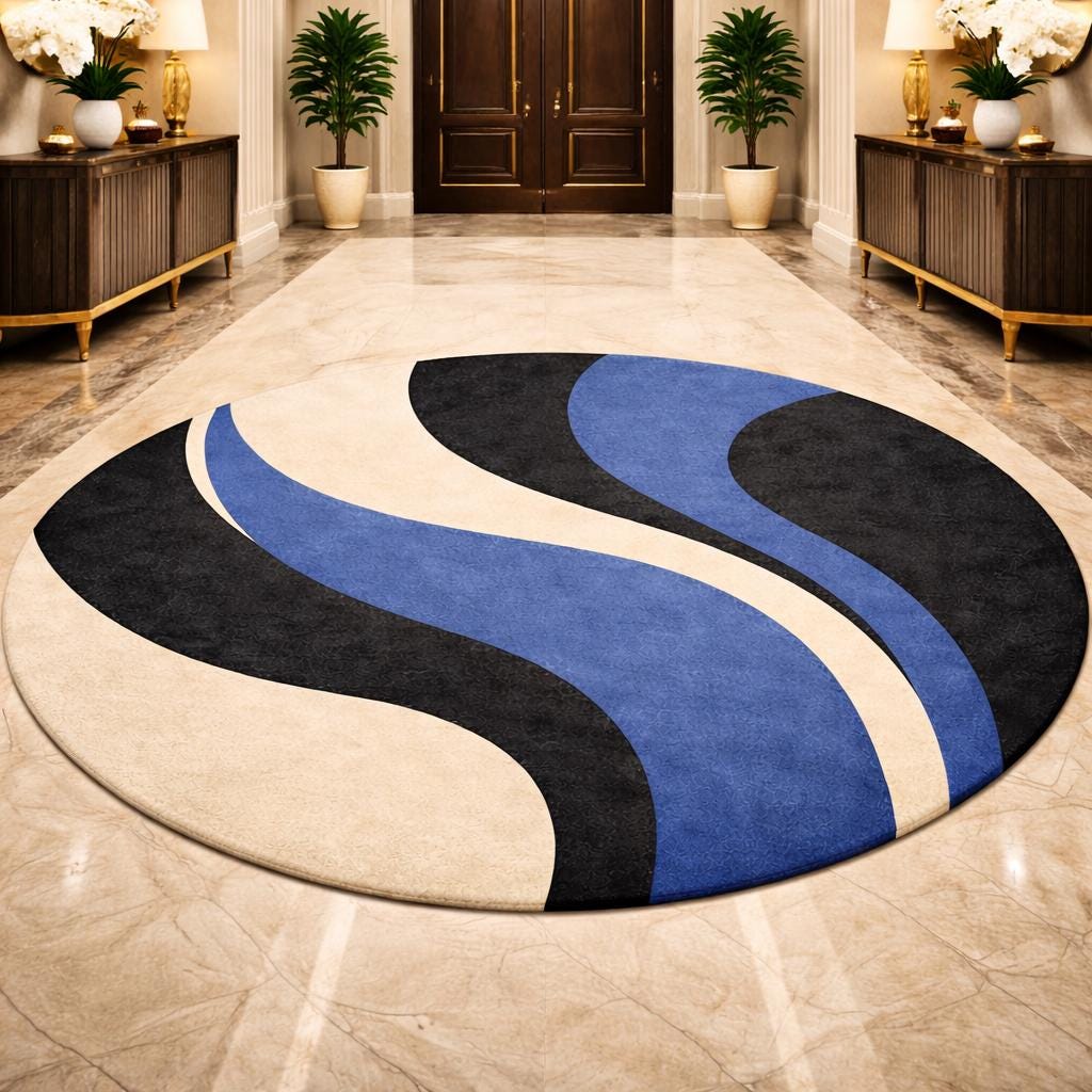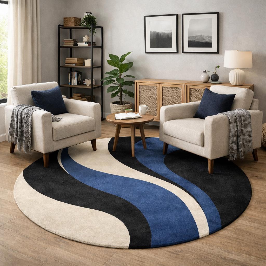Bring modern elegance and artistic style into your home with this beautiful hand-tufted round abstract rug. Designed with flowing curves in deep blue, black, and soft cream tones, this rug creates a striking visual centerpiece that enhances any contemporary living space.