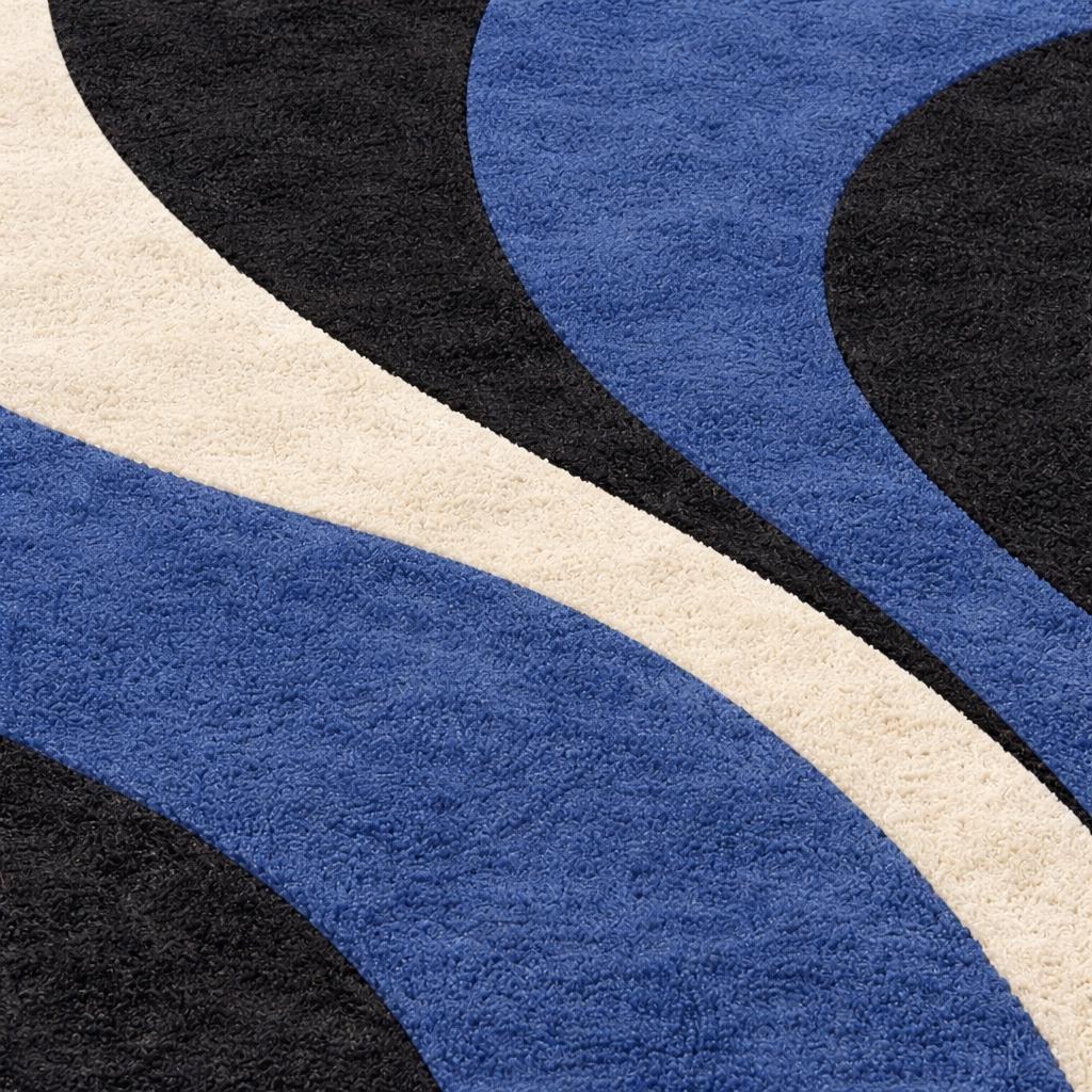 Hand Tufted Wool Round Rug, Blue Black Cream Abstract Waves Carpet