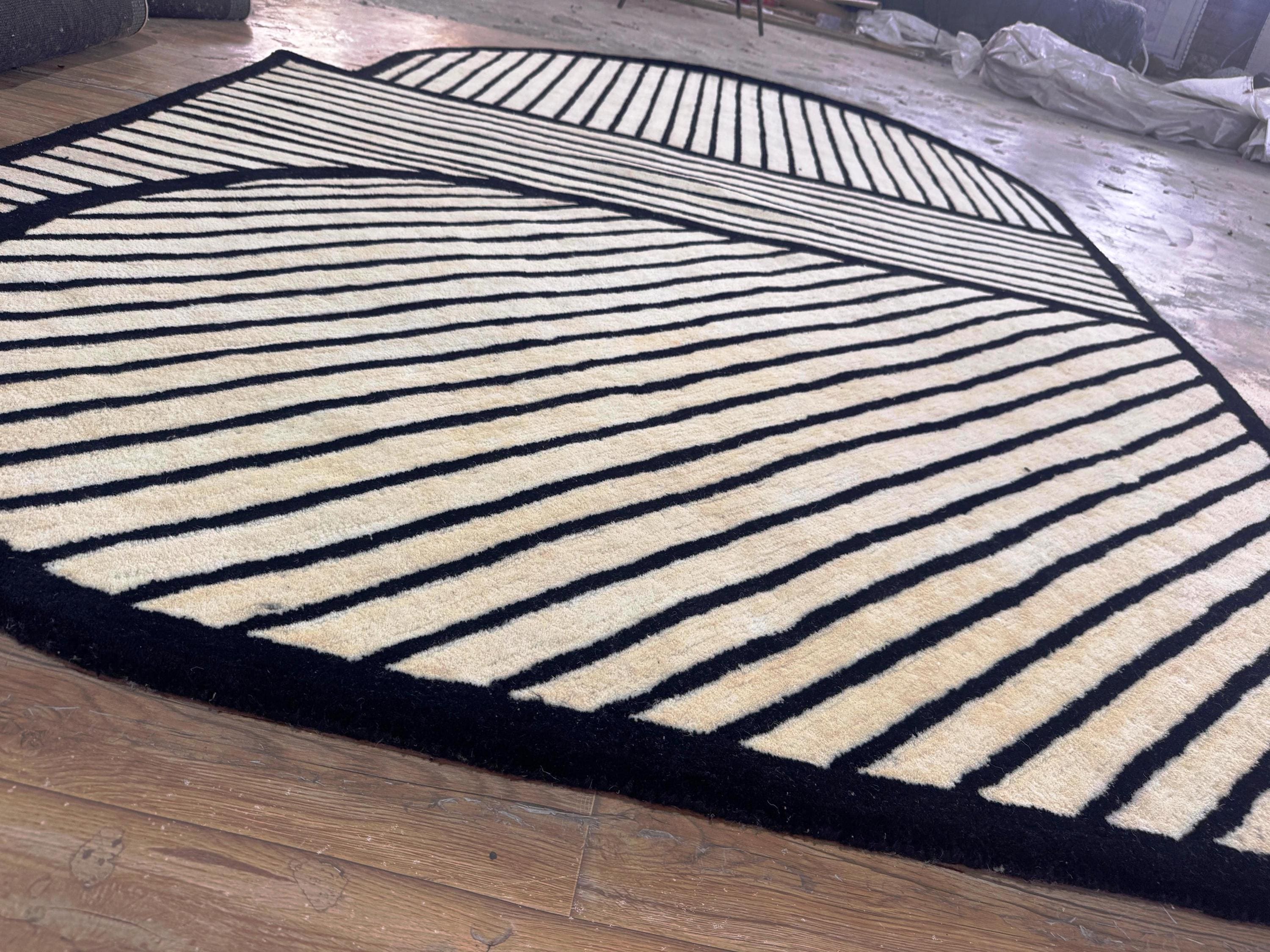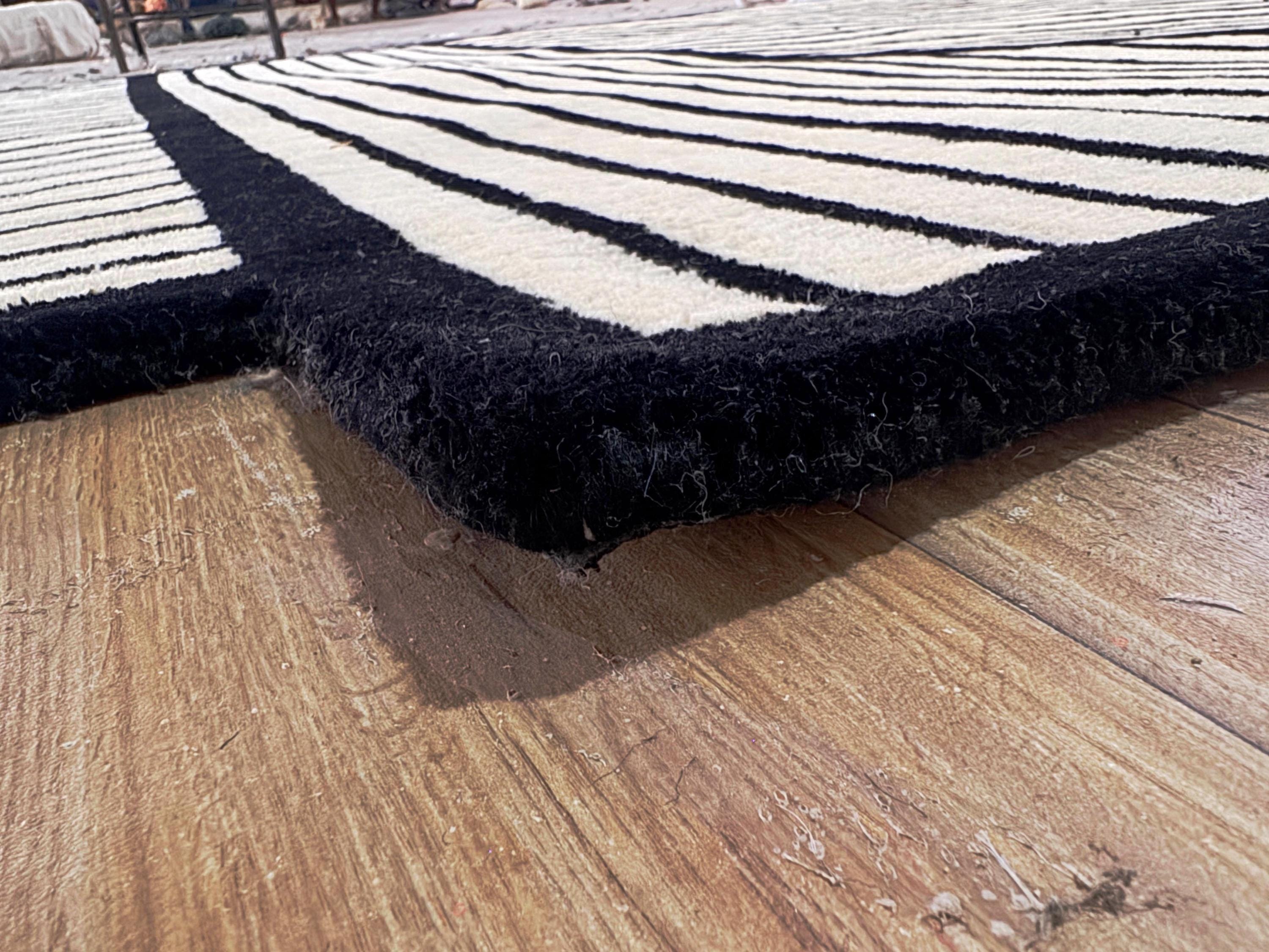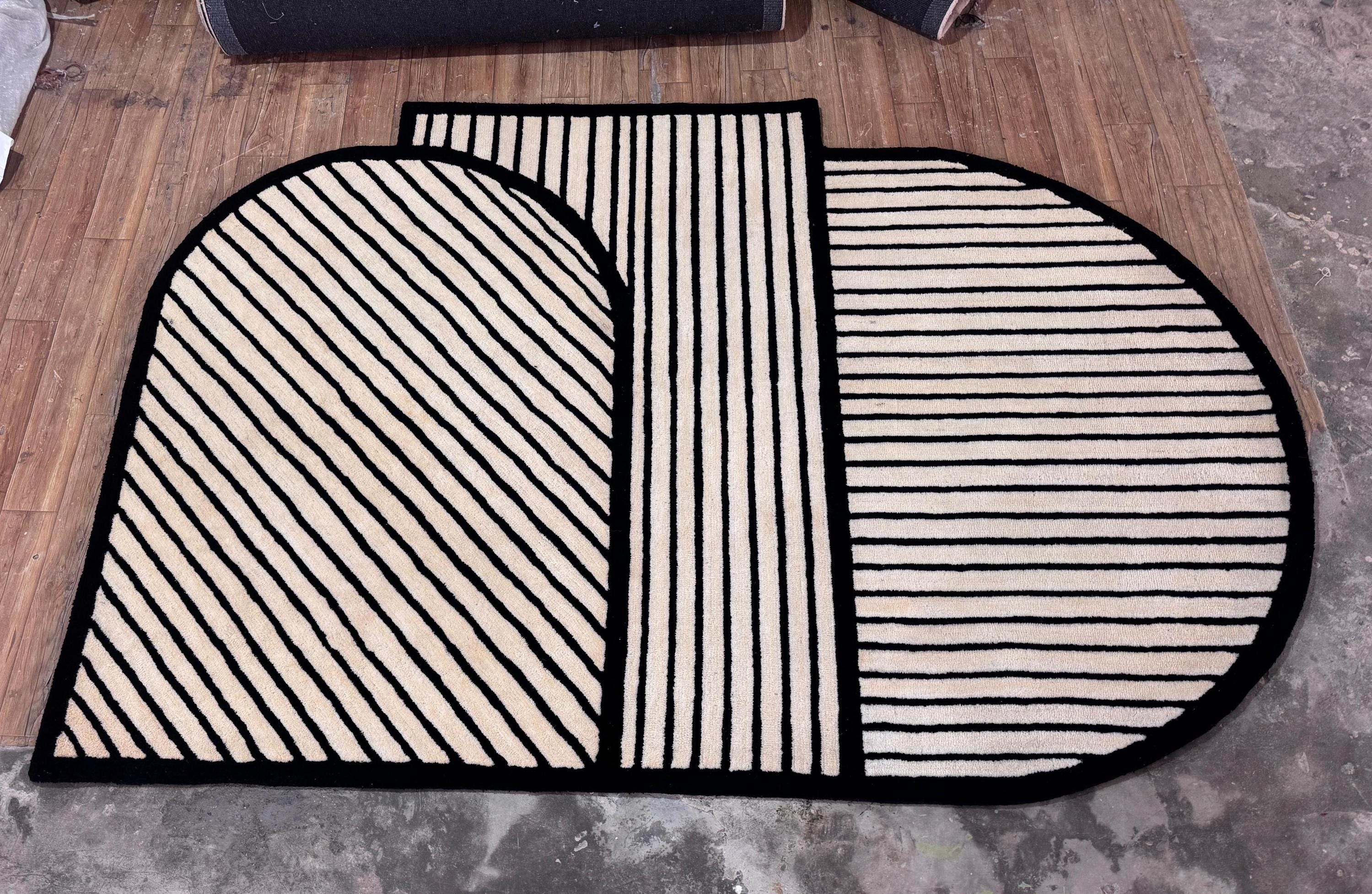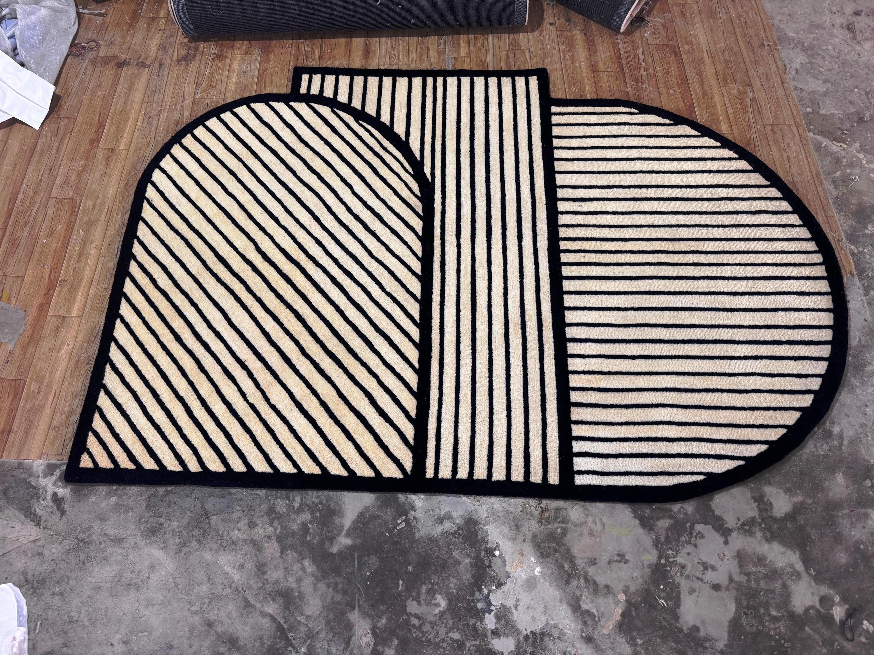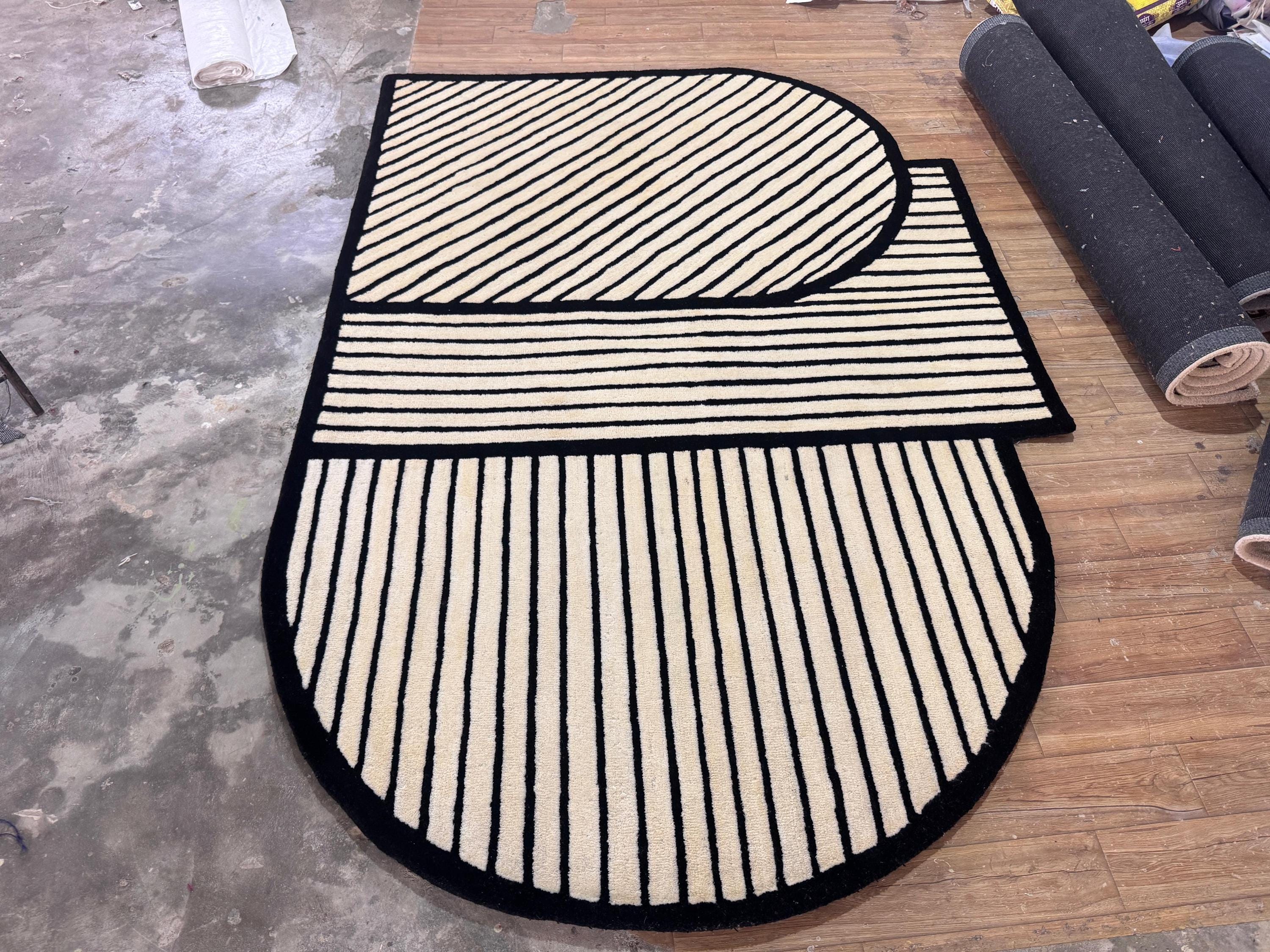 Bring a bold and sophisticated statement into your home with this modern black and white abstract area rug. Designed with a unique irregular shape and elegant geometric stripe pattern, this rug adds a contemporary artistic touch to any interior. The contrasting black border and cream background create a striking visual balance that perfectly complements modern, minimalist, and luxury home décor.