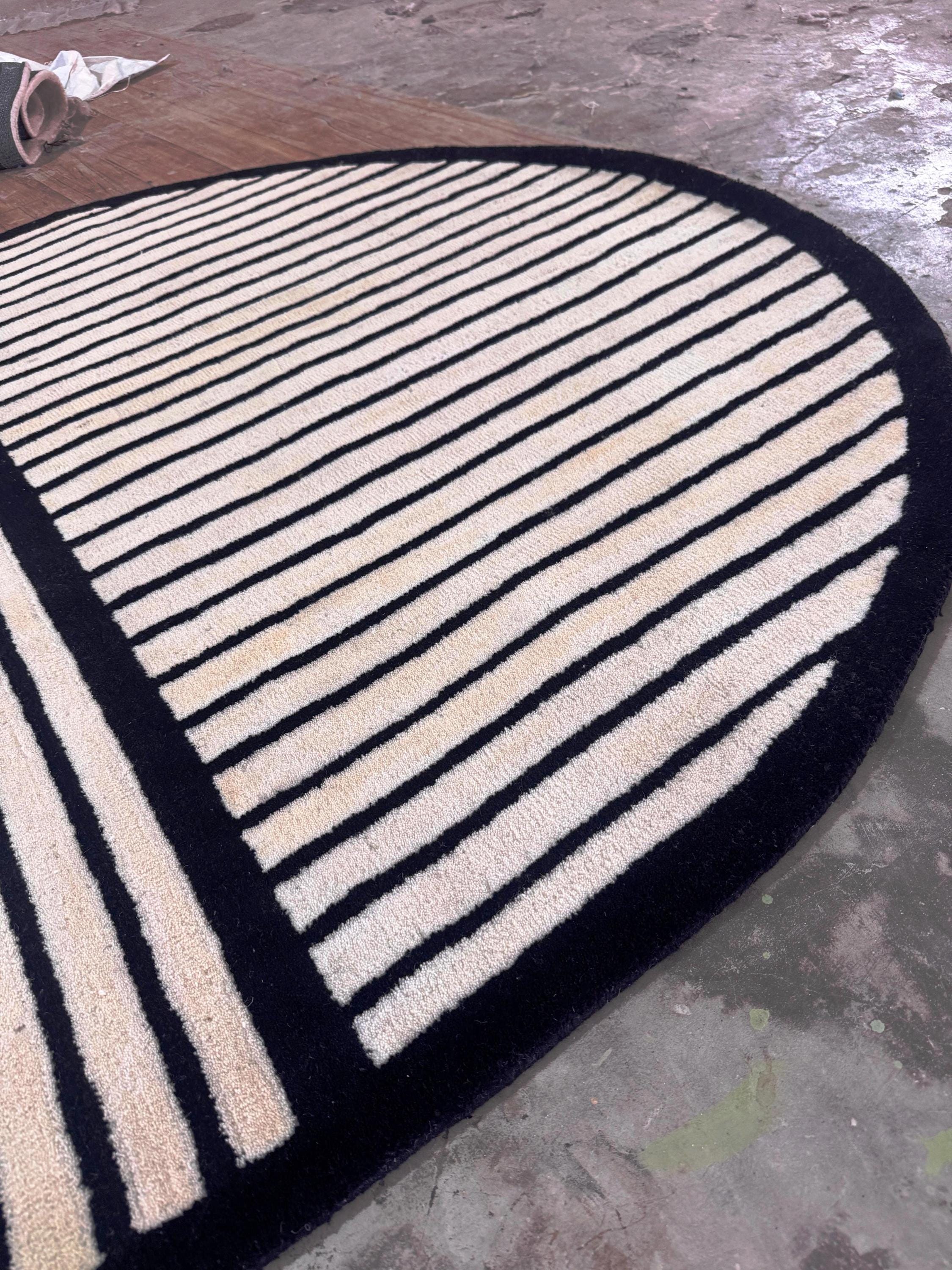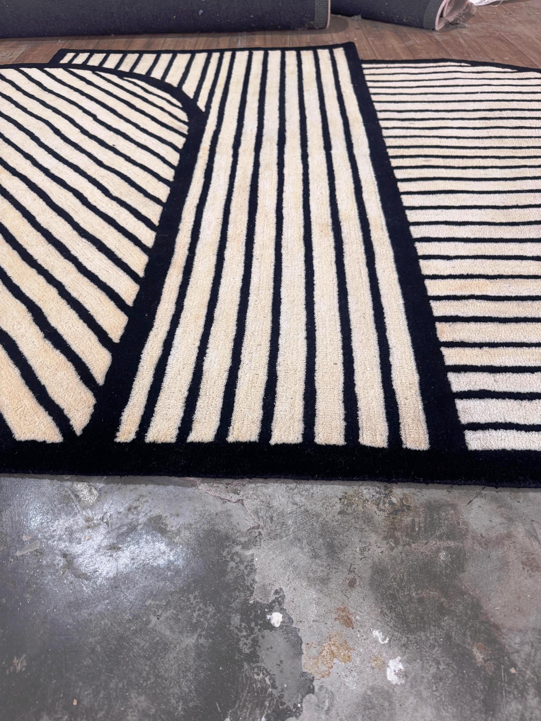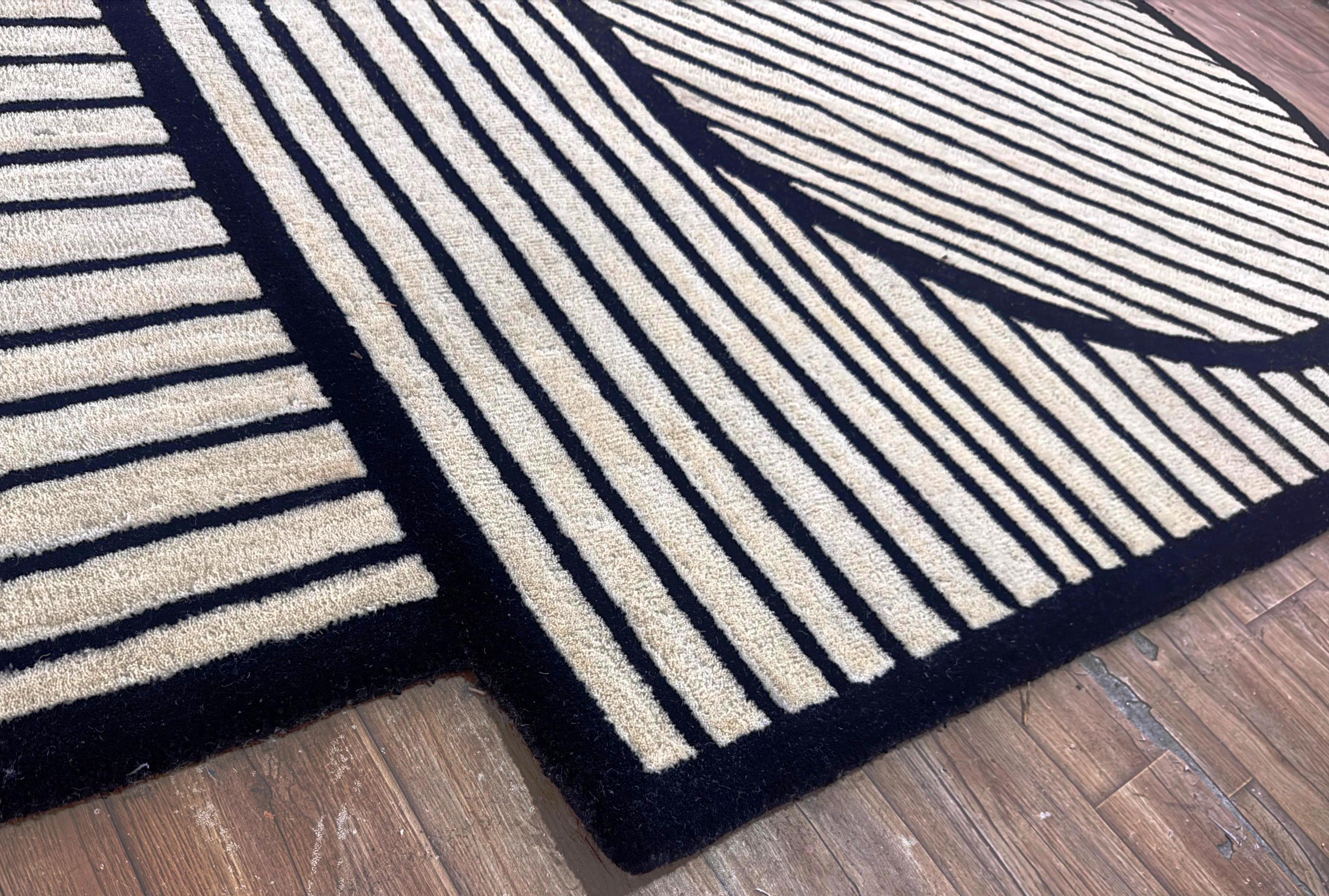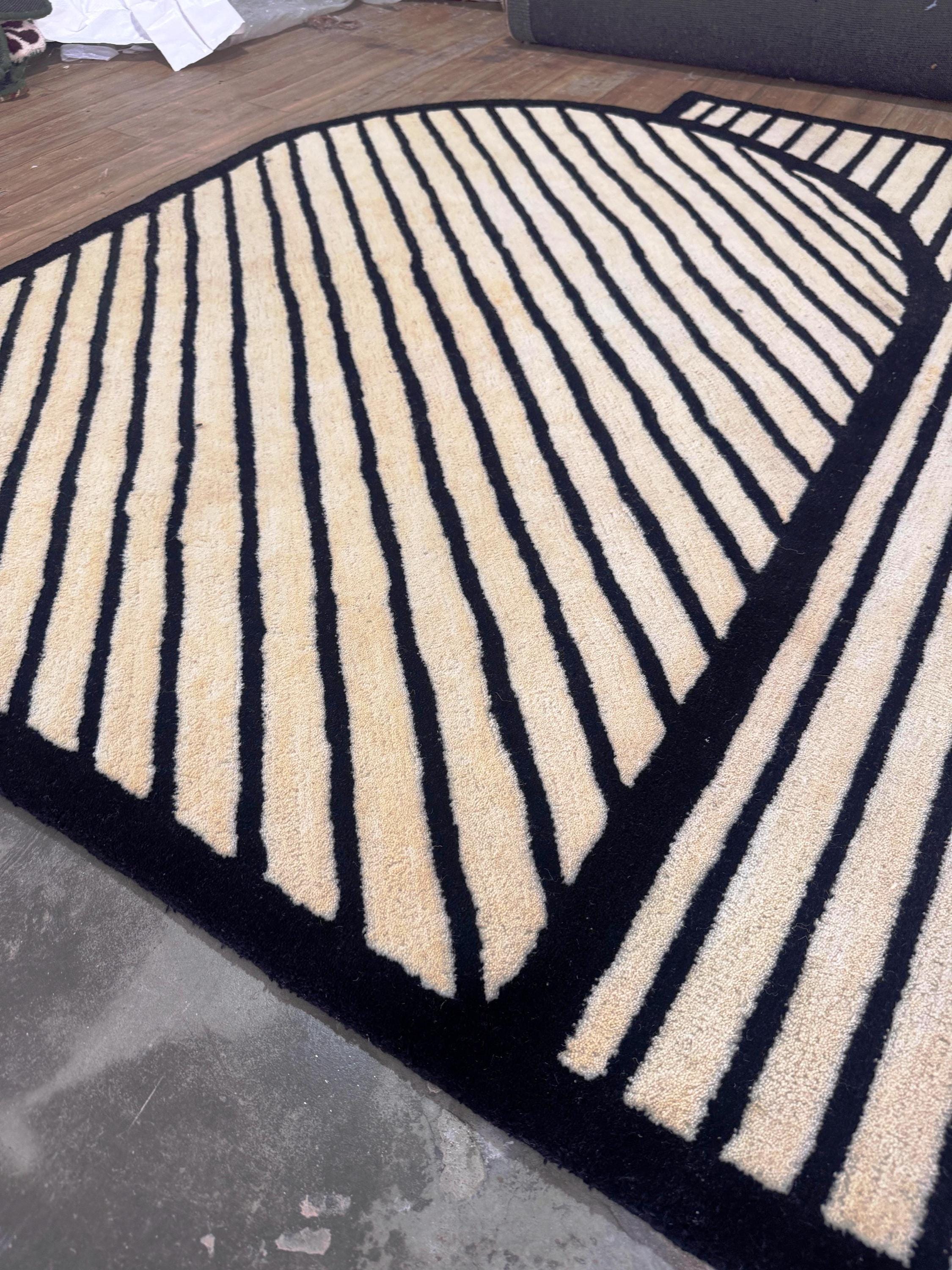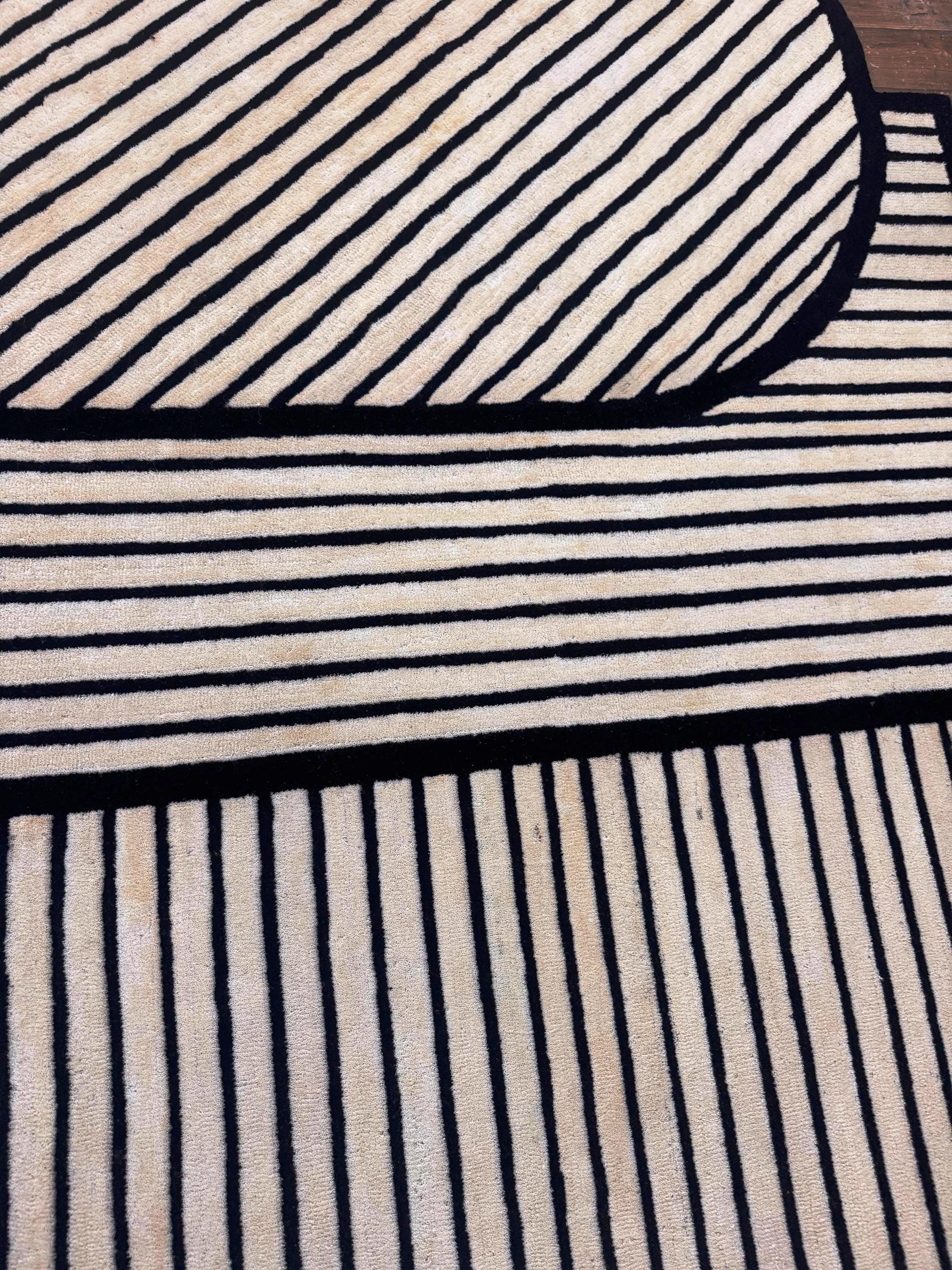 Bring a bold and sophisticated statement into your home with this modern black and white abstract area rug. Designed with a unique irregular shape and elegant geometric stripe pattern, this rug adds a contemporary artistic touch to any interior. The contrasting black border and cream background create a striking visual balance that perfectly complements modern, minimalist, and luxury home décor.