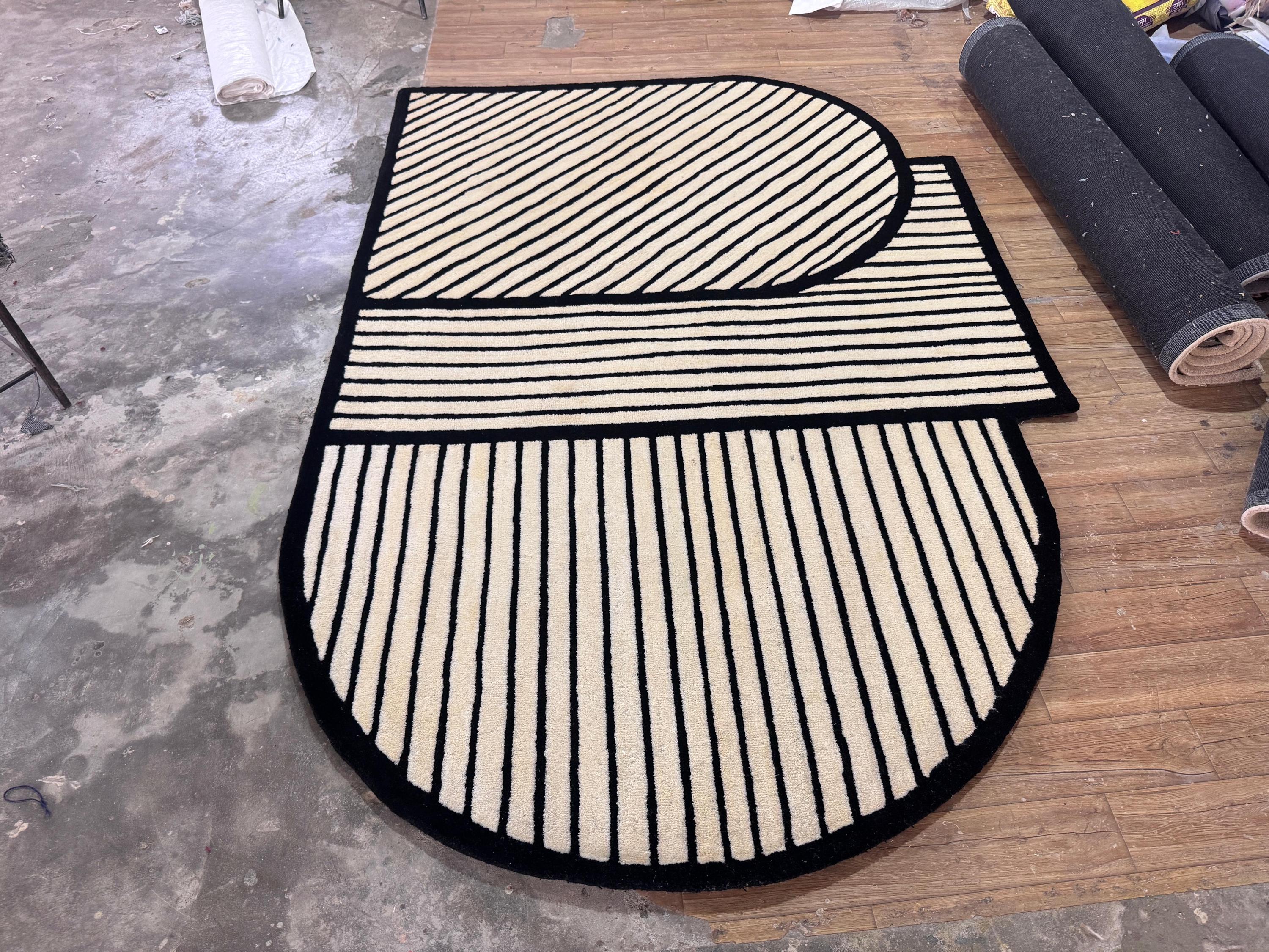 Hand Tufted Abstract Geometric Rug: Black White Irregular Shape Carpet