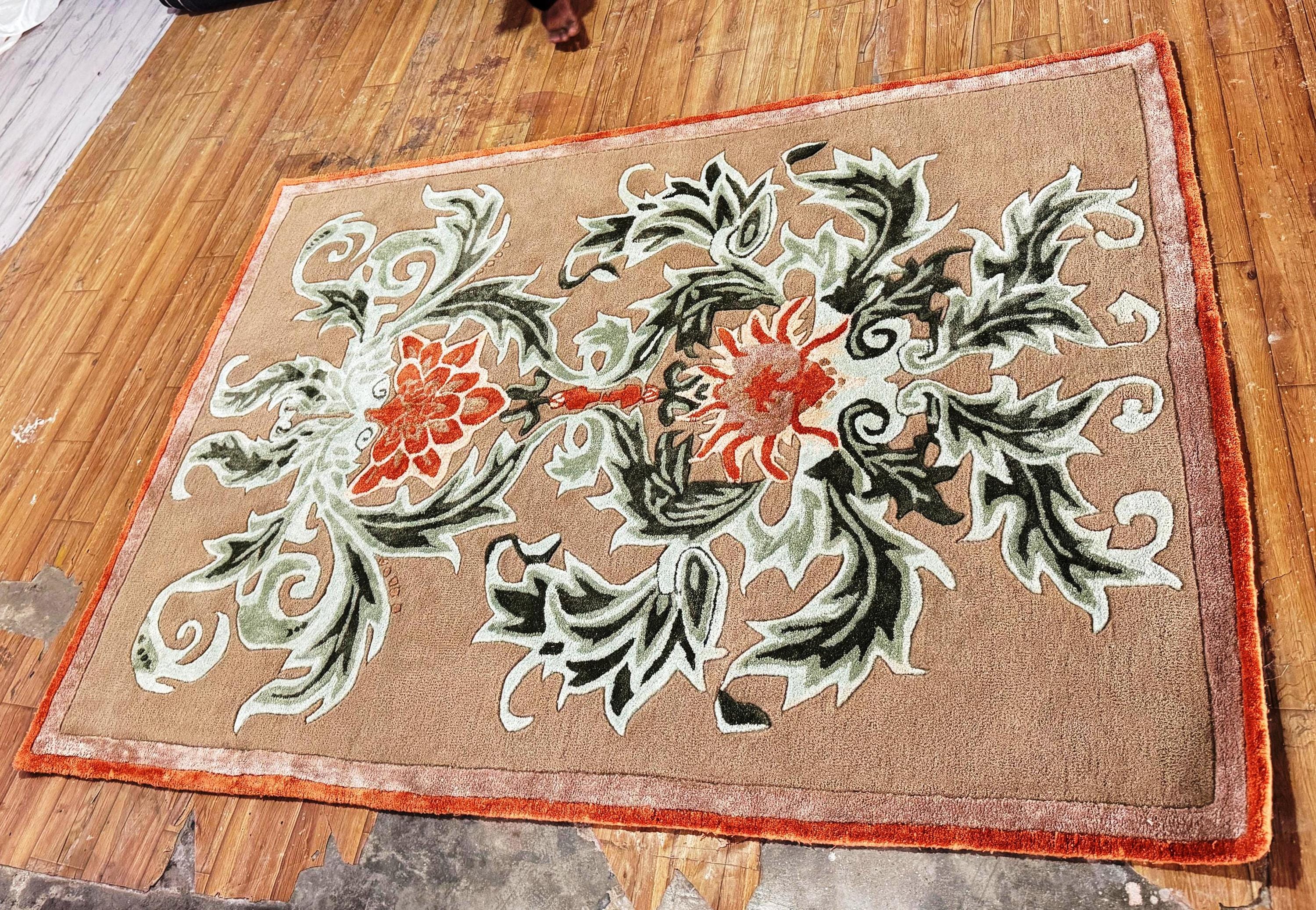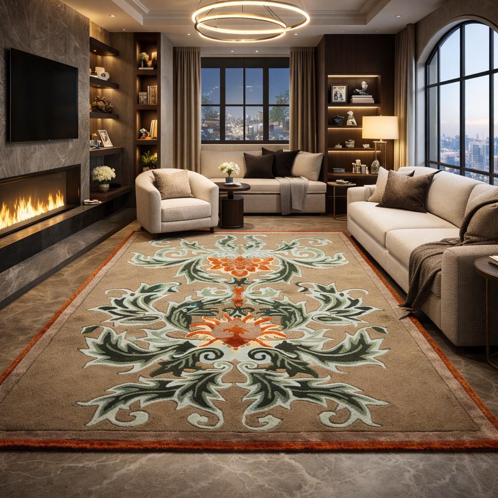 Bring elegance and artistic craftsmanship into your home with this luxury hand-tufted wool area rug, designed to elevate modern interiors. Featuring a sophisticated floral ornamental pattern with rich tones of beige, green, and orange, this rug creates a stunning focal point for living rooms, bedrooms, hotel lobbies, and luxury entryways.
