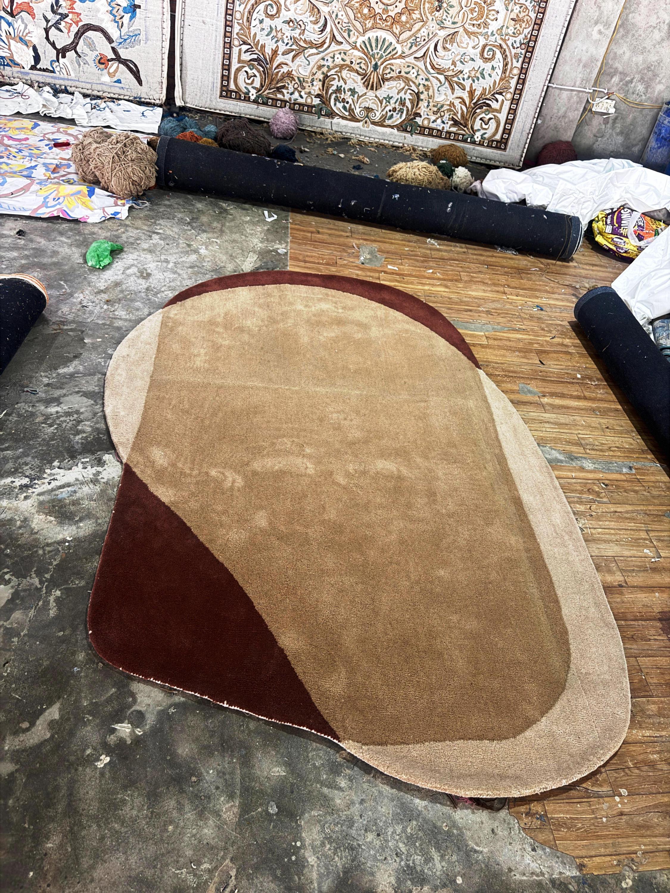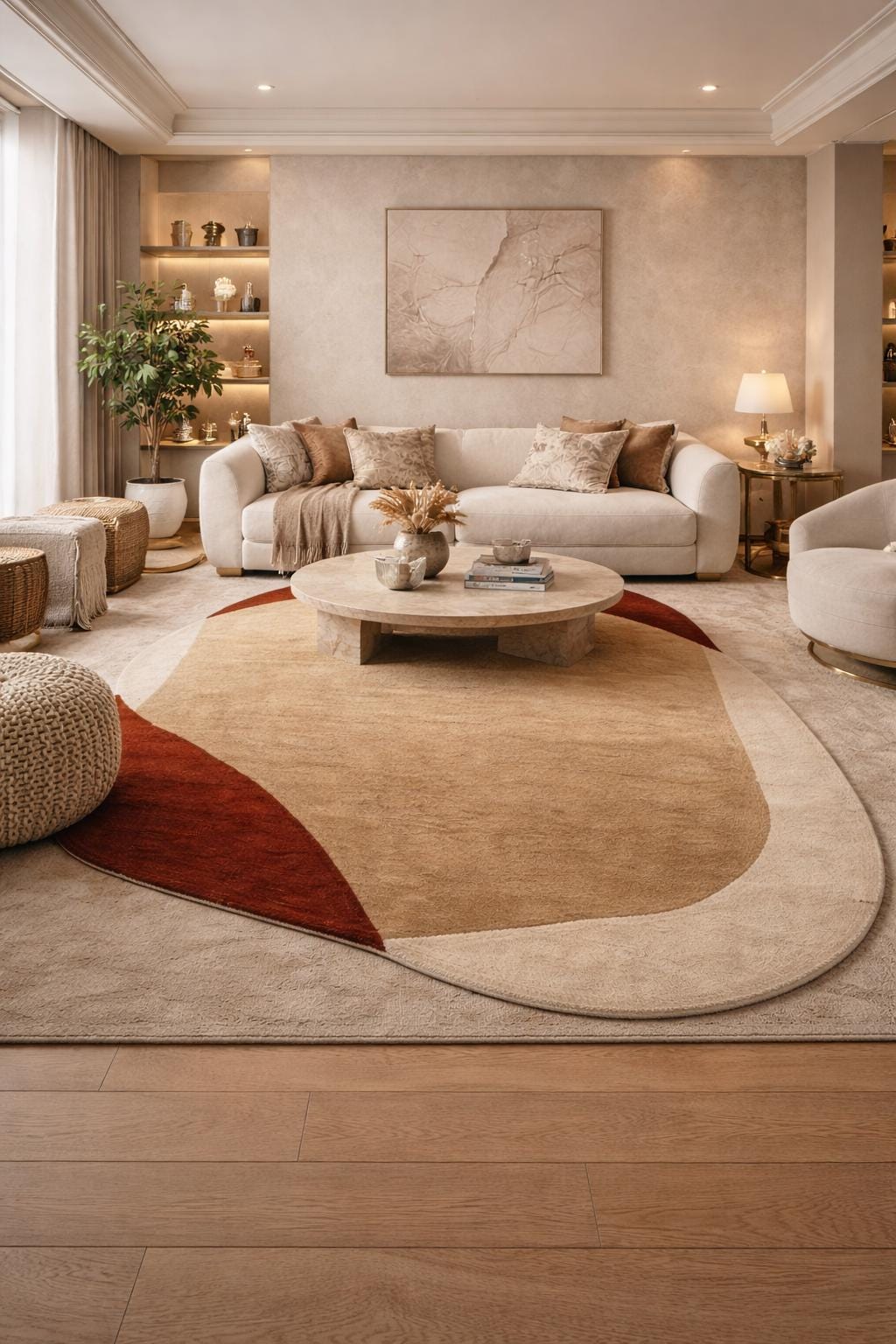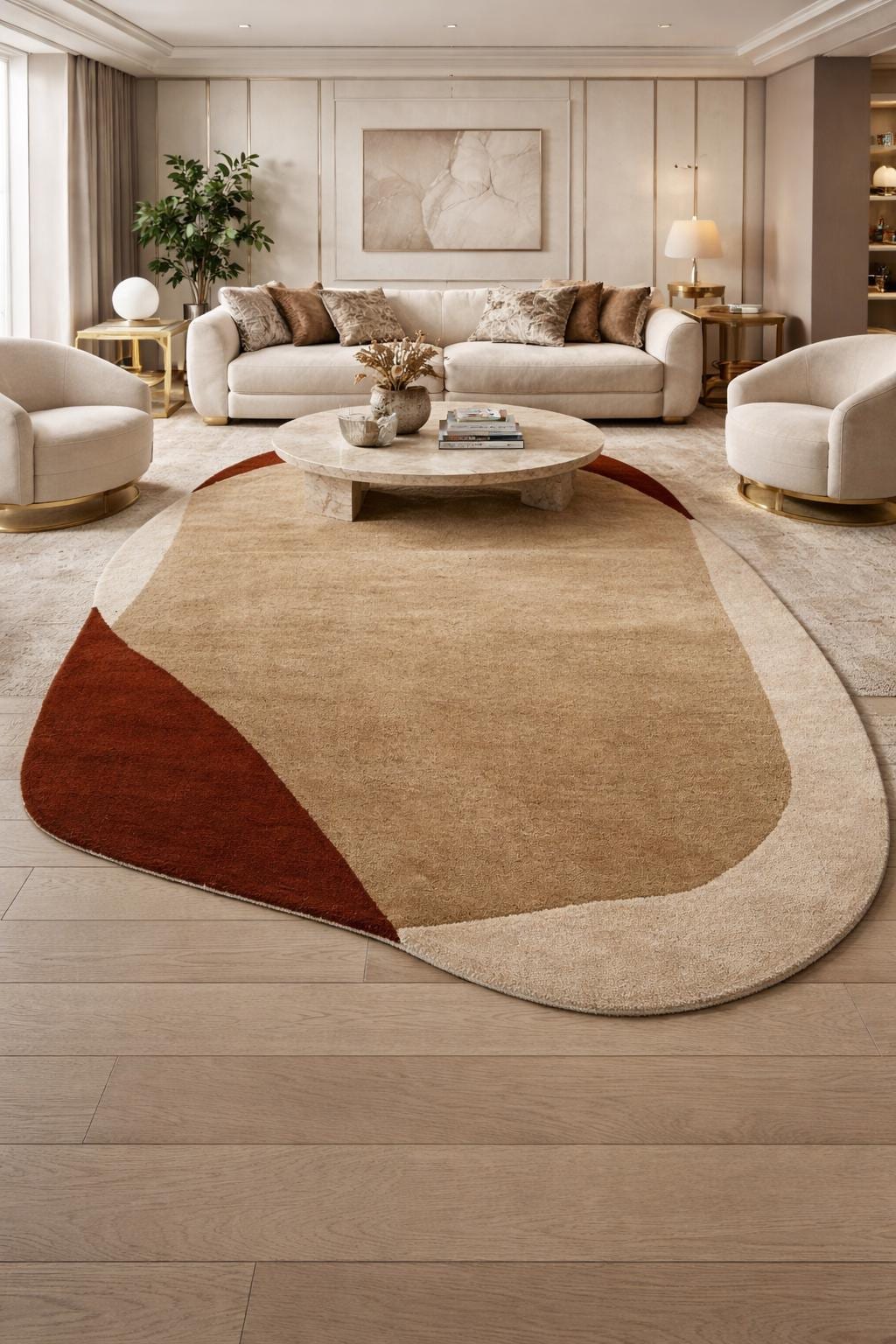 Elevate your interior with this luxury hand-tufted irregular abstract rug, designed to bring modern elegance and artistic style into your home. This unique rug features a soft neutral palette of beige, cream, camel, and rust tones arranged in an organic flowing shape that creates a warm and sophisticated atmosphere.
