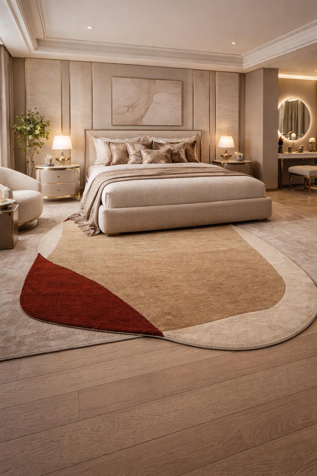 The artistic color blocking and curved edges create a high-end designer aesthetic, making this rug ideal for minimalist, Scandinavian, modern, and luxury décor styles.