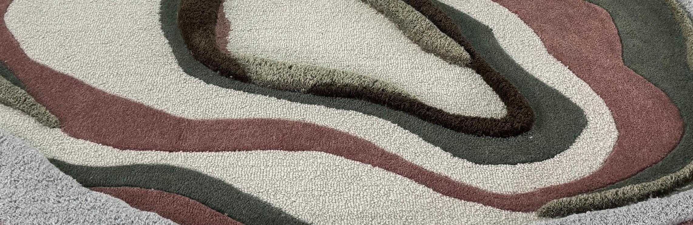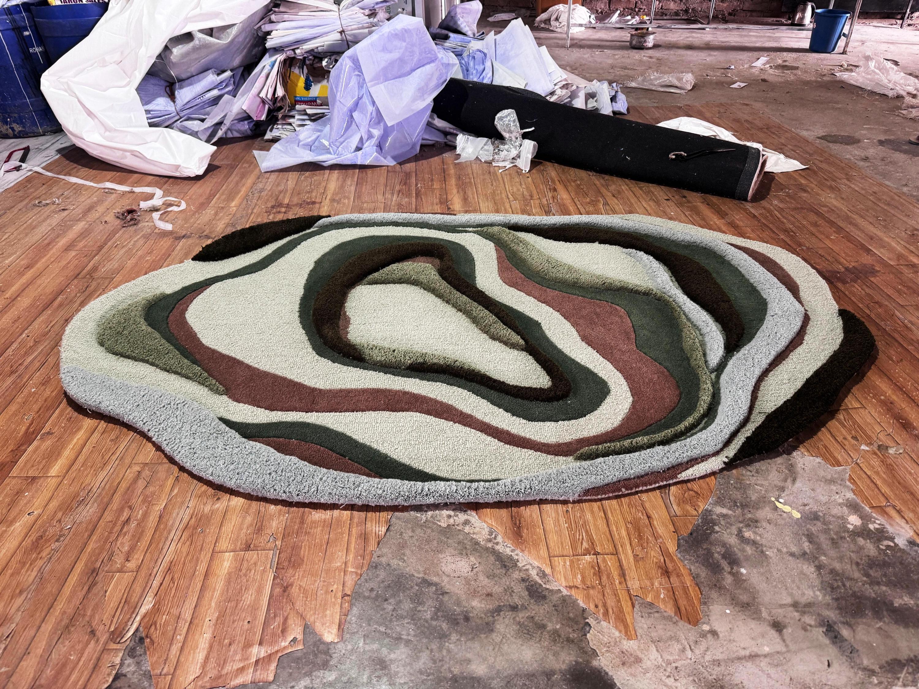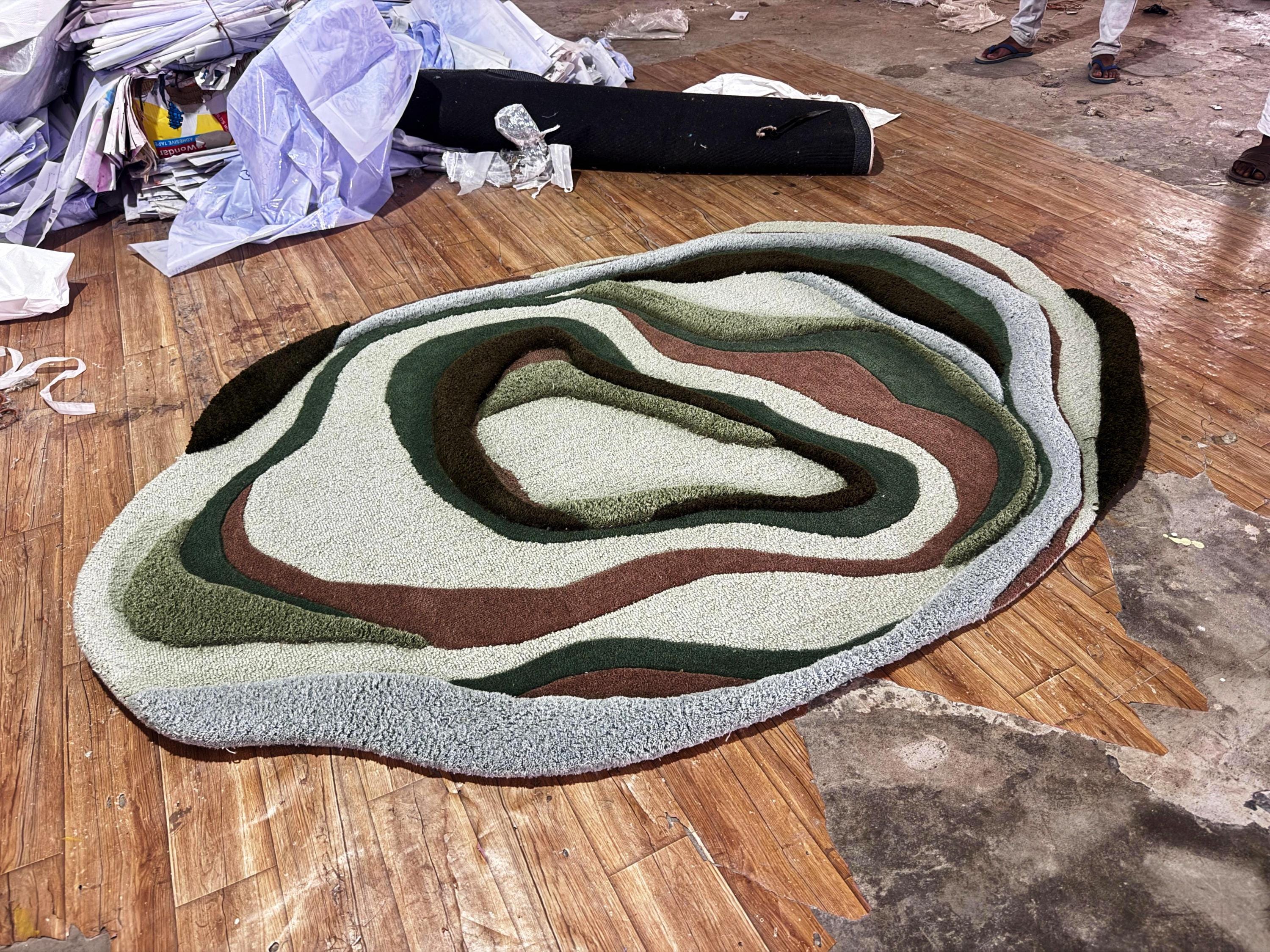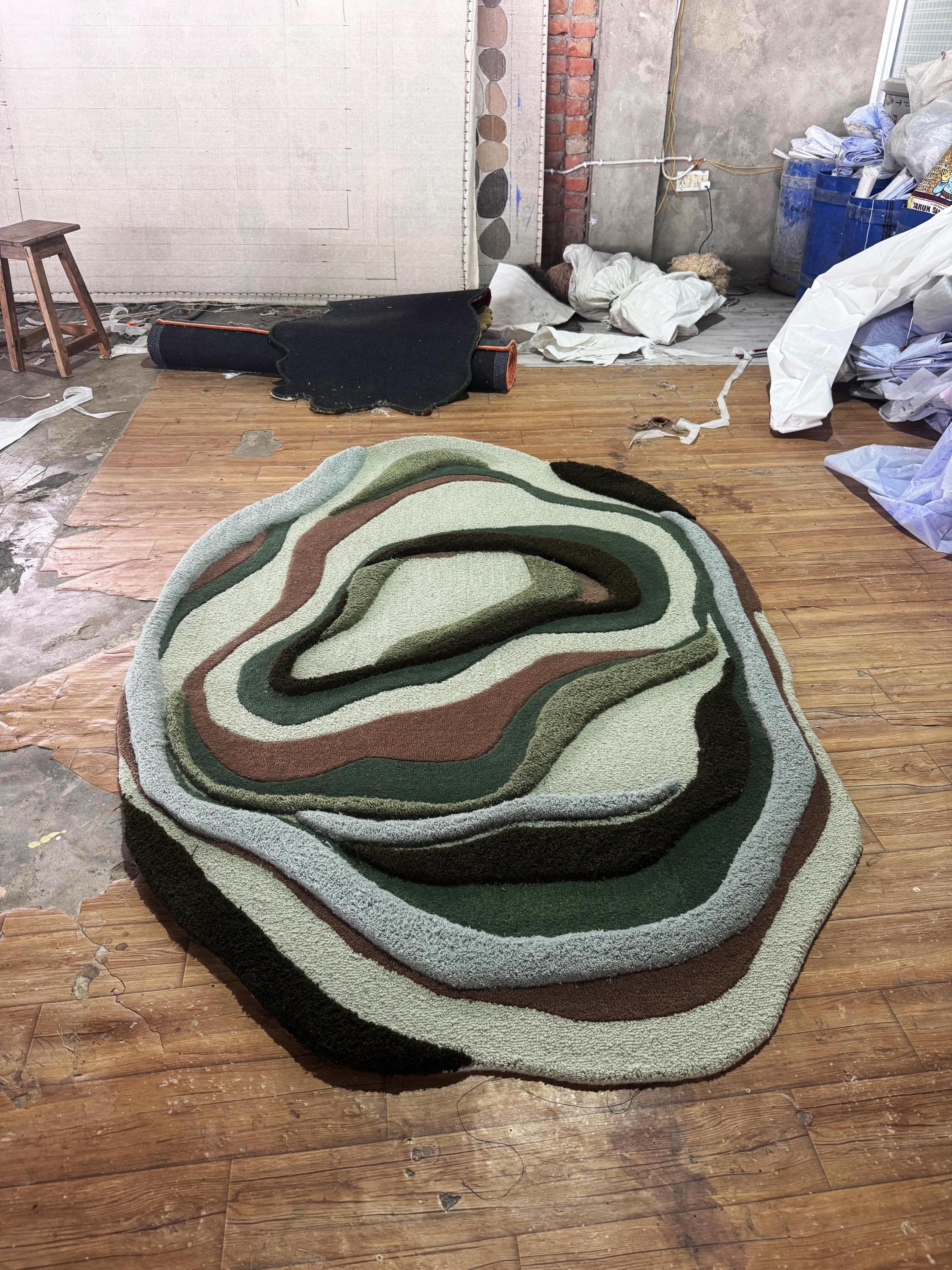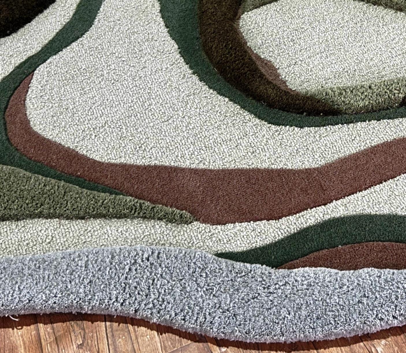 Bring warmth, texture, and artistic flair into your home with this stunning hand-tufted abstract rug. Featuring a unique irregular shape with flowing organic lines, this rug blends earthy tones of cream, green, brown, and beige to create a calming yet eye-catching centerpiece.