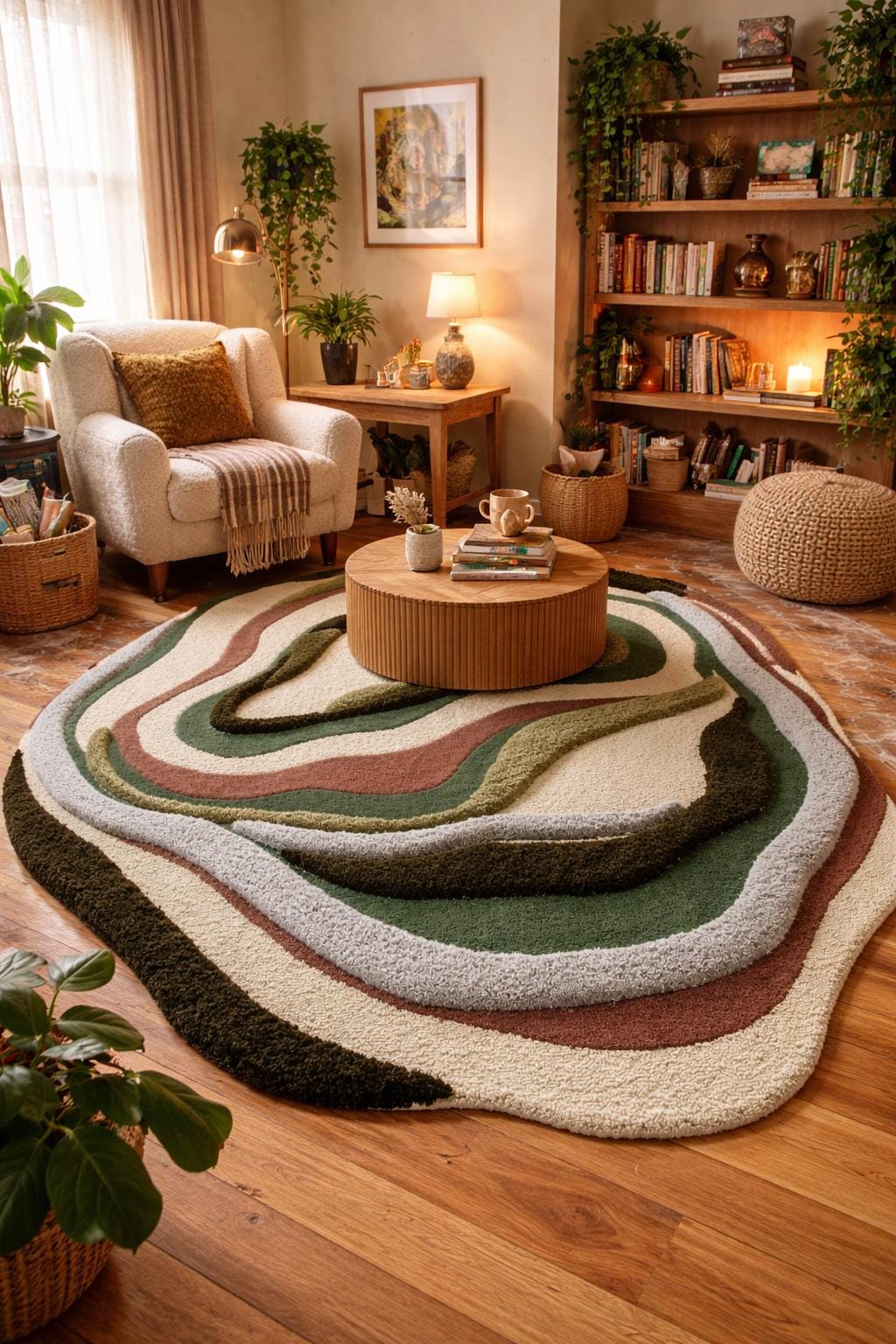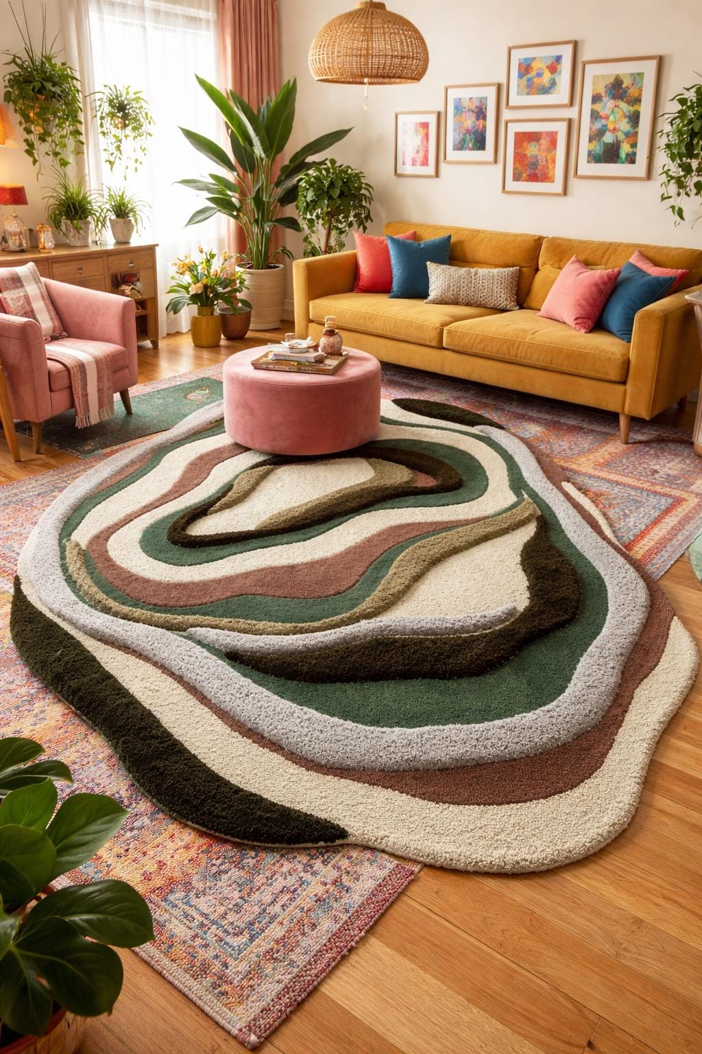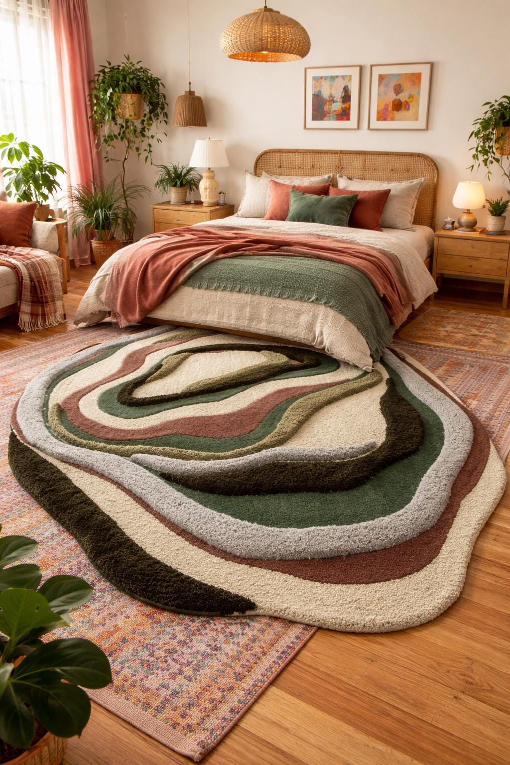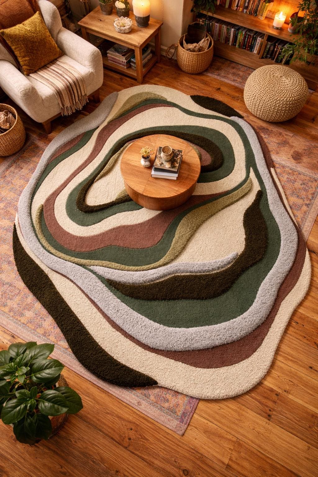 Handmade Abstract Wavy Rug, Boho Earth Tone Irregular Carpet, Living Room Statement Decor