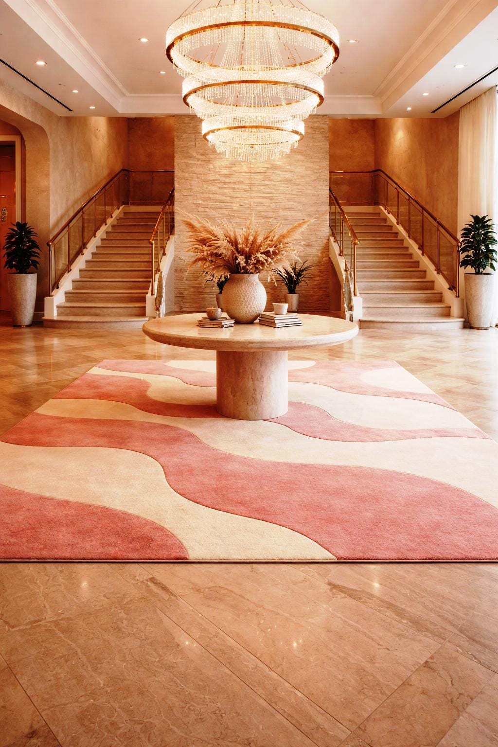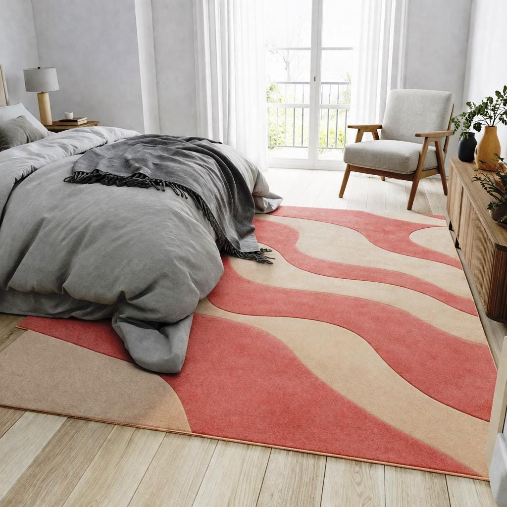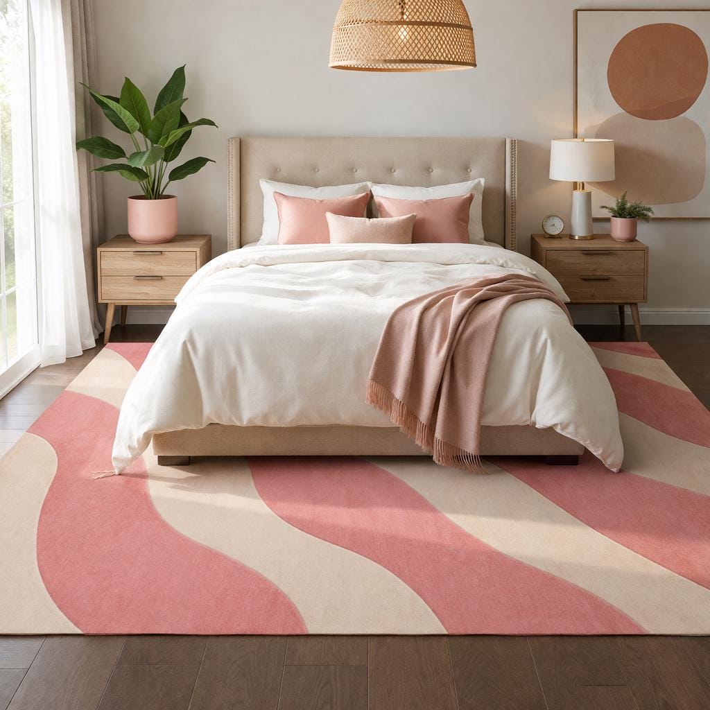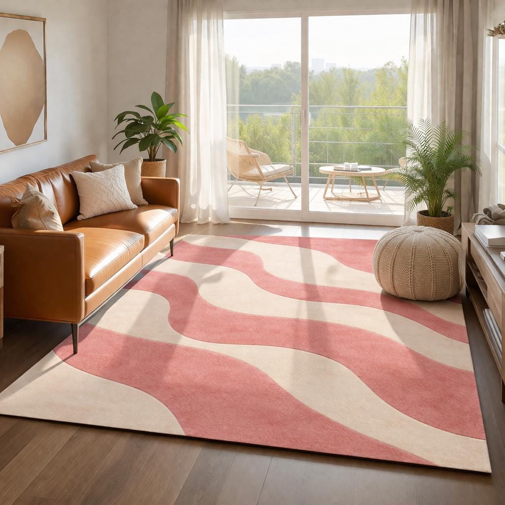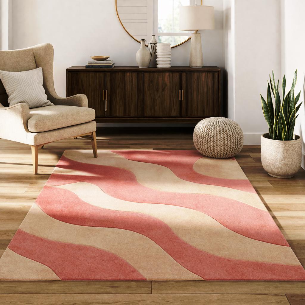 Hand Tufted Wool Rug, Abstract Wavy Pink Beige Area Carpet, Plush Living Room Decor