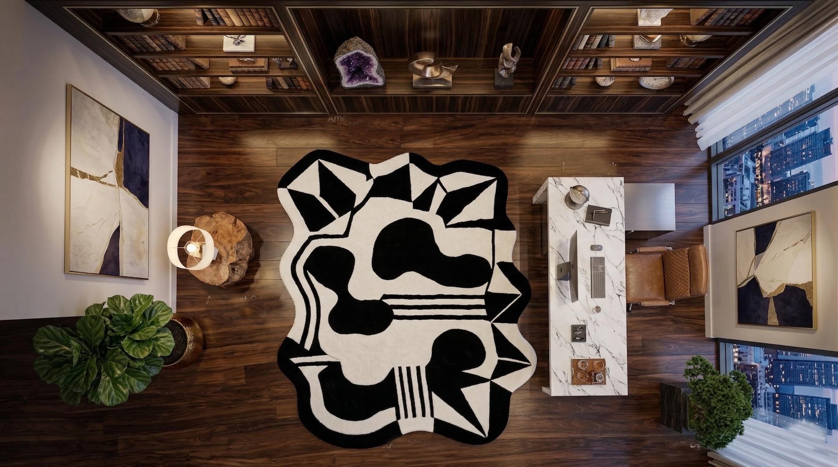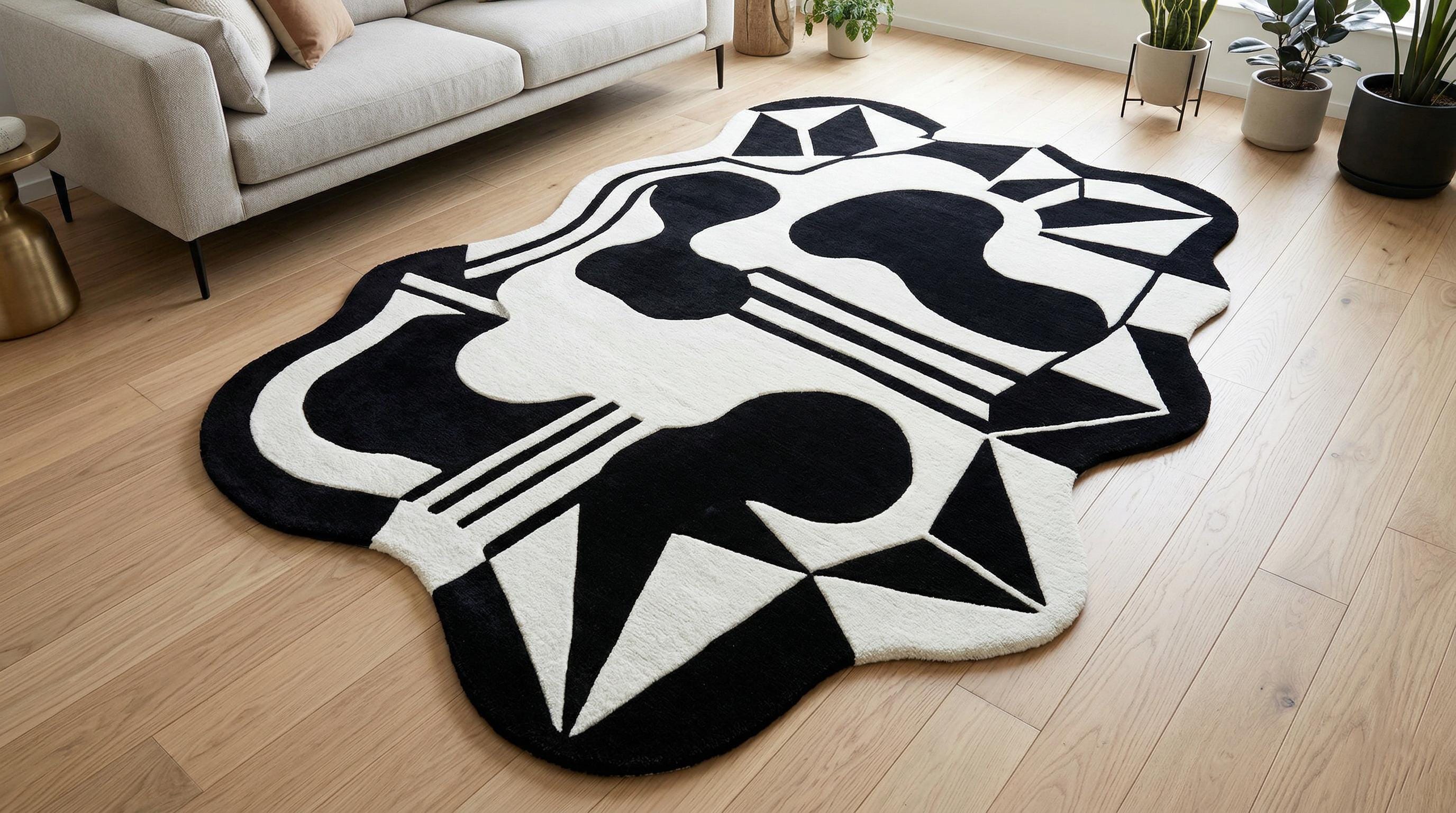 Bring bold elegance into your home with this stunning hand tufted black and white abstract rug. Designed with a unique irregular shape and striking geometric patterns, this rug is a perfect statement piece for modern interiors.